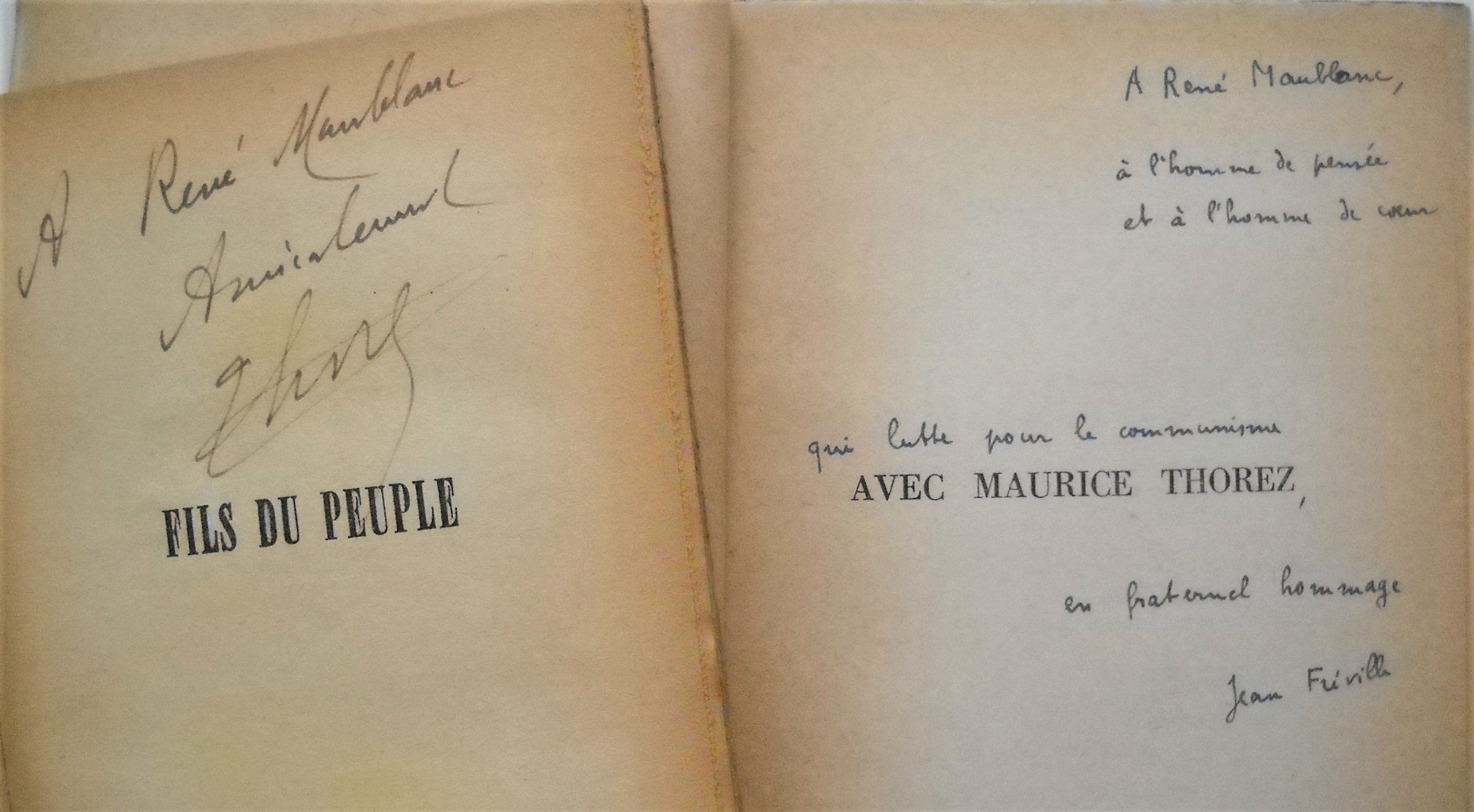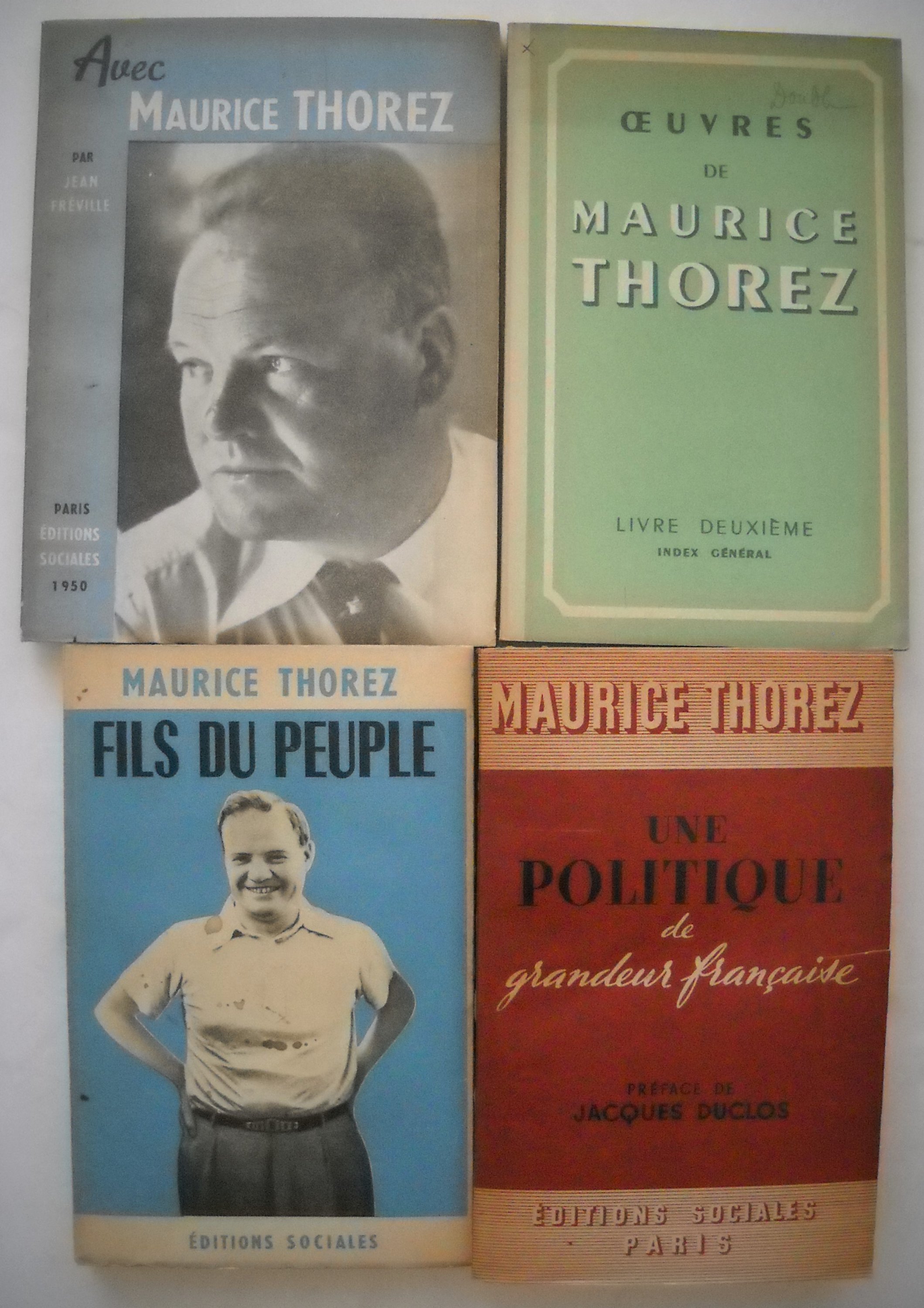 Maurice THOREZ: Une politique de grandeur française, 1945, 384 pages. Ex. S.P. ; Fils du peuple, 2 ex., 1949, 253 pages. Envoi autographe signé. Jean FREVILLE, Avec Maurice Thorez, 1950, 93 pages. Envoi autographe signé. uvres de Maurice Thorez, 4 vol., 1950-1959.