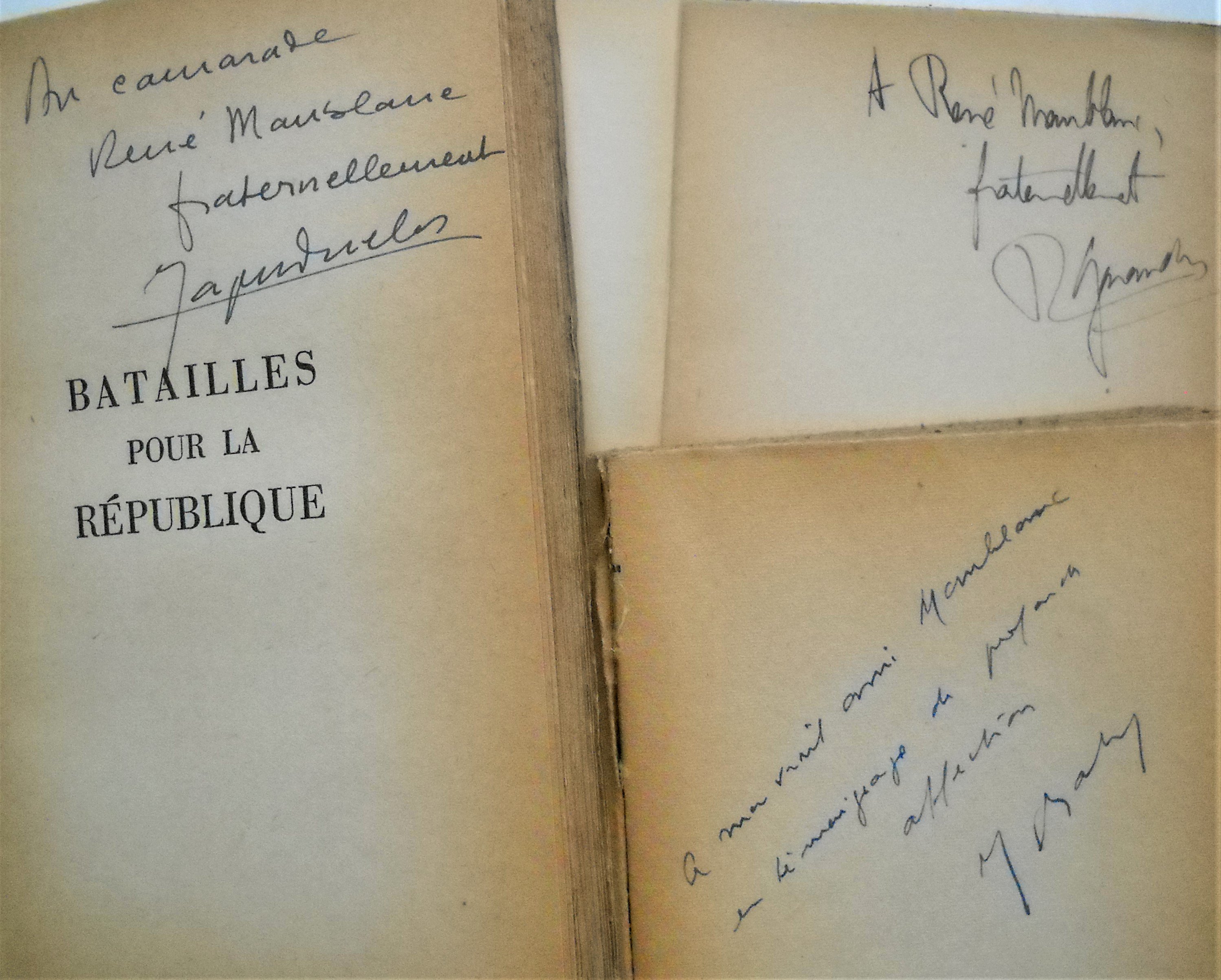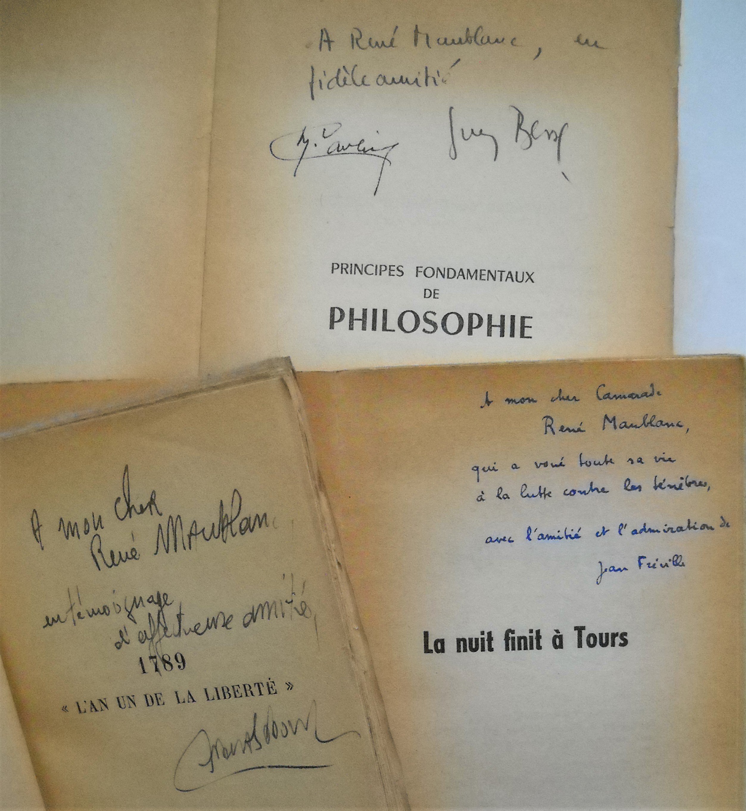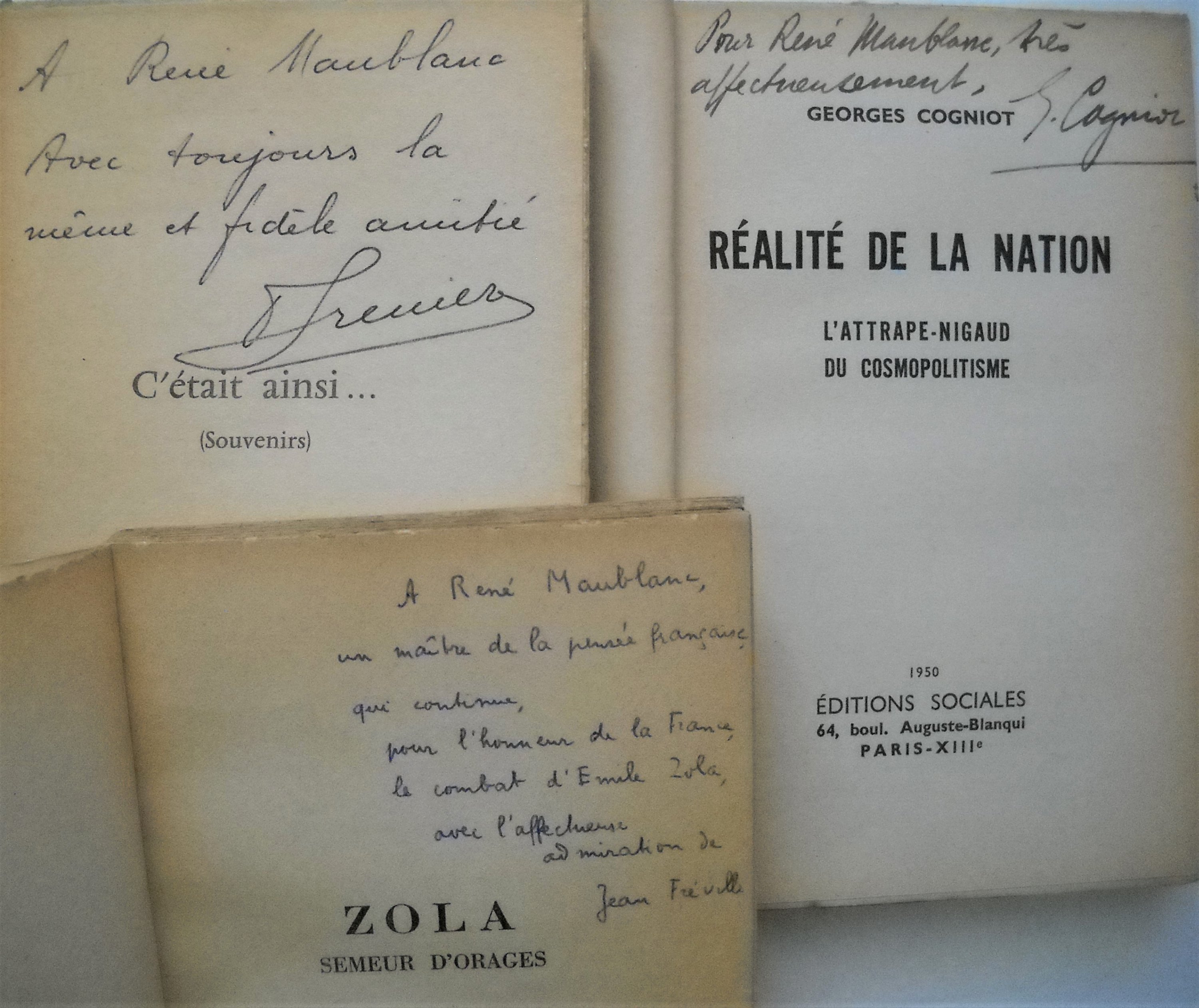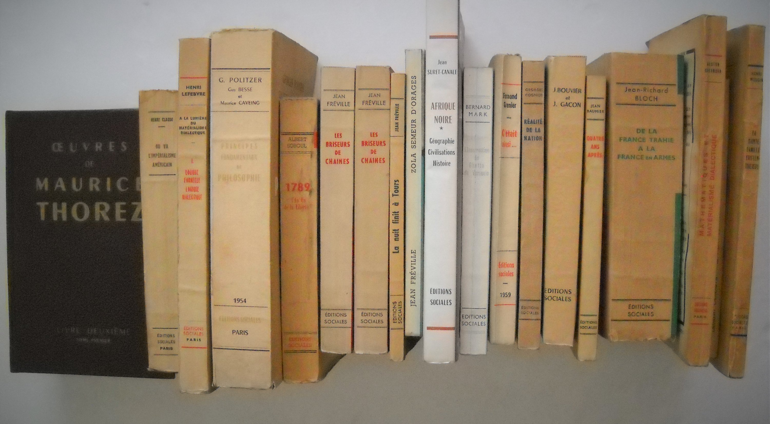 Georges POLITZER, Principes élémentaires de philosophie, 1946, 293 pages. J.B.S. HALDANE, La philosophie marxiste et les sciences, 1946, 244 pages. Histoire du parti communiste (bolchévik) de lU.R.S.S., 1946, 310 pages. Jacques DUCLOS, Batailles pour la République, 2 ex., 1947, 476 pages. Ex. S.P. Envoi autographe signé. Henri MOUGIN, La sainte famille existentialiste, 1947, 181 pages. Henri LEFEBVRE, A la lumière du matérialisme dialectique 1. Logique formelle, logique dialectique, 1947, 291 pages. Envoi autographe signé. Gaston CASANOVA, Mathématiques et matérialisme dialectique, 1947, 196 pages. Envoi autographe signé. Jean LARNAC, La Littérature française daujourdhui, 1948, 203 pages. Envoi autographe signé. Jean FREVILLE: Les briseurs de chaine Cent ans après le manifeste, 2 ex., 1948, 315 pages. Envoi autographe signé. ; La nuit finit à Tours Naissance du parti communiste français, 1951, 156 pages. Envoi autographe signé. ; Zola, semeur dorages, 1952, 162 pages. Envoi autographe signé « A René Maublanc un maître de la pensée française qui continue pour lhonneur de la France, le combat dEmile Zola, avec laffectueuse admiration de » Jean BAUMIER, Quatre ans après de lordre nouveau au pacte atlantique, 1949, 188 pages. Jean BABY, Principes fondamentaux déconomie politique, 1949, 344 pages. Ex. S.P. Envoi autographe signé et daté. Jean-Richard BLOCH, De la France trahie à la France en armes, commentaires à Radio-Moscou. 1949, 554 pages. Ex. S.P. ; Lhomme du communisme, 1949, 62 pages. Laurent CASANOVA, Le parti communiste, les intellectuels et la nation, 1949, 141 pages. Henri CLAUDE, Où va limpérialisme américain, 1950, 355 pages. Envoi autographe signé. Roger GARAUDY, Grammaire de la Liberté, 1950, 158 pages. Envoi autographe signé. Albert SOBOUL, 1789 « lAn Un de la Liberté », 1950, 351 pages. Envoi autographe signé. Georges COGNIOT, Réalité de la nation Lattrape-nigaud du cosmopolitisme, 1950, 192 pages. Envoi autographe signé. E. VARGA et L. MENDELSOHN, Données complémentaires à limpérialisme de Lénine », 1950, 391 pages. Marcel WILLARD, La défense accuse, 2 ex., 1951, 310 pages. Ex. S.P. Envoi autographe signé. Auguste CORNU, Essai de critique marxiste, 1951, 183 pages. Envoi autographe signé. Madeleine RIFFAUD, Les Carnets de Charles Debarge, Editions sociales, 1951, broché in-12, 112 pages. J. BOUVIER et J. GACON, La vérité sur 1939 La politique extérieure de lU.R.S.S. doctobre 1938 à juin 1941, 1953, 322 pages. Envoi autographe signé. Maurice THOREZ et Jean FREVILLE, Karl Marx et Friedrich Engels Sur la littérature et lart, 1954, 411 pages. Envoi autographe signé. Georges POLITZER, Guy BESSE et Maurice CAVEING, Principes fondamentaux de philosophie, 1954, 532 pages. Envois autographes signés. Germaine et Claude WILLARD, Formation de la nation française (du Xe siècle au début du XIXe siècle), 1955, 311 pages. Envoi autographe avec signatures. Livre blanc sur le procès du parti communiste allemand, 1956, 221 pages. 2 ex. Extrait du livre blanc sur le procès communiste allemand, 31 pages Gilbert BADIA, La fin de la République allemande, 1958, 134 pages. J. SURET-CANALE, Afrique noire, géographie, civilisations, histoire, 1958, 280 pages. Envoi autographe signé. Fernand GRENIER, Au pays de Staline, 1950, 252 pages ; Cétait ainsi