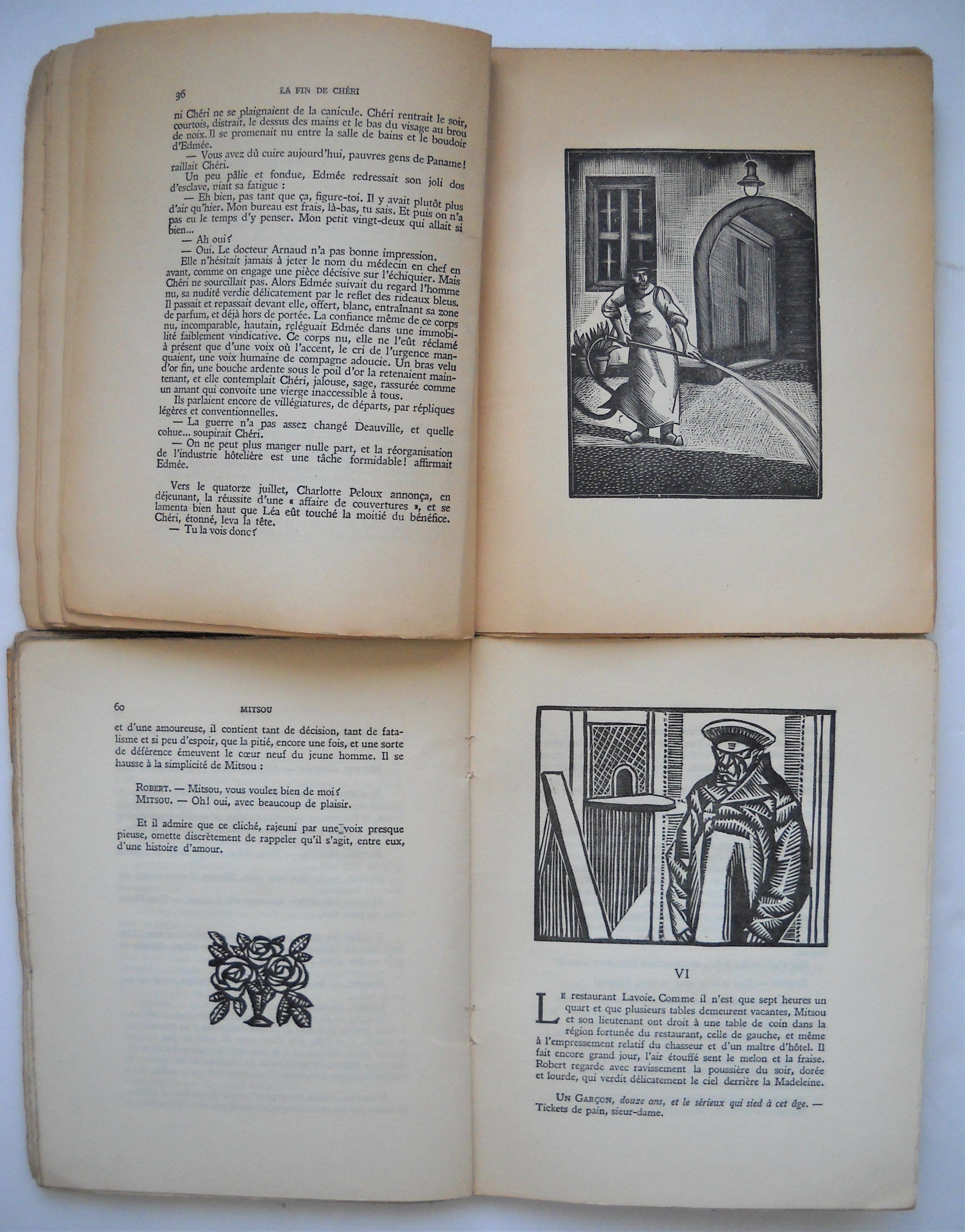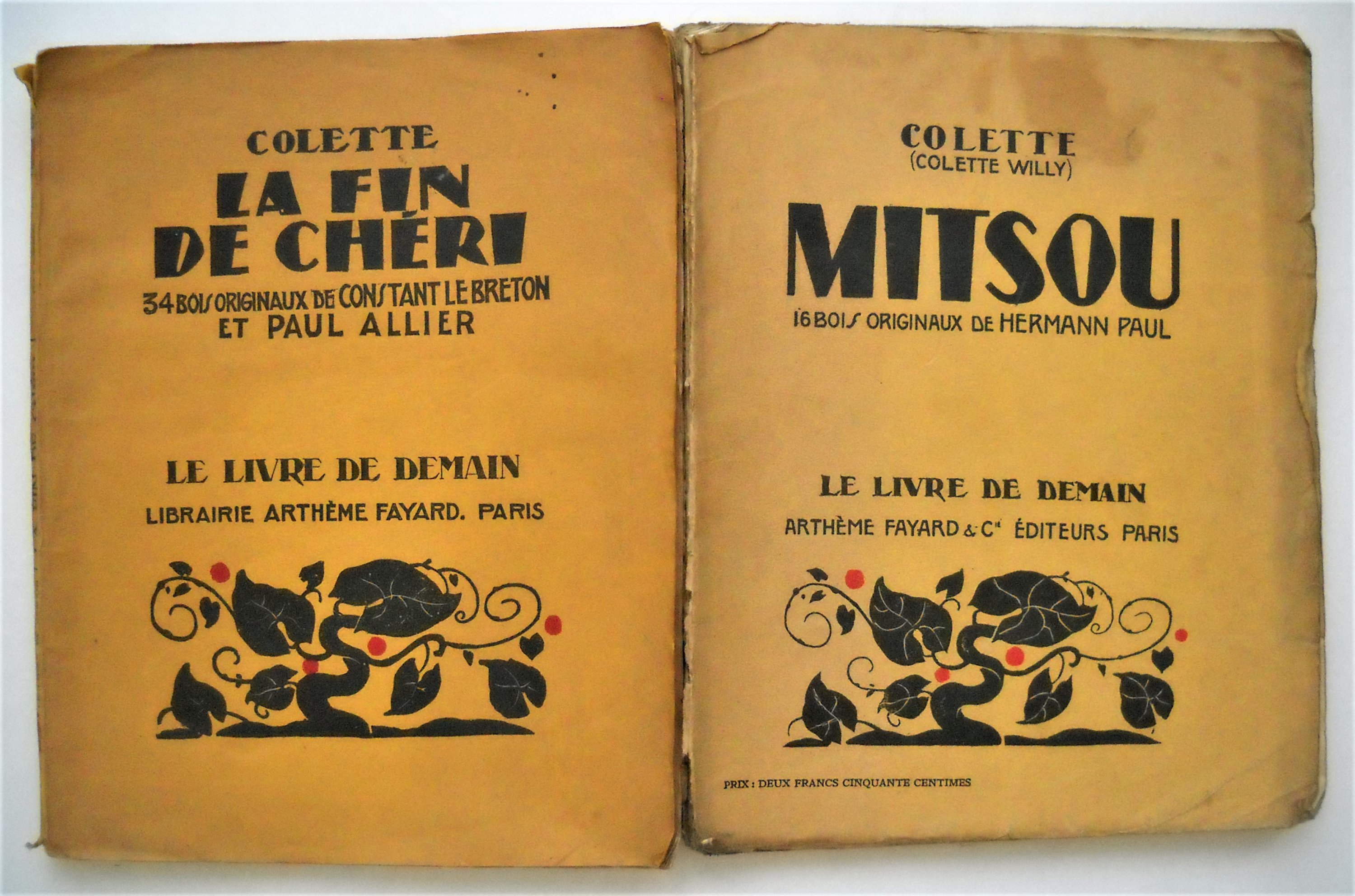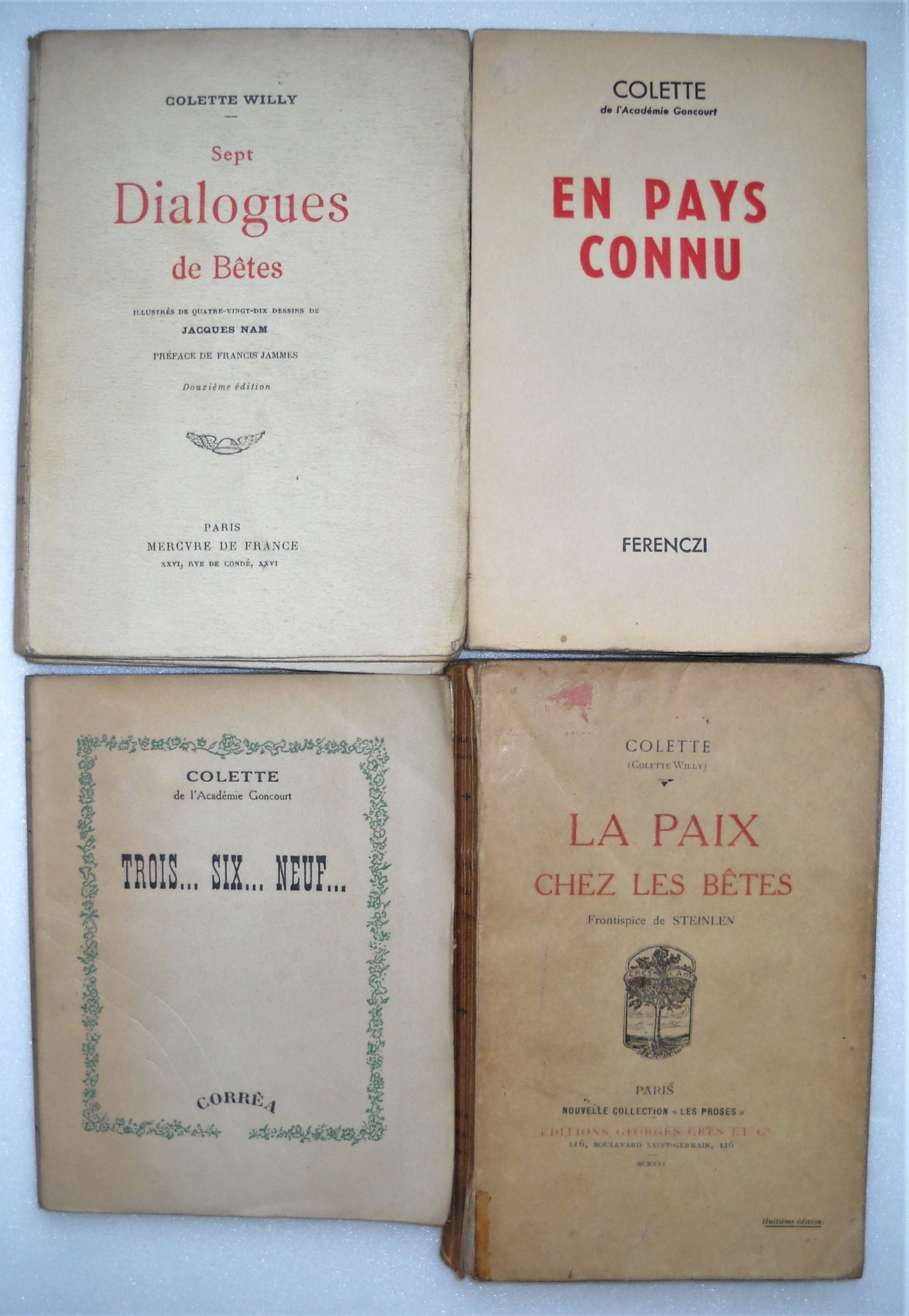 Sept dialogues de bêtes, ill. de 90 dessins de Jacques NAM, Paris, Mercure de France, 1913, br. in-8, 181 pages. La paix chez les bêtes, frontispice de STEINLEN, Paris, Editions Georges Grès, 1916, br. in-12, 242 pages. La Maison de Claudine, J. Ferenczi et fils, Paris, 1922, br. in-12, 252 pages La fin de chéri, 34 bois originaux de Constant LE BRETON et Paul ALLIER, Le livre de Demain, 1938, br. in-8, 125 pages. Trois