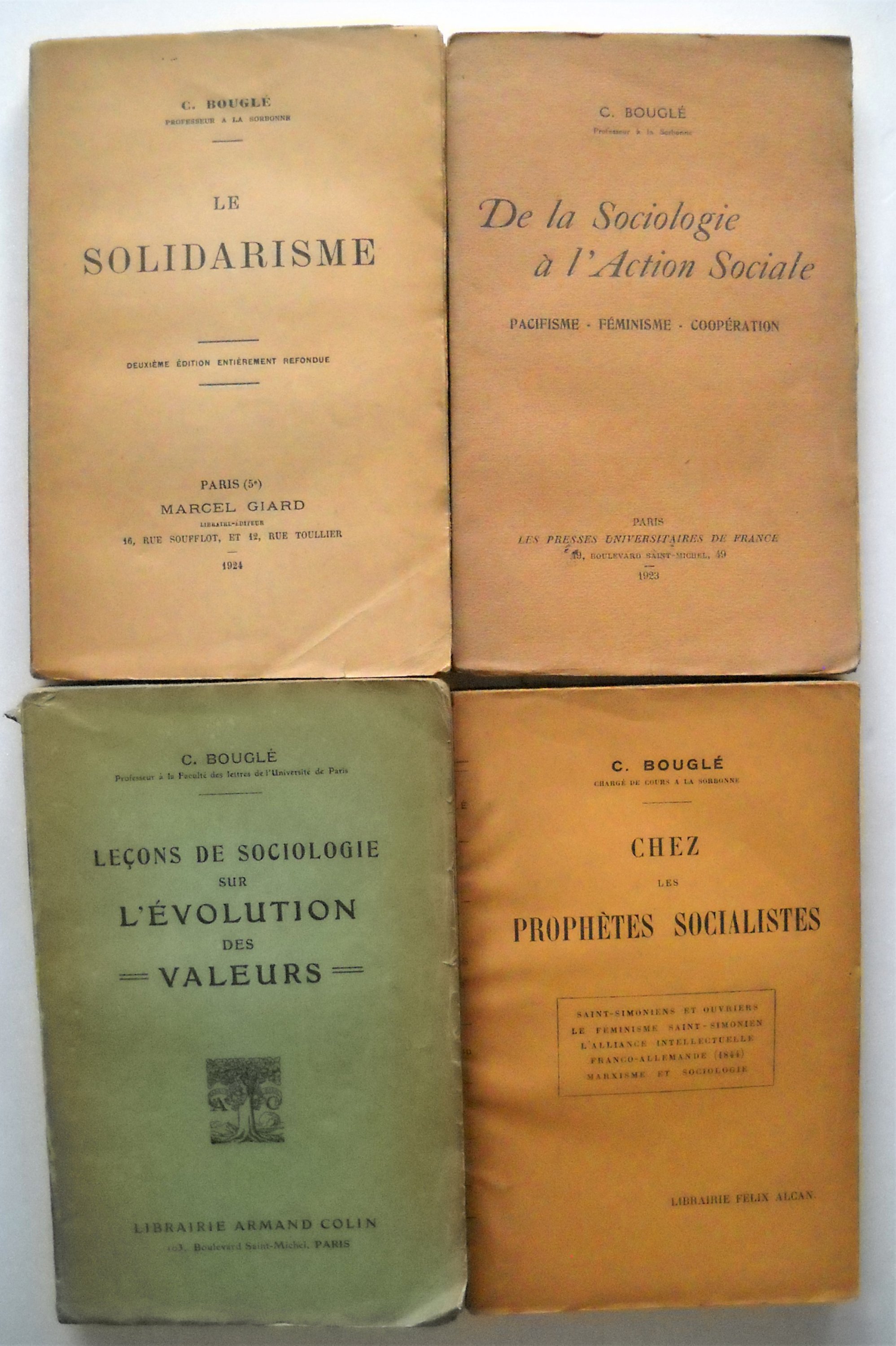 Chez les prophètes socialistes, Librairie Félix Alcan, 1918, br. in-12, 246 pages. Envoi autographe signé. Leçons de sociologie sur lévolution des valeurs, Armand Colin, Paris, 1922, br. in-12, 286 pages. Envoi autographe signé. Léducateur laïque, Paris, F. Rieder et Cie, 1921, br. in-12, 88 pages. Envoi autographe signé. Le guide de létudiant en sociologie, Publications du centre de documentation sociale (ENS), Paris, Librairie Garnier Frères, 1921, br. in-8, 65 pages. Envoi autographe signé. De la sociologie à lAction sociale Pacifisme, féminisme, coopération, Paris, P.U.F., 1923, 131 pages. Envoi autographe signé. Le solidarisme, Paris, Marcel Girard, 1924, br. in-12, 204 pages. Envoi autographe signé et daté. Socialismes français, coll. Armand Colin, 1932, br. in-12, 200 pages. Envoi autographe signé. Un moraliste laïque, Ferdinand Buisson, Librairie Félix Alcan, 1933, br. in-12, 192 pages. Envoi autographe signé. Bilan de la sociologie française contemporaine, Librairie Félix Alcan, 1935, br. in-12, 169 pages. Envoi autographe signé.