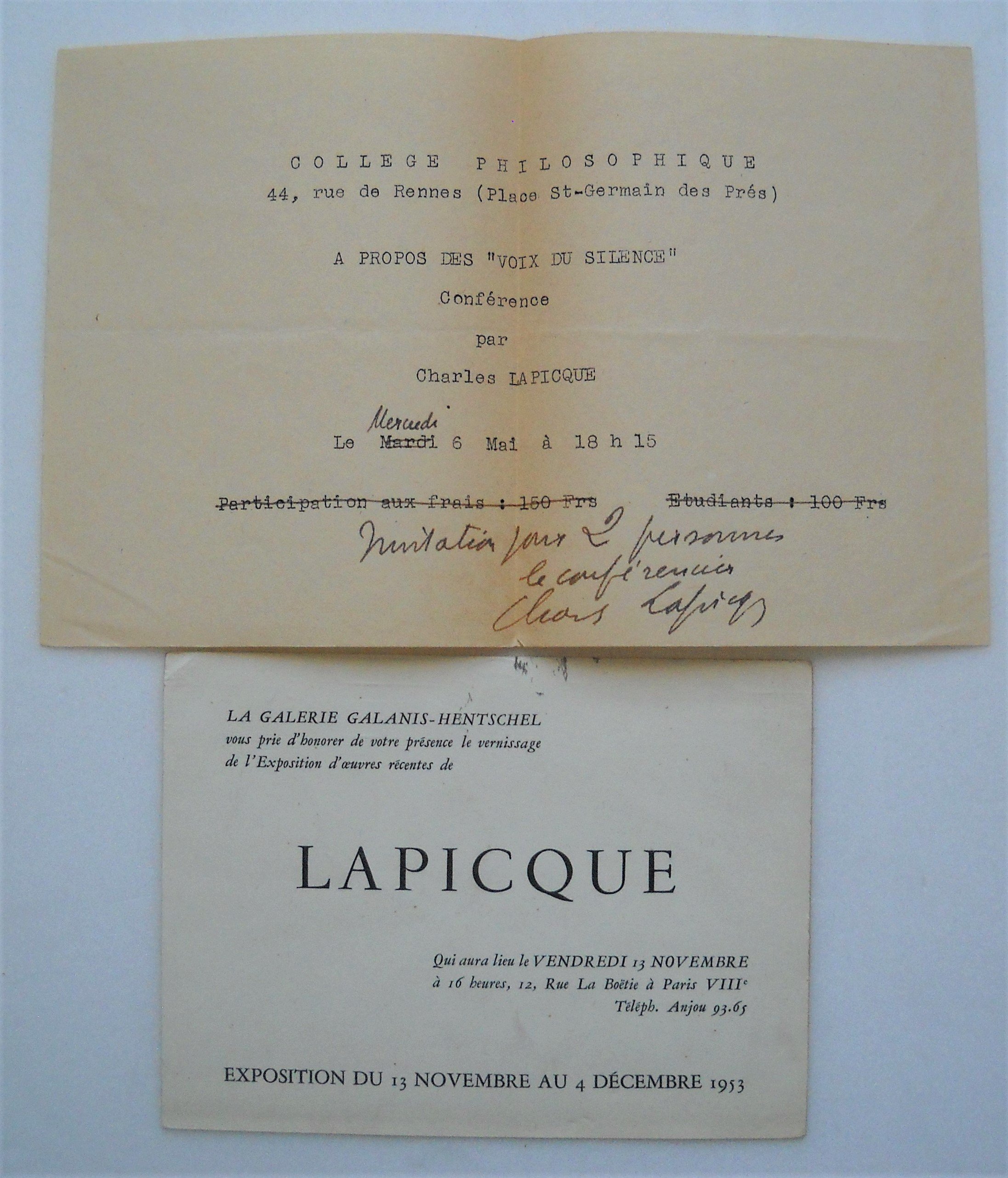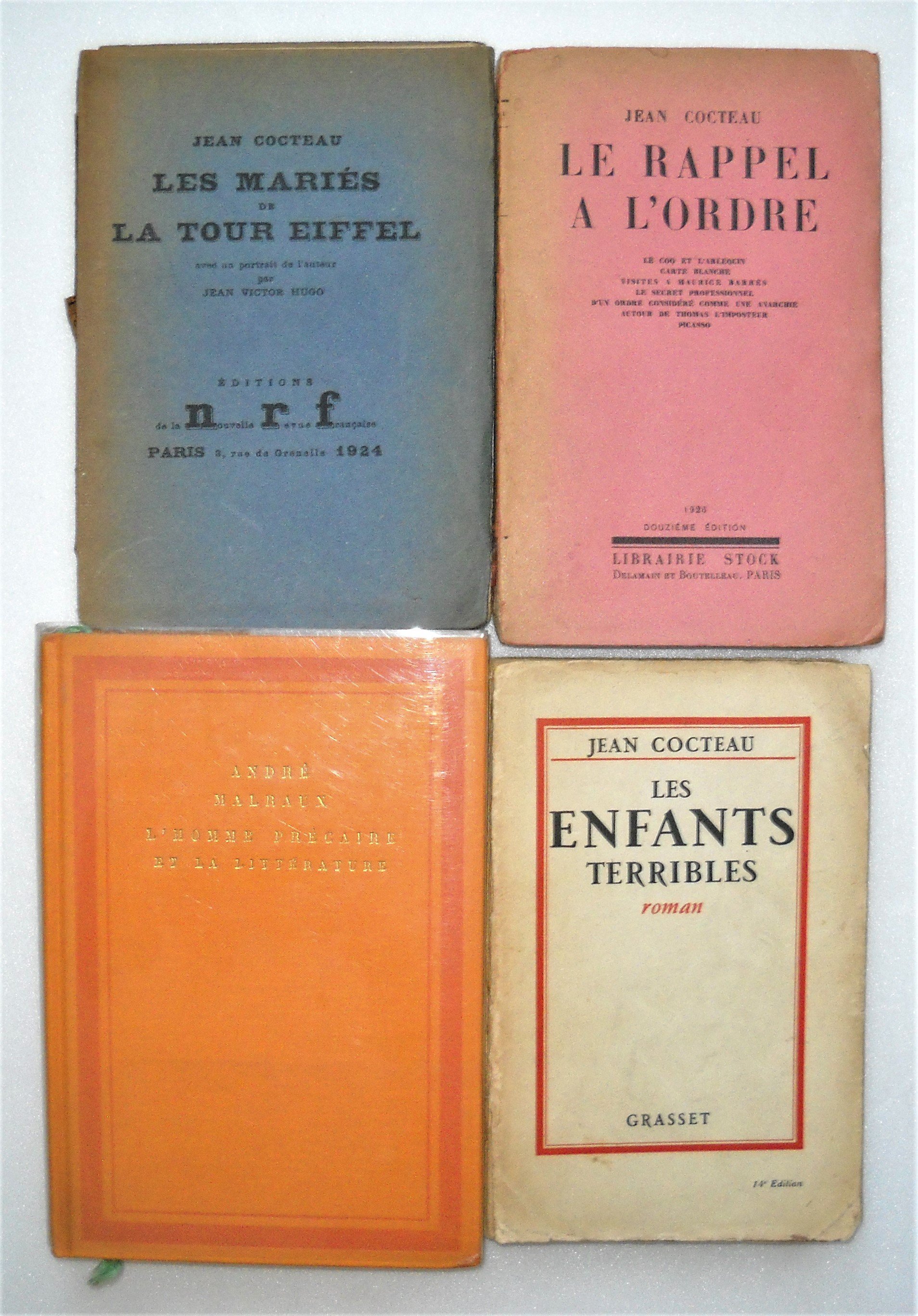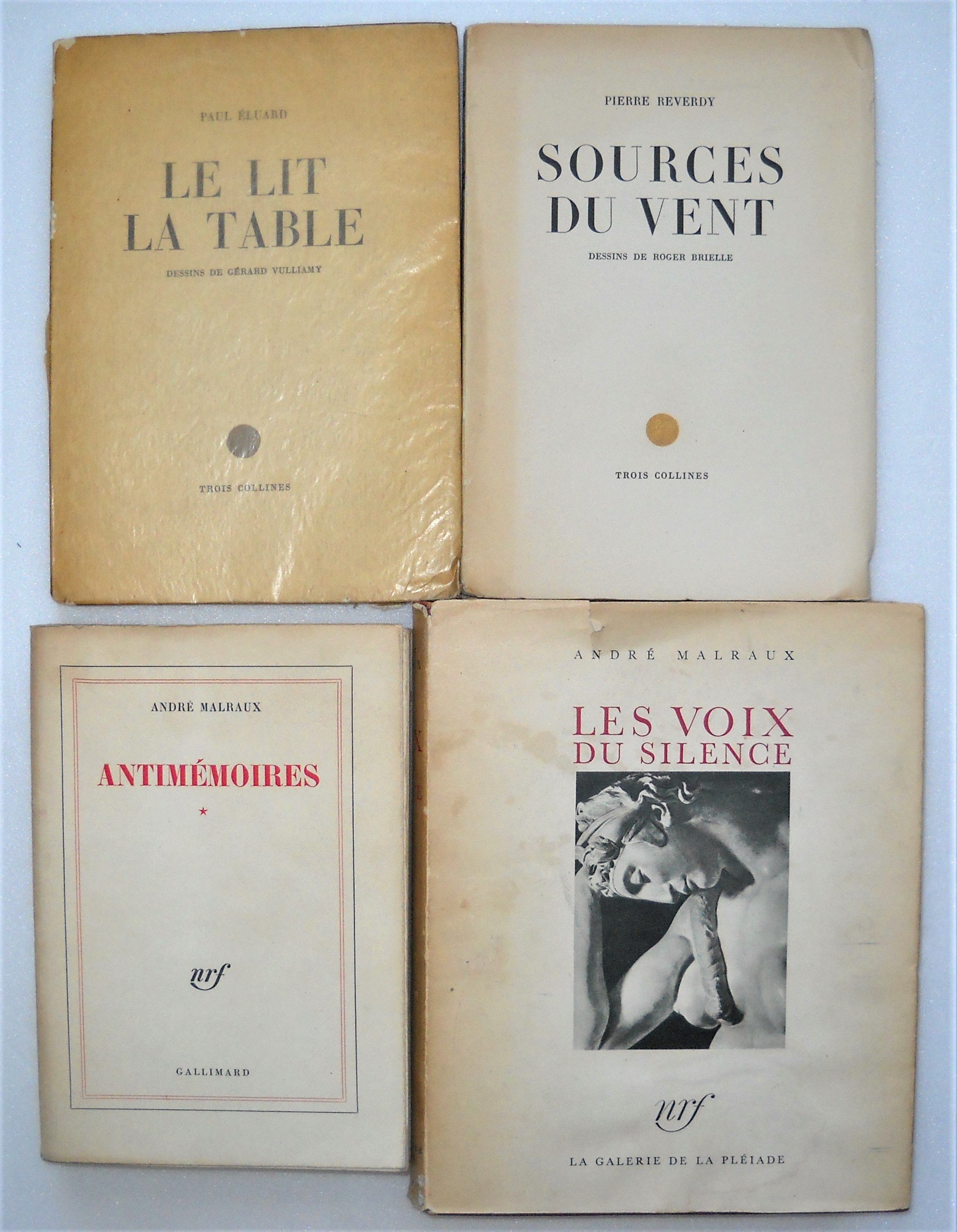 André MALRAUX: Les voix du silence, N.R.F. La Galerie de la pléiade, 1952, in-4 rel. simili-cuir, jaquette, 657 pages. Reproduction dun dessin de Charles Lapicque collé en frontispice. Joint invitation à propos des « voix du silence » conférence par Charles Lapicque, avec annotation et signature autographe de Lapicque ; Antimémoires, N.R.F., Gallimard, 1967, br. in-8, 605 pages ; Lhomme précaire et la littérature, Gallimard, 1977, in-8 rel. fine toile, 330 pages. Jean COCTEAU: Les mariés de la Tour Eiffel, Editions N.R.F., 1924, br. in-12, 66 pages (couv. en létat) ; Le rappel à lordre, Delamain et Bouteilleau, Paris, 1926, br. in-12, 296 pages ; Les enfants terribles, Bernard Grasset, 1929, br. in-12, 228 pages (en létat). Paul ELUARD, Le Lit, La table, dessins de Gérard Vulliamy, Editions des Trois collines, Genève, 1946, br. in-8, 95 pages. Ex. n°412/1000 sur vergé crème (couv. déchirée) Pierre REVERDY, Sources du vent, dessins de Roger Brielle, Editions des Trois collines, Genève, 1946, br. in-8, 125 pages. Ex. n°222/2000 sur vélin. Joint: Collectif, Guirlande dAragon privé de ses droits civiques, Editions Réclame, 1949, plaquette in-8, [18] pages.
