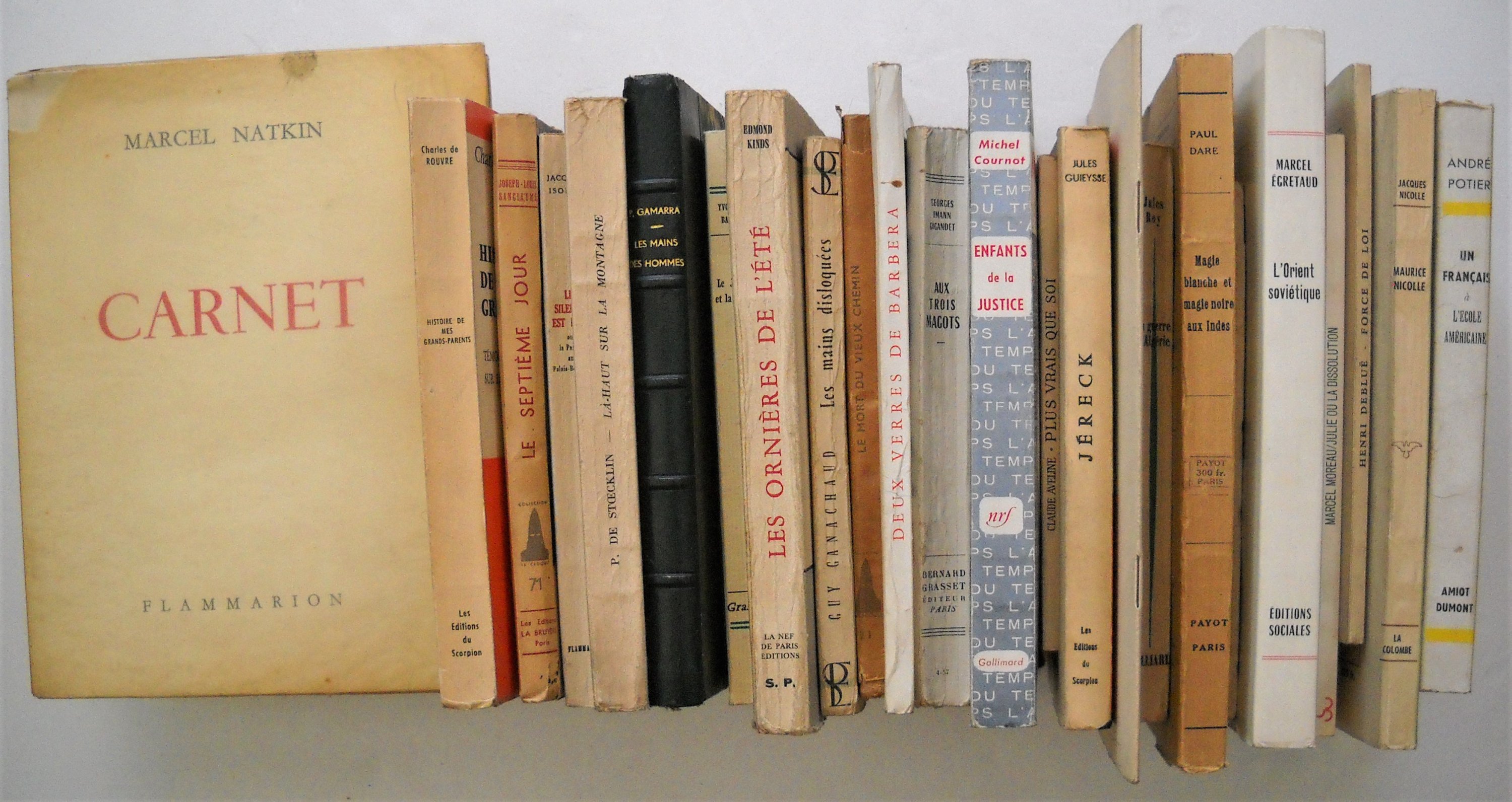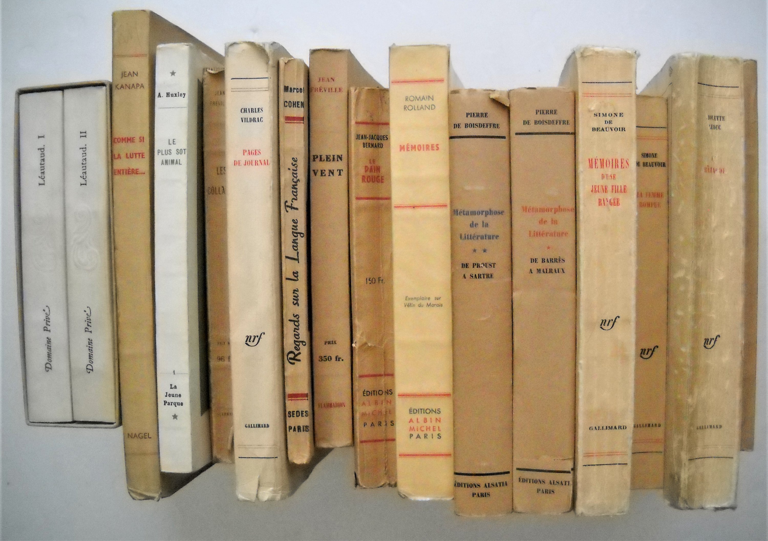 ». Charles VILDRAC: La colonne (lile rose), Albin Michel, 1947, br. in-8, 251 pages ; Le jardinier de Samos Comédie en trois actes suivie de Les Pères Ennemis, Editions Raisons dEtre, 1947, br. in-12, 141 pages. Envoi autographe signé. ; Daprès lécho, Editions Albin Michel, 1949, br. in-12, 248 pages. Envoi autographe signé. ; Pages de journal 1922-1966, N.R.F., Gallimard, 1968, br. in-8, 283 pages. Marcel COHEN, Regards sur la langue française, SEDES, Paris, 1950, br. in-12, 142 pages. Envoi autographe signé et daté. Pierre de BOISDEFFRE: Métamorphose de la littérature De Barrès à Malraux, Métamorphose de la littérature De Proust à Sartre, 2 tomes, Editions Alsatia, Paris, 1951, br. in-12, 357 + 402 pages. Envoi autographe signé. André POTIER, Un français à lécole américaine, Amiot Dumont, Paris, 1952, br. in-8, 268 pages. Pierre GAMARRA, Les mains des hommes, ill. de Marc Saint Saëns, Les Amis du livre progressiste, Genève, 1953, rel. in-8, 201 pages. Envoi autographe signé. Paul LEAUTAUD, Journal particulier, 2 tomes, Editions du Cap, Monte-Carlo, 1956, br. in-12 carré, 240 et 276 pages. Sous étui d'origine cartonné. Ex. H.C. n°2675. Édition originale du journal érotique. Romain ROLLAND, Mémoires, Albin Michel, 1956, br. in-8, 333 pages. Ex. sur vélin du Marais n°70. Jacques NICOLLE, Maurice Nicolle (1862-1932) un homme de la Renaissance à notre époque, La Colombe, 1957, br. in-8, 171 pages. Envoi autographe signé et daté. Jacques ISORNI, Le silence est dor ou la parole au Palais-Bourbon, Flammarion, 1957, br. in-12, 200 pages. Ex. S.P. Envoi autographe signé. Georges IMANN-GIGANDET, Aux trois magots, Grasset, 1957, br. in-12, 250 pages. Ex. S.P. Envoi autographe signé et daté. Marcel NATKIN, Carnet, Flammarion, 1957, br. in-4, 101 pages. Edmond KINDS: Deux verres de Barbera, Editions la Nef de Paris, 1955, br. in-8, 87 pages. Envoi autographe signé et daté. ; Les ornières de lété, La Nef de Paris édit., 1957, br. in-8, 222 pages. Envoi autographe signé et daté. André BELLIVIER, Henri Poincaré et Paul Valéry autour de 1895, 1957, plaquette in-8, 11 pages. Guy GANACHAUD, Les mains disloquées, SPES, Paris, 1958, br. in-12, 133 pages. Ex. S.P. Envoi autographe signé. Paul de STOECKLIN, Là-haut sur la montagne, Les éditions du Sablier, 1958, br. in-8, 113 pages. Ex. S.P. Envoi autographe signé. Joint L.A.S., 1 page in-8: « Je vous envoie sur le conseil dun ami commun, René Arcos, qui est mon éditeur, mon liv. Là-Haut sur la montagne. Il sagit dune sorte de conte de fées pour grandes personnes, la fantaisie dun vieillard qui sefforce de vivre en dehors des ignominies, des écurements de lheure présente. (