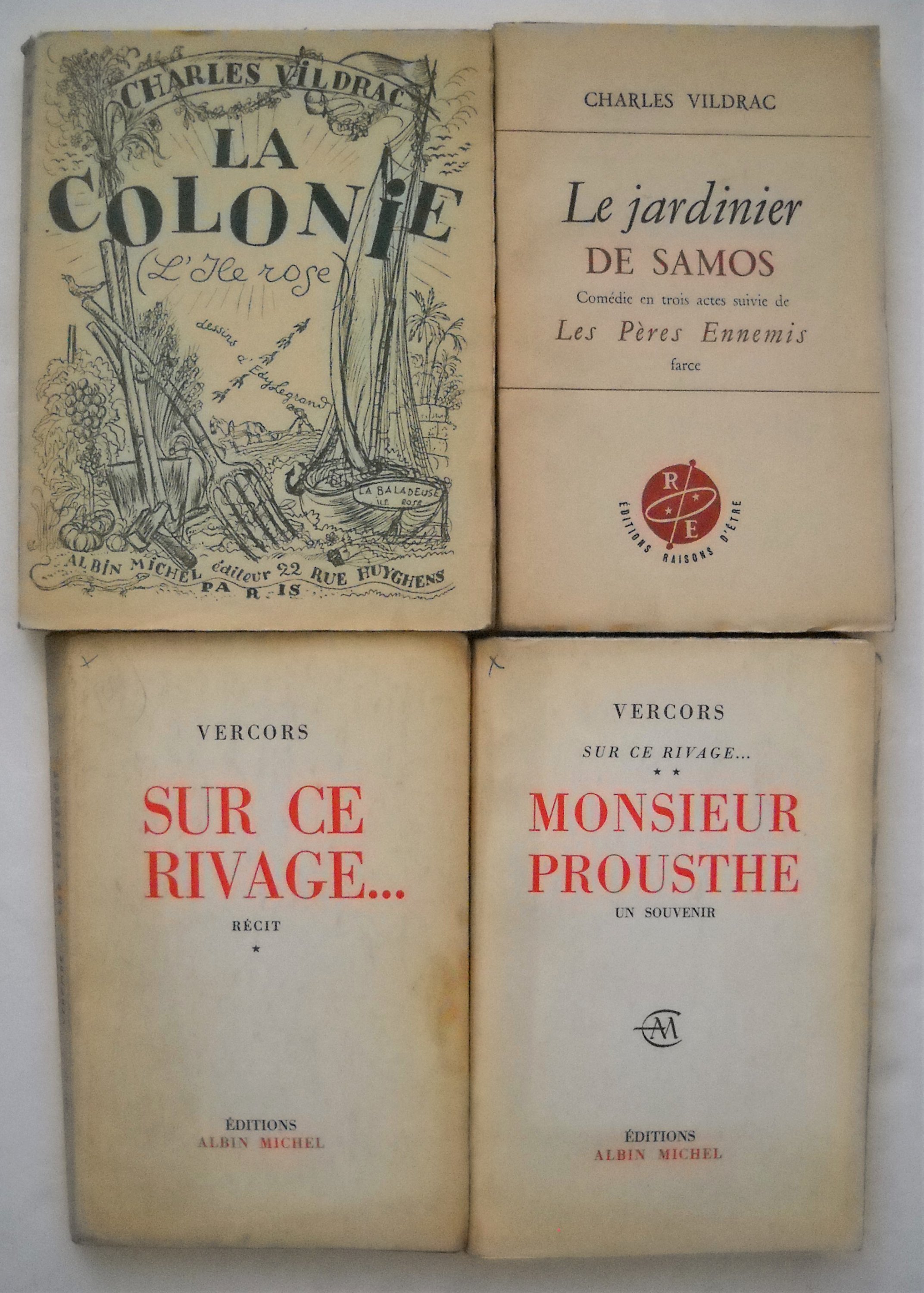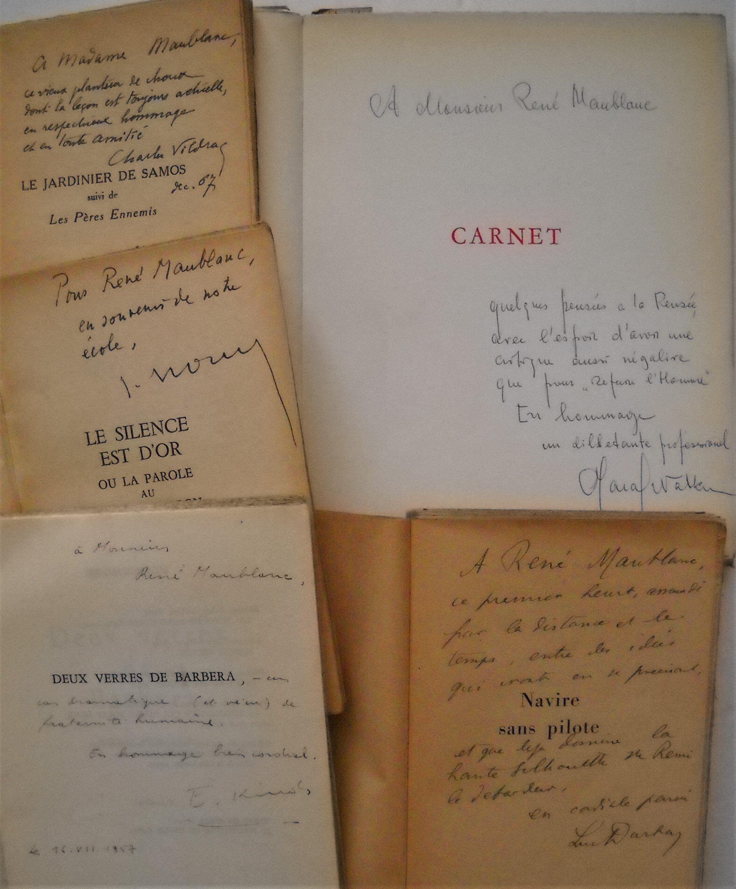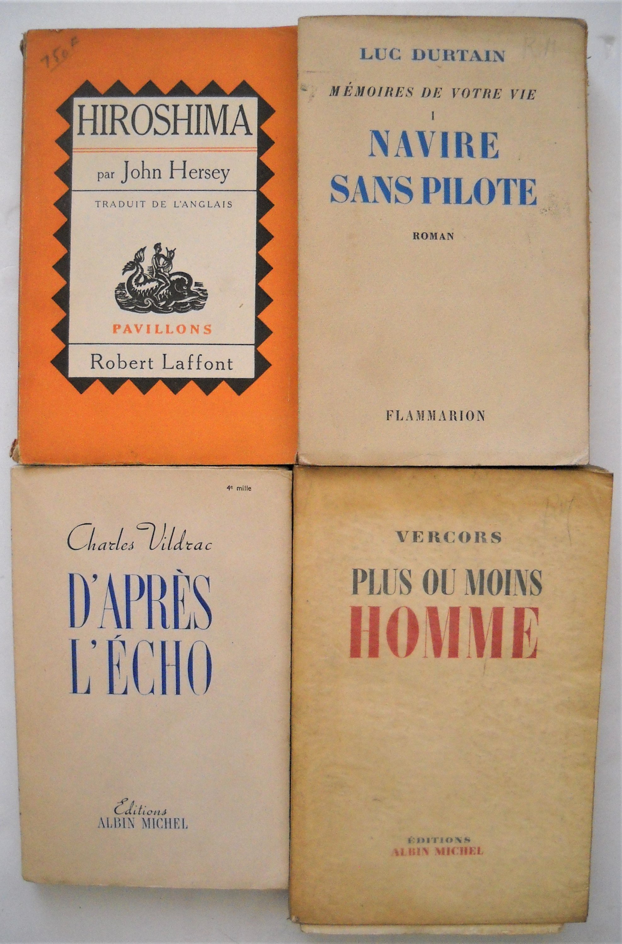 , Editions Nagel, 1946, br. in-8, 327 pages. Ex. S.P. Envoi autographe signé. Claude AVELINE, Plus vrais que soi, les rapports du romancier et de ses personnages, avec un portrait de lauteur par Berthold Mahn, Coll. esthétique Savel, 1947, br. in-12, 62 pages. Ex. sur hélio Johannot n°333. Envoi autographe signé. Paul DARE, Magie blanche et magie noire aux Indes, Payot, Paris, 1947, br. in-8, 191 pages. Jean-Jacques BERNARD, Le pain rouge, Editions Albin Michel, 1947, br. in-12, 227 pages. Ex. S. P. Envoi autographe signé. Jacques NICOLLE, Louis Pasteur, pour lavenir de la science française, Editions Raisons dêtre, 1947, br. in-12, 90 pages. Envoi autographe signé. Luc DURTAIN, Mémoires de votre vie I: Navire sans pilote, Flammarion, 1947, br. in-12, 421 pages. Ex. S.P. Envoi autographe signé « A René Maublanc ce premier heurt, amoindri par la distance et le temps, entre des idées qui iront en se précisant, et que déjà domine la haute silhouette de Rémi le débardeur en cordiale pensée ». John HERSEY, Hiroshima, Robert Laffont, 1947, br. in-12, 196 pages. Jean BRULLER dit VERCORS, Plus ou moins homme, Editions Albin Michel, 1950, br. in-8, 382 pages. Envoi autographe signé. ; Sur ce rivage