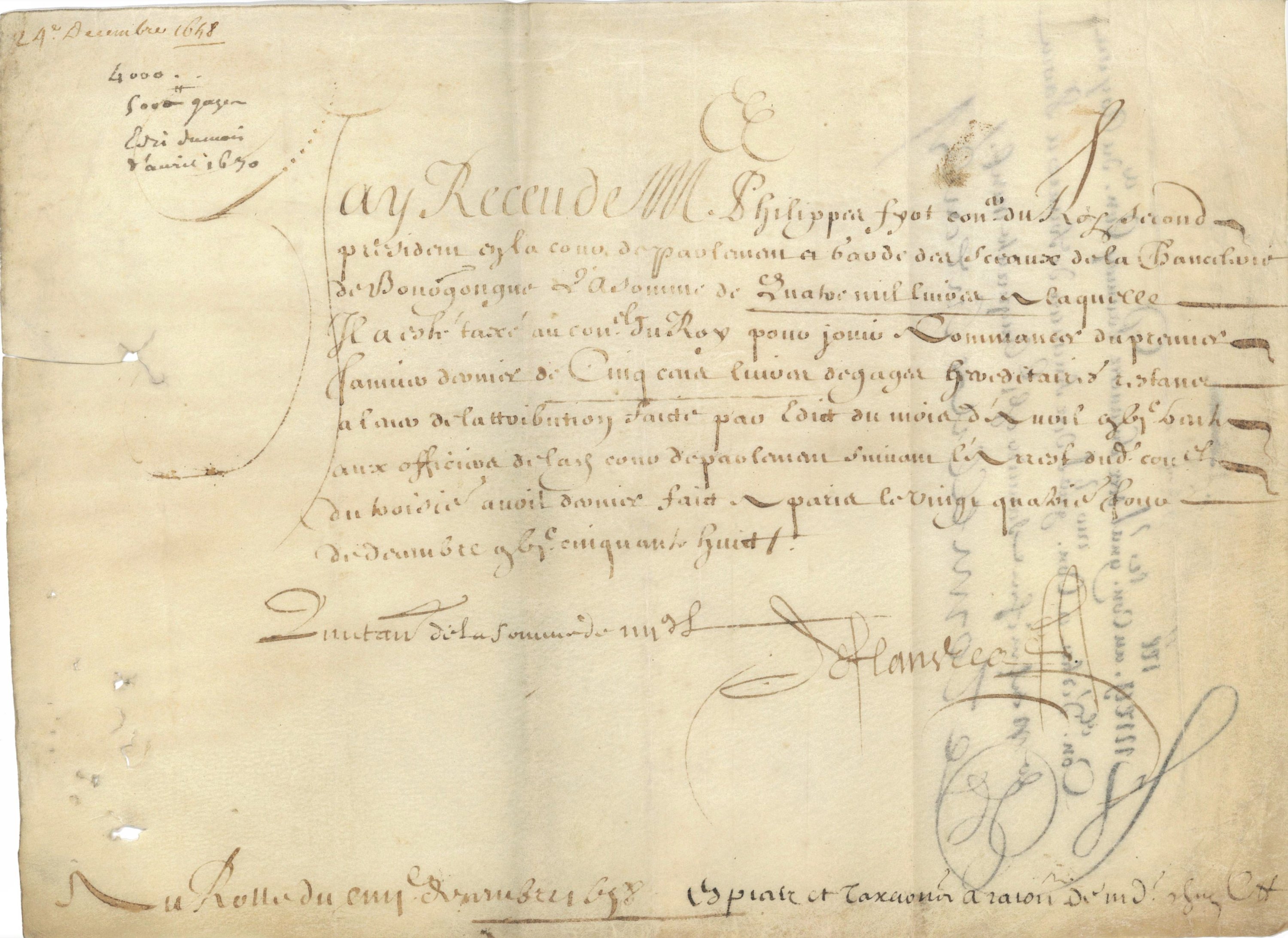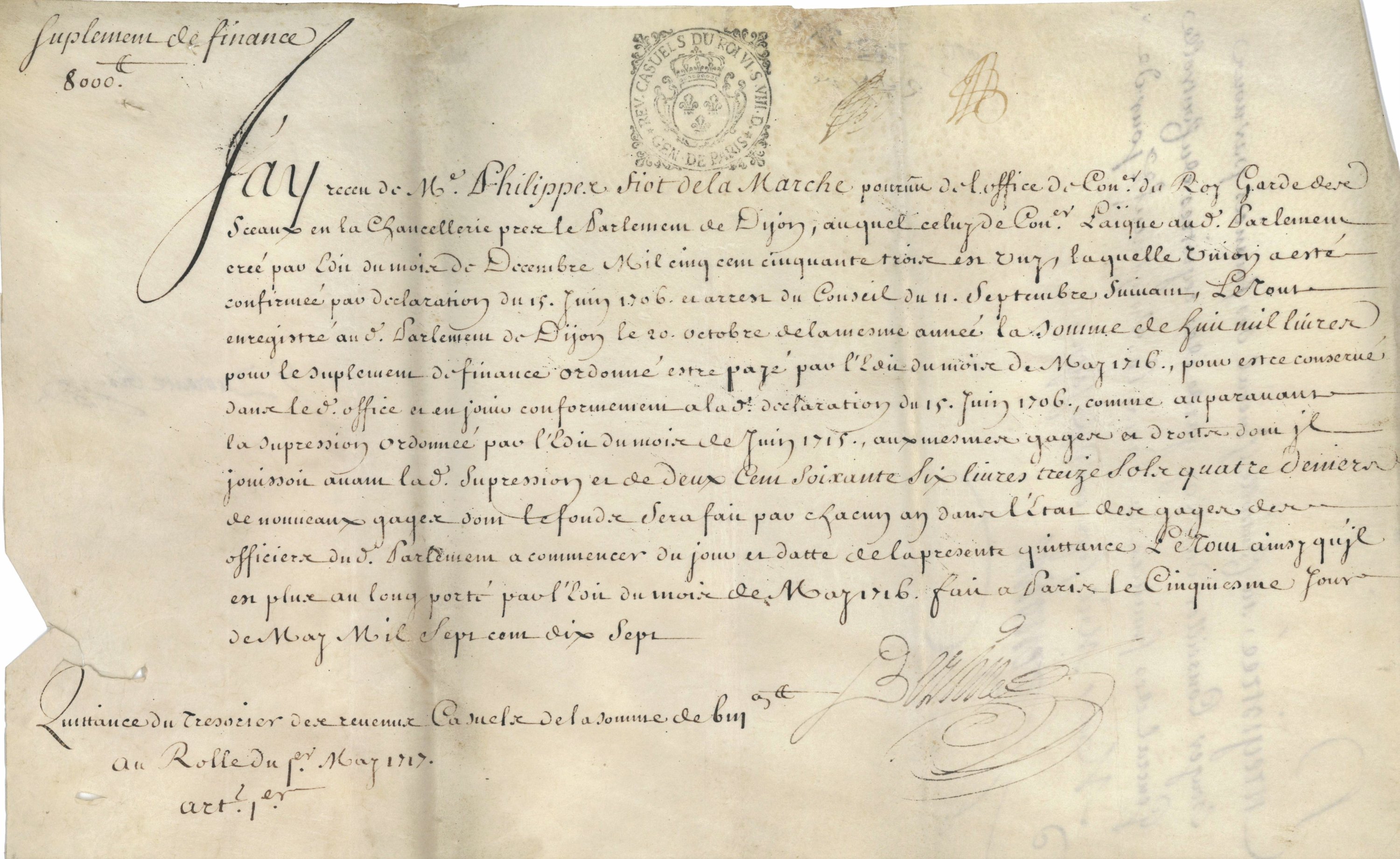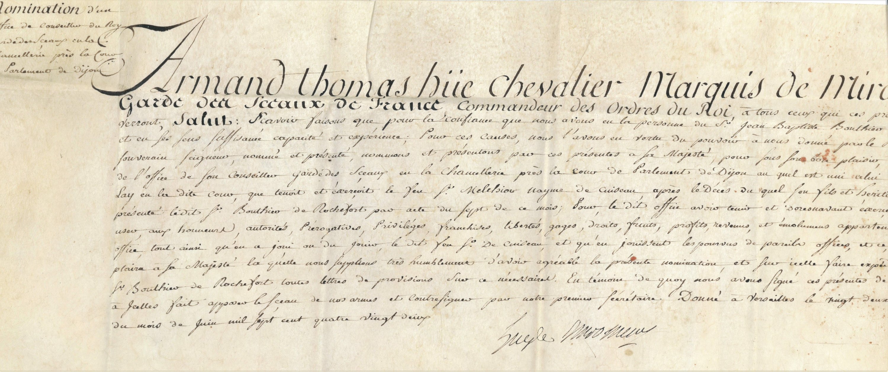 Lettres de provision délivrées à Me François Blondeau, conseiller du roi et garde des sceaux au parlement de Bourgogne, 8 mars 1595 6 P.S., Paris, 1658-1757, par les intendants du roi et trésoriers généraux des revenus casuels et deniers extraordinaires ; quittances délivrées à Philippe et Jacques Fyot de la Marche, et Claude Varenne de Longvoy, pourvus de loffice de conseiller du roi, garde des sceaux en la chancellerie près le parlement de Dijon Extrait du conseil détat du roi contresigné par Louis III Phélipeaux de Pontchartrain (1705-1777), chancelier et garde des sceaux des Ordres, 29 mars 1757 Quittance délivrée par le contrôleur au marc dor à Melchior Nayme sieur de Cuiseau pour le droit de marc dor de loffice de conseiller du roi et garde des sceaux au parlement de Bourgogne, 20 septembre 1776 P.S., Versailles, 22 juin 1782, Armand Thomas HUE de MIROMESNIL (1723-1796), garde des Sceaux de France, parchemin oblong ; nomination de Jean-Baptiste Bouthier de Rochefort à loffice de conseiller du roi garde des sceaux en la chancellerie près la cour de parlement de Dijon.