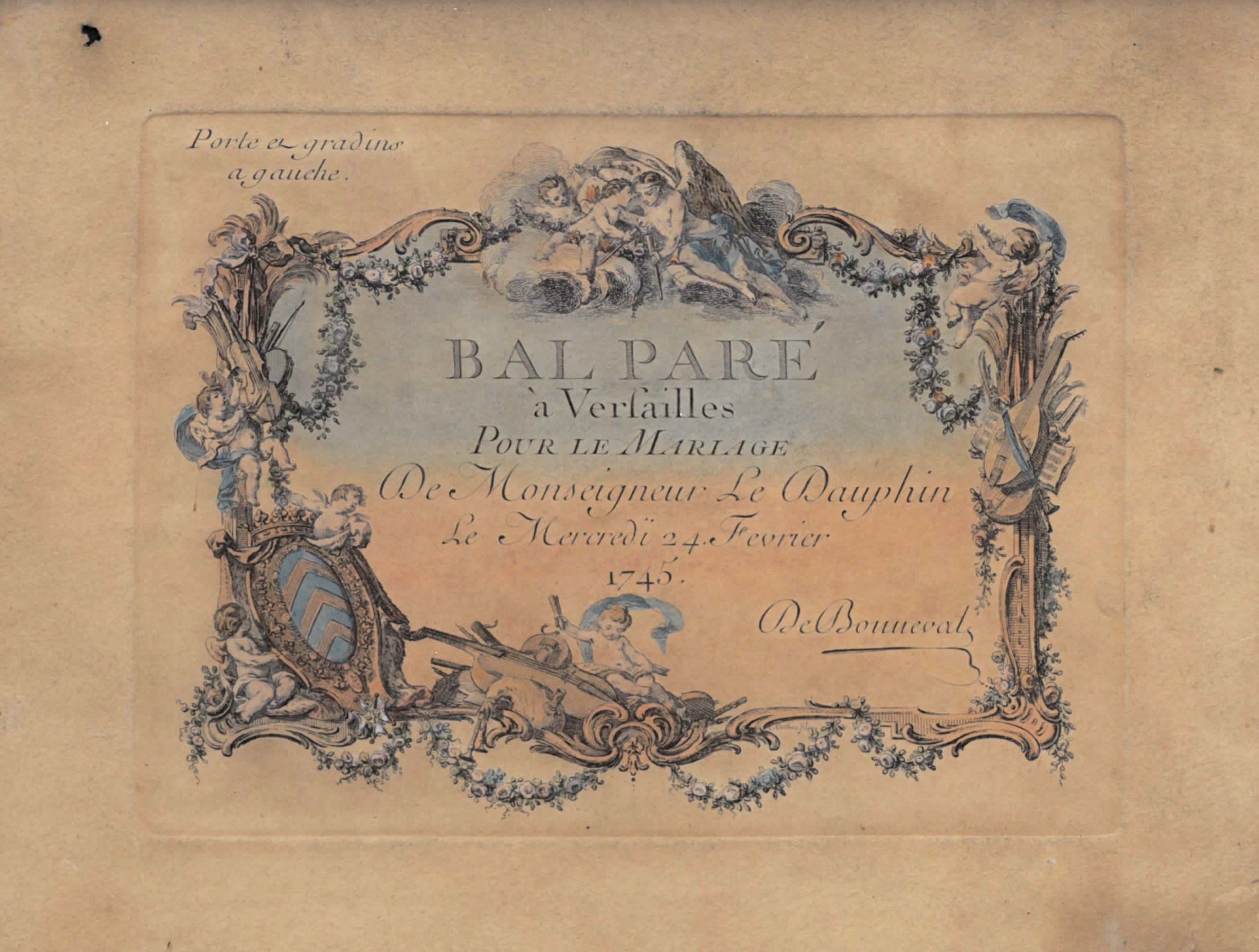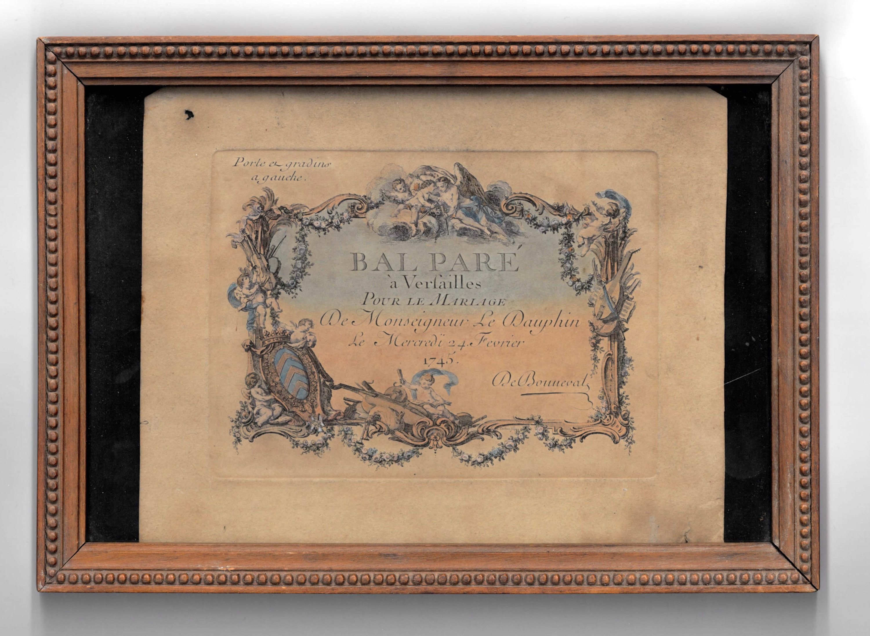 Carton d'invitation gravé du Bal Paré, donné à Versailles à l'occasion du mariage de Monseigneur le prince Louis, dit le Grand Dauphin (1729-1765), fils aîné du roi Louis XV, avec sa cousine l'infante Marie-Thérèse de Bourbon (1726-1746), le mercredi 24 février 1745. Portes et gradins à gauche. Eau forte rehaussée en couleurs. Sous cadre, 20 x 28 cm.