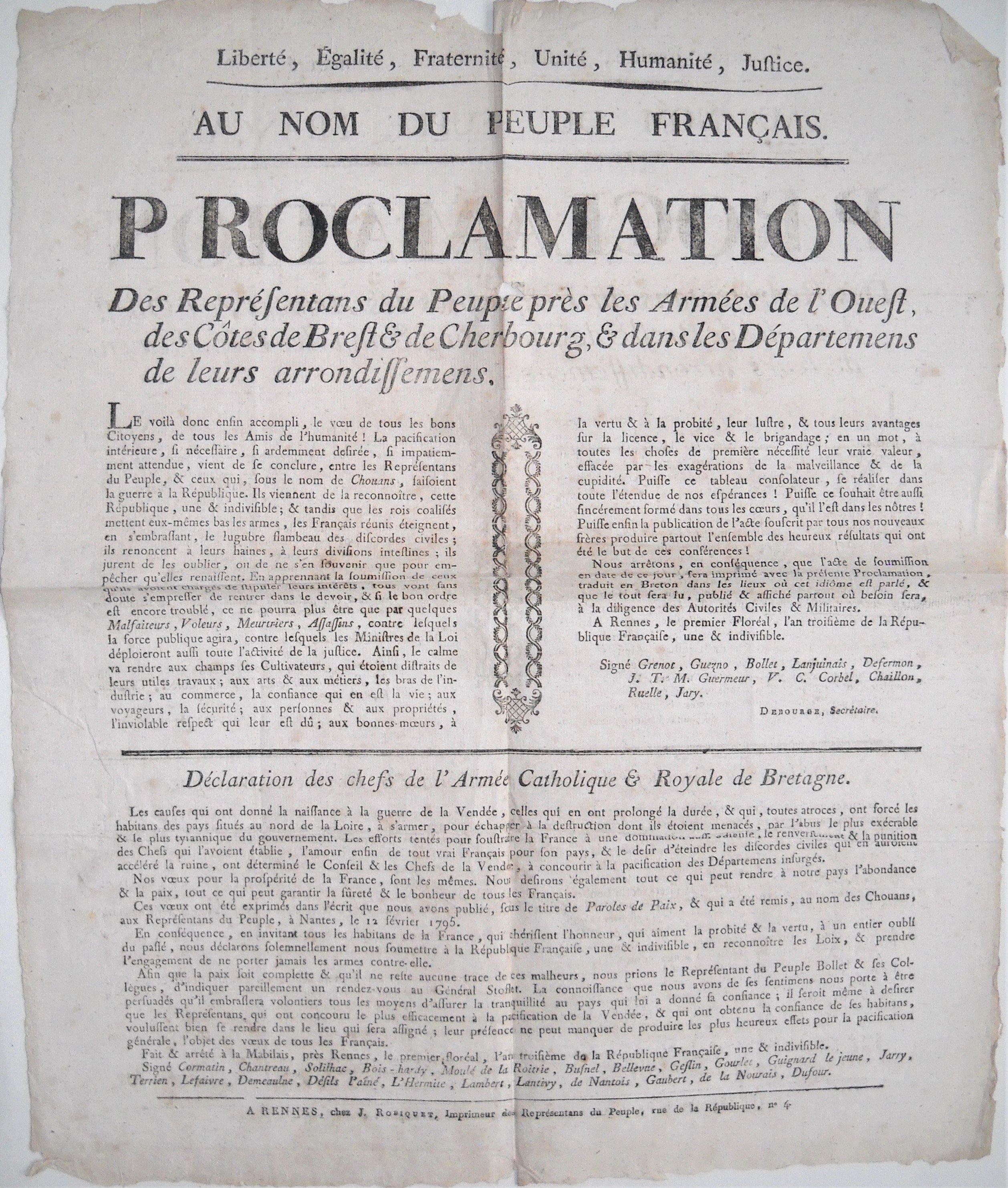 Proclamation des représentants du peuple en Bretagne du 20 avril 1794, annonçant un traité de pacification conclu avec les chefs de la chouannerie « de l’armée catholique et royale de Bretagne », 49 x 40 cm (pliures, petits accdts).