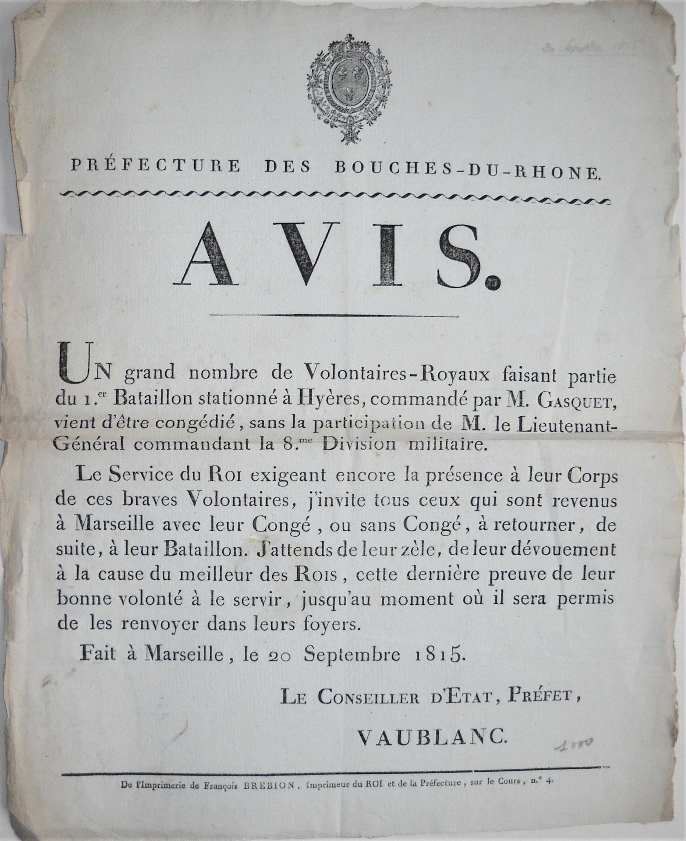 Joint: Avis de convocation du préfet des Bouches-du-Rhône pour les volontaires-royaux du 1er bataillon stationné à Hyères, 20 septembre 1815, 37 x 30 cm.