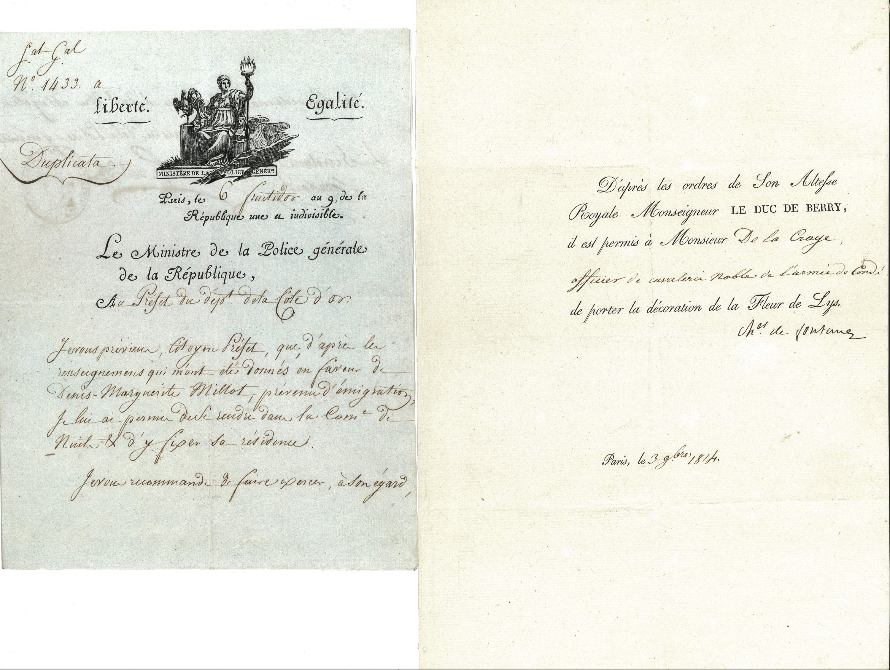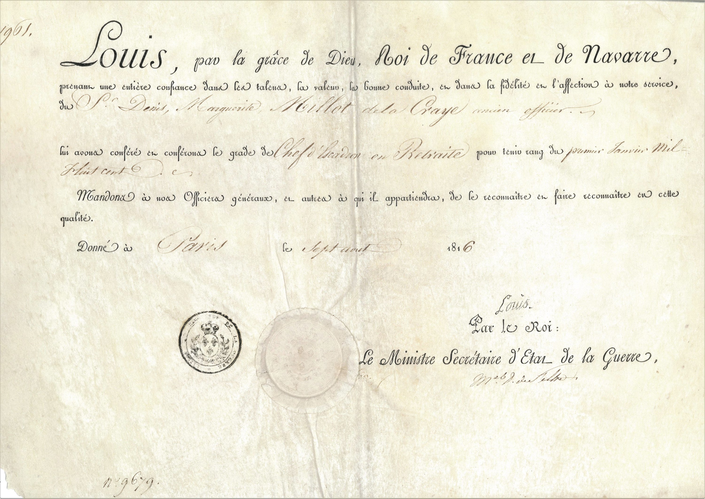Belle et rare réunion de 24 pièces relatives à la carrière militaire de Denis Marguerite Millot de la Craye, officier ayant participé à toutes les batailles dans larmée des Princes, fin du XVIIIe début du XIXe siècle, dont