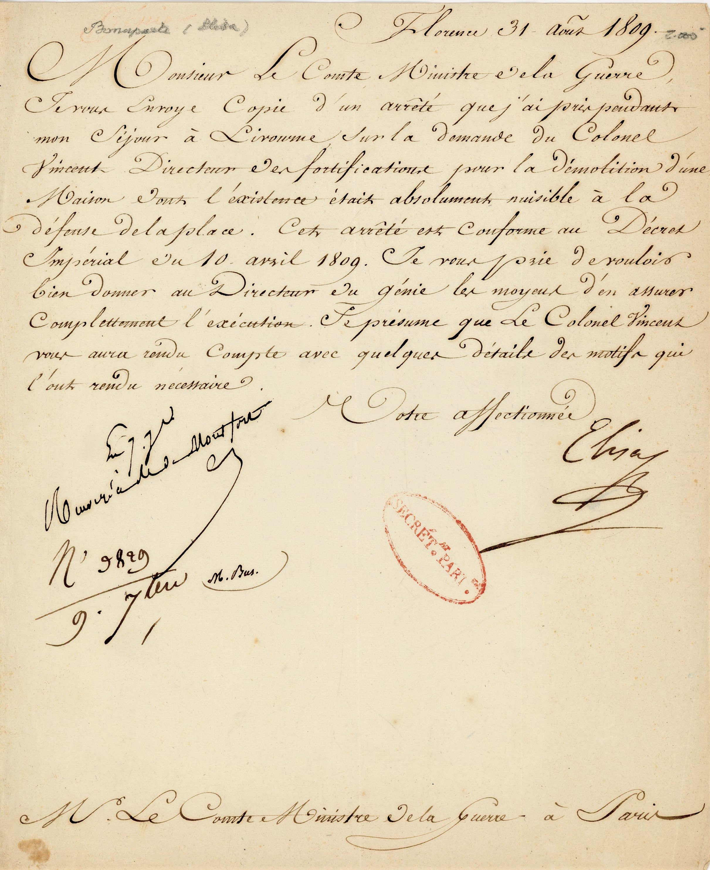L.S., Florence, 31 août 1809, Elisa BONAPARTE (1777-1820), adressée au ministre de la Guerre, avec tampon à lencre rouge « Secrétariat particulier » ; en tant que grande-duchesse de Toscane, elle demande la démolition dune maison à Livourne ;