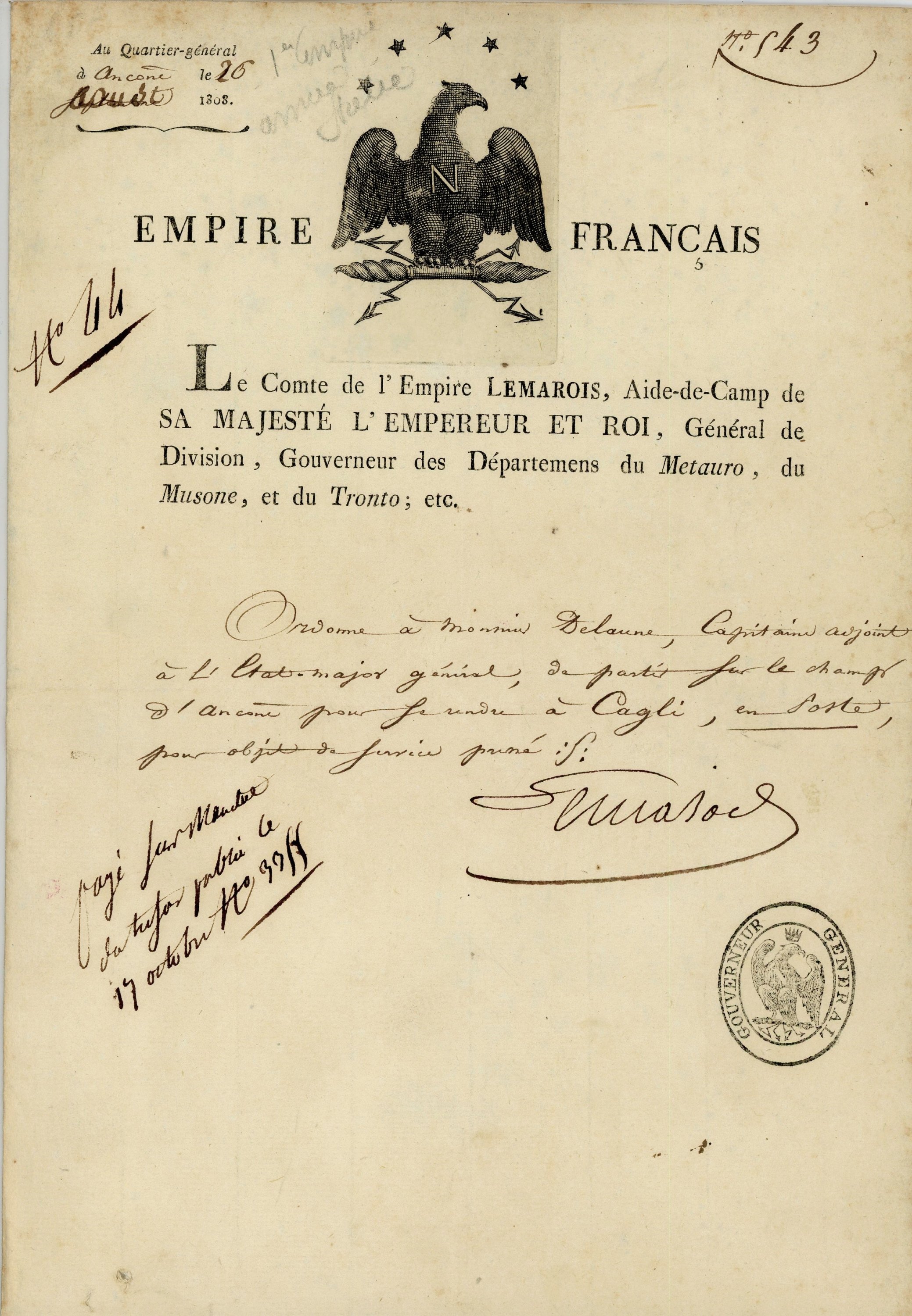 L.S., Ancône, 26 août 1808, Jean LE MAROIS (1776-1836), comte et général dEmpire, gouverneur des Légations et commandant des troupes en Italie, belle vignette gravée.