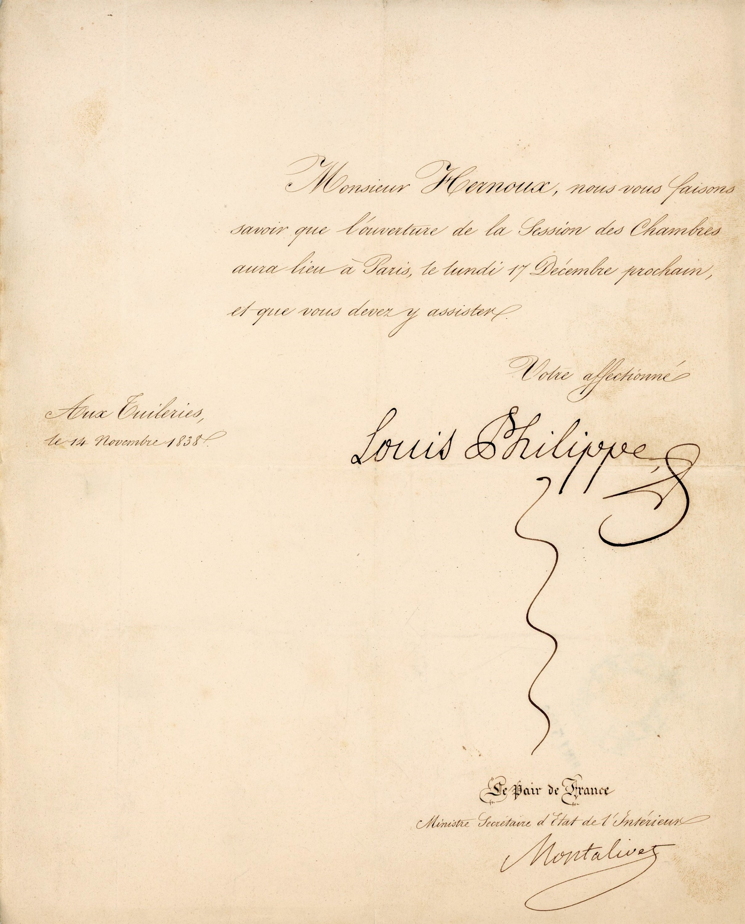 Joint: P.S. « Louis Philippe », roi des Français et contresignée par Montalivet, 14 novembre 1838, convocation pour louverture dune session de la Chambre.