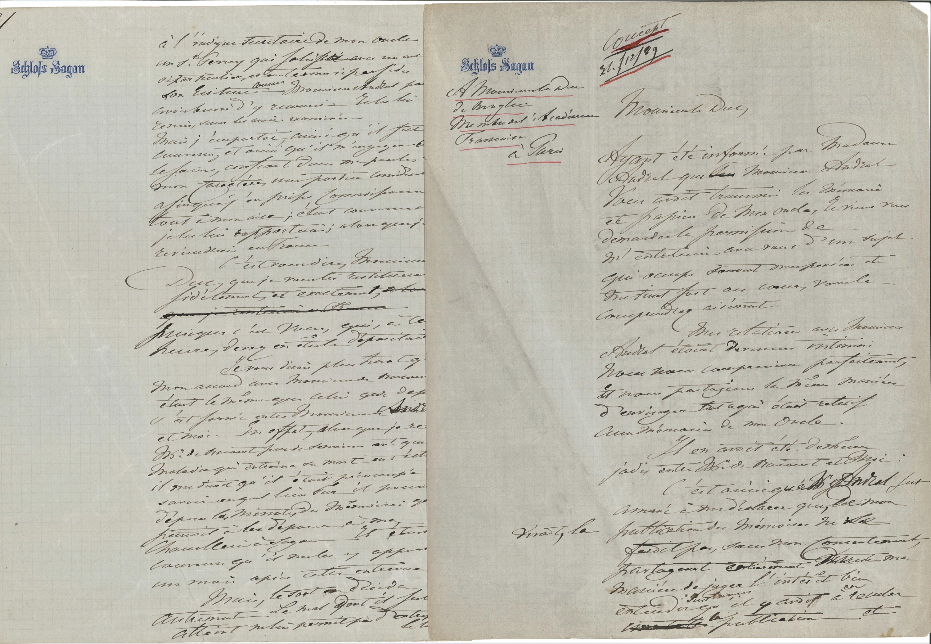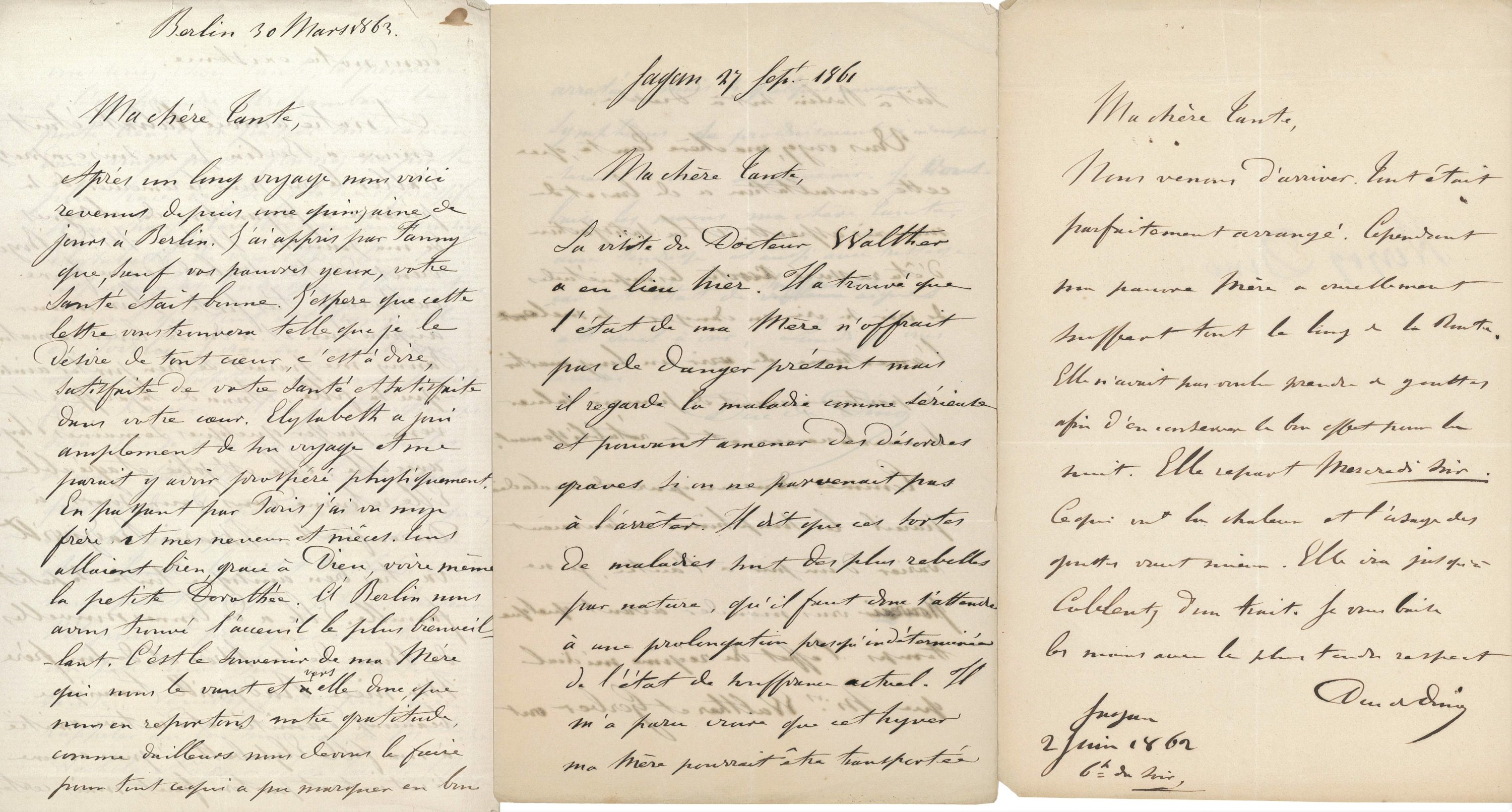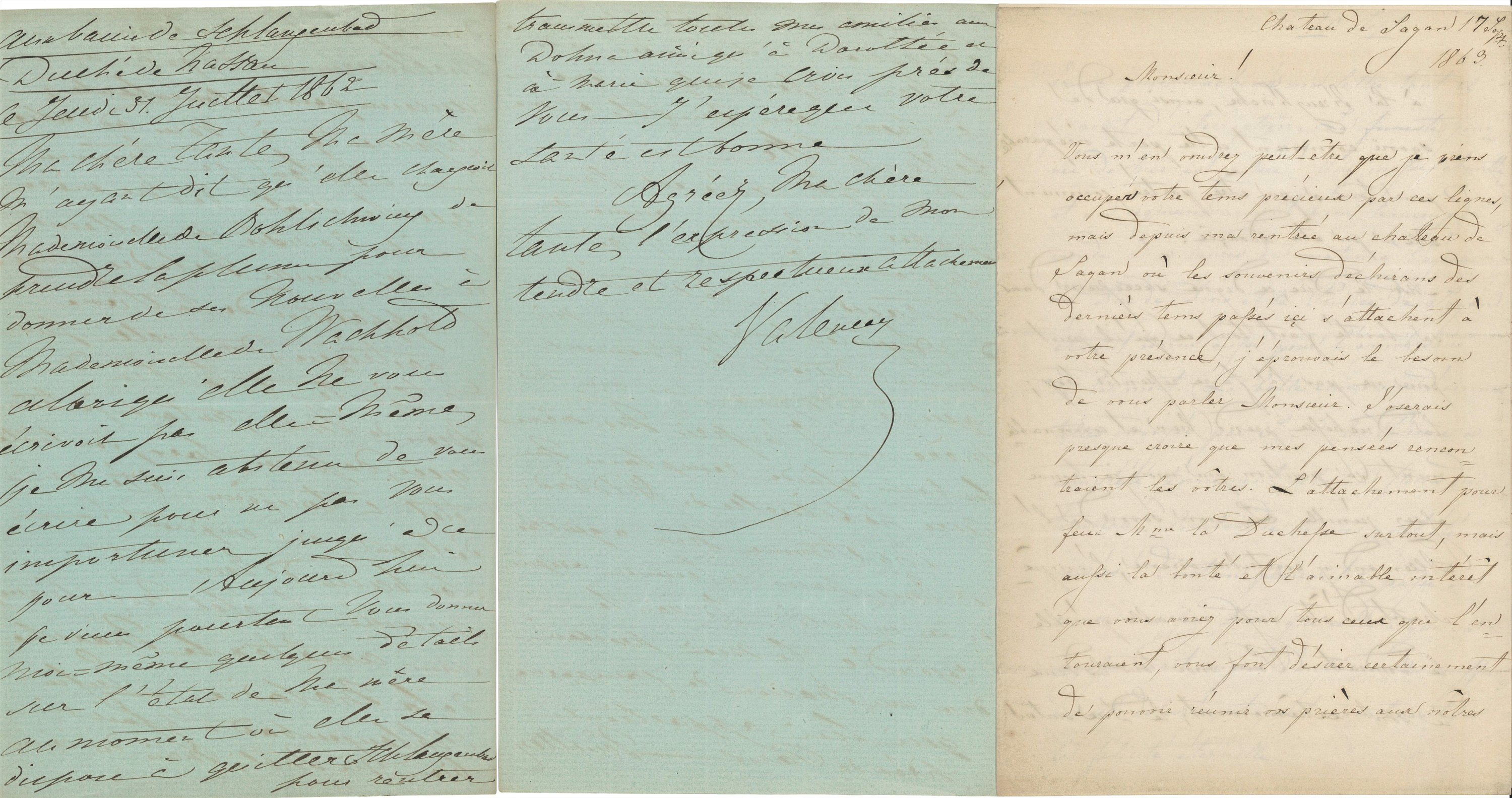 8 L.A.S. de son fils Alexandre-Edmond de Talleyrand-Périgord, duc de Dino (1815-1894), écrites de Sagan et Berlin, 1861-1863, adressées à Jeanne Catherine von Biron sa tante, 28 pages in-8, dont: « Sagan 27 septembre 1861, la visite du docteur Walther a eu lieu hier. Il a trouvé que l’état de ma mère n’offrait pas de danger présent mais il regarde la maladie comme sérieuse et pouvant amener des désordres graves si on ne parvenait pas à l’arrêter. Il dit que ces sortes de maladies sont des plus rebelles par nature, qu’il faut donc attendre à une prolongation presqu’indéterminée de l’état de souffrance actuel. Il m’a paru croire cet hiver que ma mère pourrait être transportée soit à Berlin soit à Dresde… » « Sagan 4 septembre 1862 Ma chère tante, vous comprendrez que sachant ma pauvre mère de retour à Sagan longtemps avant l’époque fixée, j’aie eu hâte de revenir près d’elle. Je suis donc arrivé ici le 1er septembre à 4 heures du matin. J’ai eu le chagrin de voir que ni les eaux ni les remèdes n’avaient suspendu la marche de la maladie. (…) combien il est difficile de faire accepter à ma mère l’idée de voir de nouveaux visages. Elle croit que ce nouveau médecin resterait impuissant comme les autres à lui procurer le moindre soulagement… » « 9 sept. 1862 Sagan Ma chère tante depuis ma dernière lettre il n’y a pas d’amélioration dans l’état de ma mère. Elle ne se lève plus que pour permettre de refaire son lit. Sa faiblesse est très grande, et elle a bien peu d’appétit et mange à peine. (…) Mon frère de Valençay est ici depuis le premier. M. de Bacourt est arrivé le 6. Il prolongera tout l’automne son séjour à Sagan. Sa présence est d’un secours réel pour ma mère et une consolation pour nous par l’amitié qu’il montre à ma chère mère… » « 19 sept. 1862 Sagan le télégramme de mon frère au docteur aura été sans doute déjà communiqué à ma tante lorsque vous recevrez cette lettre. Mais dans le cas où la cruelle nouvelle ne lui serait pas arrivée (…) Vous aurez remarqué, Mademoiselle, que la maladie de ma chère mère a pris tout à coup une marche plus rapide qu’on ne l’avait supposé. En présence du danger grandissant j’ai été dans une grande perplexité ainsi que mon frère par rapport à ma tante. Lui cacher nos alarmes ne pouvait entrer dans notre pensée, les lui participer au milieu de sa cure nous paraissait imprudent. (…) Il y a 5 jours que le délire s’empare de notre chère malade. Ce délire lui permettait toutefois de répondre juste au premier moment aux interrogations qui lui étaient posées. Le délire dura deux jours et deux nuits, après lesquels il disparut. Une très grande faiblesse se manifesta, puis les douleurs reparurent violentes. L’état de la langue rendait la parole difficile, il fallut recourir à la morphine pour dompter les douleurs. A 6 heures du matin hier, on donna de nouveau une dose de morphine. Avant qu’elle n’ait produit son effet, j’eus le bonheur d’être reconnu à ma voix par ma mère. La journée d’hier fut calme mais le pouls était très élevé. La nuit dernière quelques douleurs reparurent, la fièvre très forte, la faiblesse augmentent à vue d’œil (…)