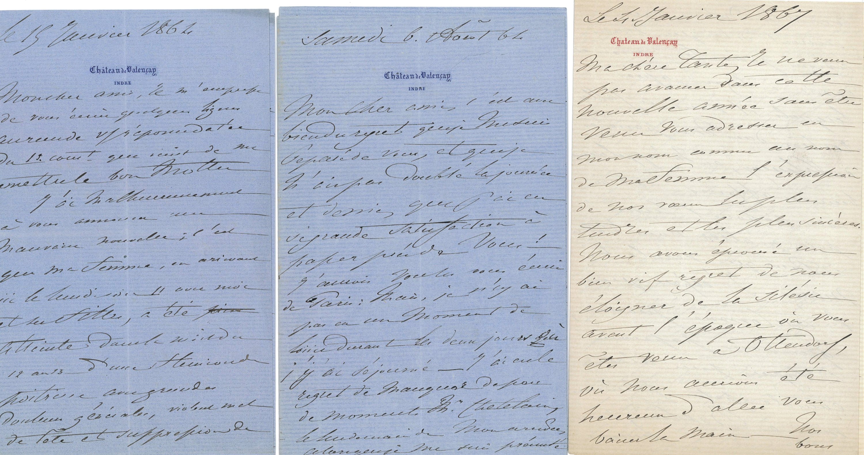 Joint: 9 L.A.S. Alexandre-Edmond de Talleyrand-Périgord, duc de Dino (1815-1894), écrites de Valençay et de Günthersdorf, 1852-1868, adressées à Jeanne Catherine von Biron sa tante, 32 pages in-8 in-4 - L.A.S., Berlin, 11 juin 1857, Pauline dite Minette de Talleyrand-Périgord, fille de la duchesse de Dino et épouse de Henri marquis de Castellane, 4 pages in-8 à sa tante, 4 pages in-8 - L.A.S., 21 juillet 1863, Elisabeth de Talleyrand-Périgord, fille dAlexandre duc de Dino et nièce de la duchesse de Dino, à sa tante, 3 pages in-8.