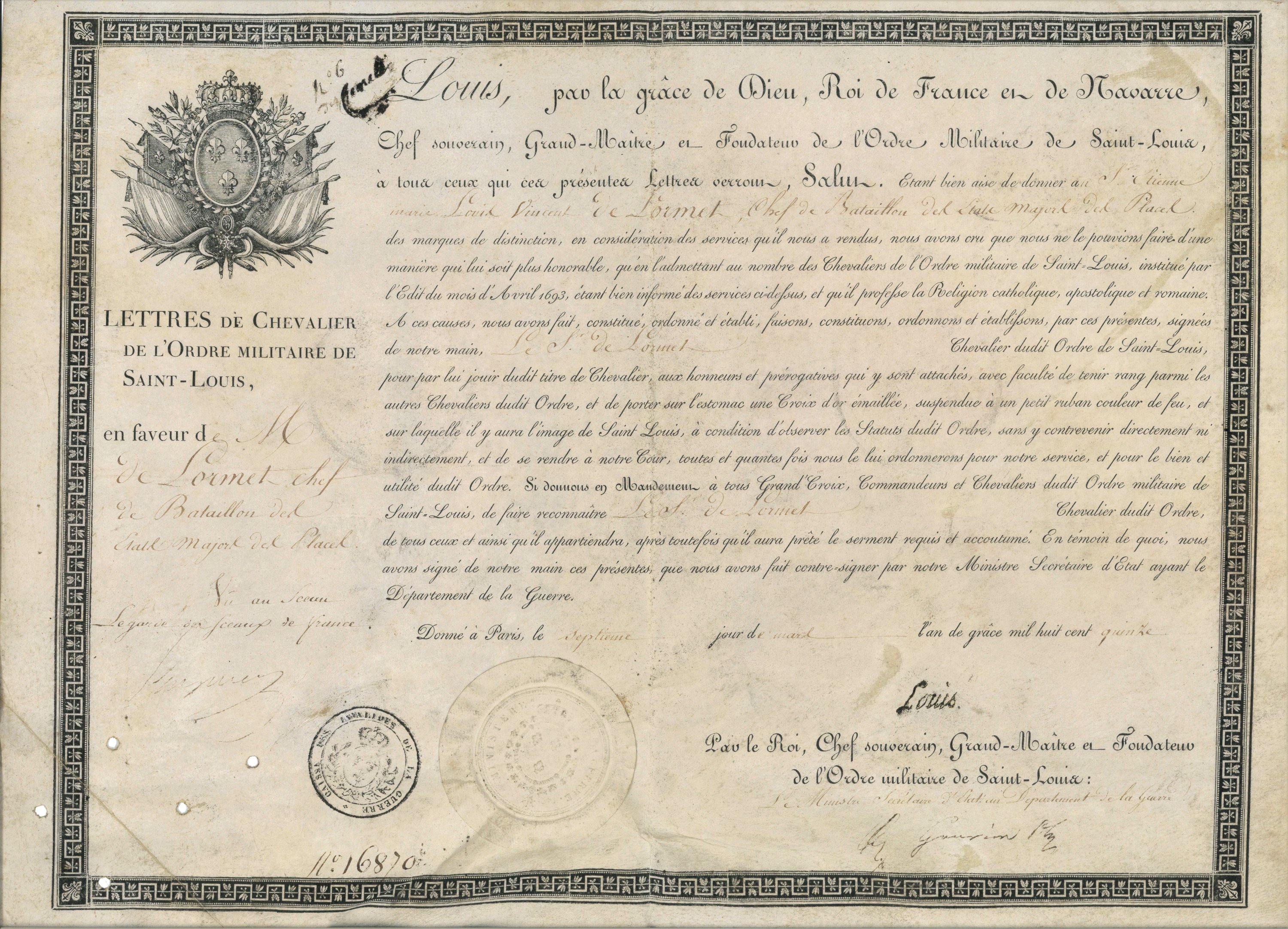 Lettres de chevalier de l’ordre militaire de Saint Louis délivrées le 7 mars 1815 à Etienne Marie Louis Vincent de Lormet, chef de bataillon des états-majors des places, sur velin, cachet sec, 32 x 41 cm.