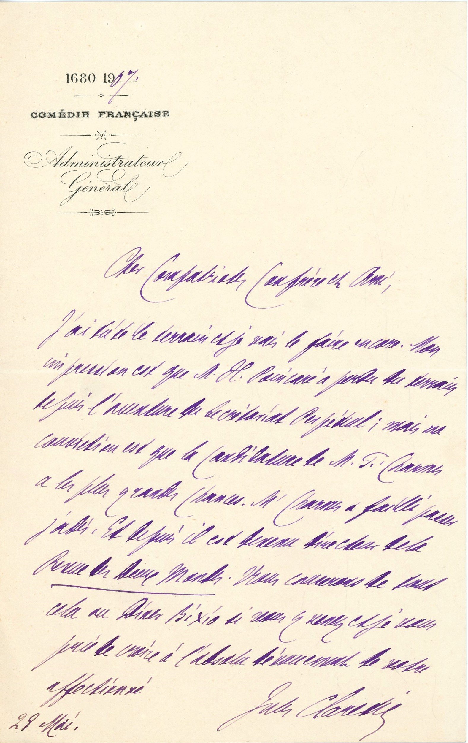 L.A.S., 28 mai [1907], Jules CLARETIE (1840-1913), 1 page in-8, au sujet de l’élection à l’Académie française: « Cher compatriote, confrère et ami, j’ai tâté le terrain et je vais le faire encore. Mon impression est que M. H[enri] Poincaré a perdu du terrain depuis l’ouverture du secrétariat perpétuel ; mais ma conviction est que la candidature de M. F[rancis] Charmes a les plus grandes chances. M. Charmes a failli passer jadis. Et depuis il est devenu directeur de la Revue des Deux Mondes. Nous causerons de tout cela au dîner Bixio si vous y venez… »