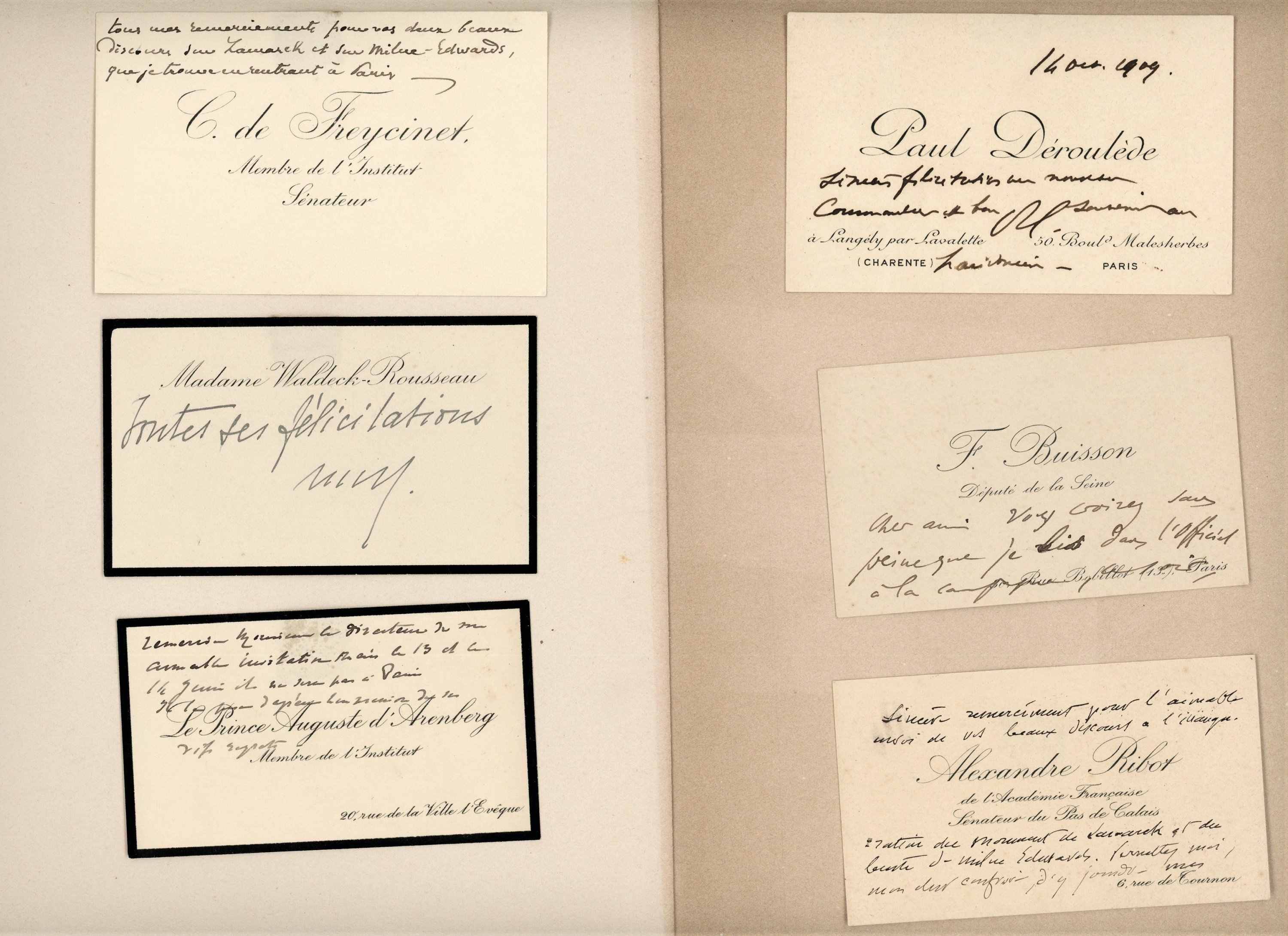 Lot de 8 cartes de visite, début du XXe s., dont certaines avec annotations manuscrites dont Paul DEROULEDE, Alexandre RIBOT, prince Auguste d’ARENBERG, Charles de FREYCINET, etc.