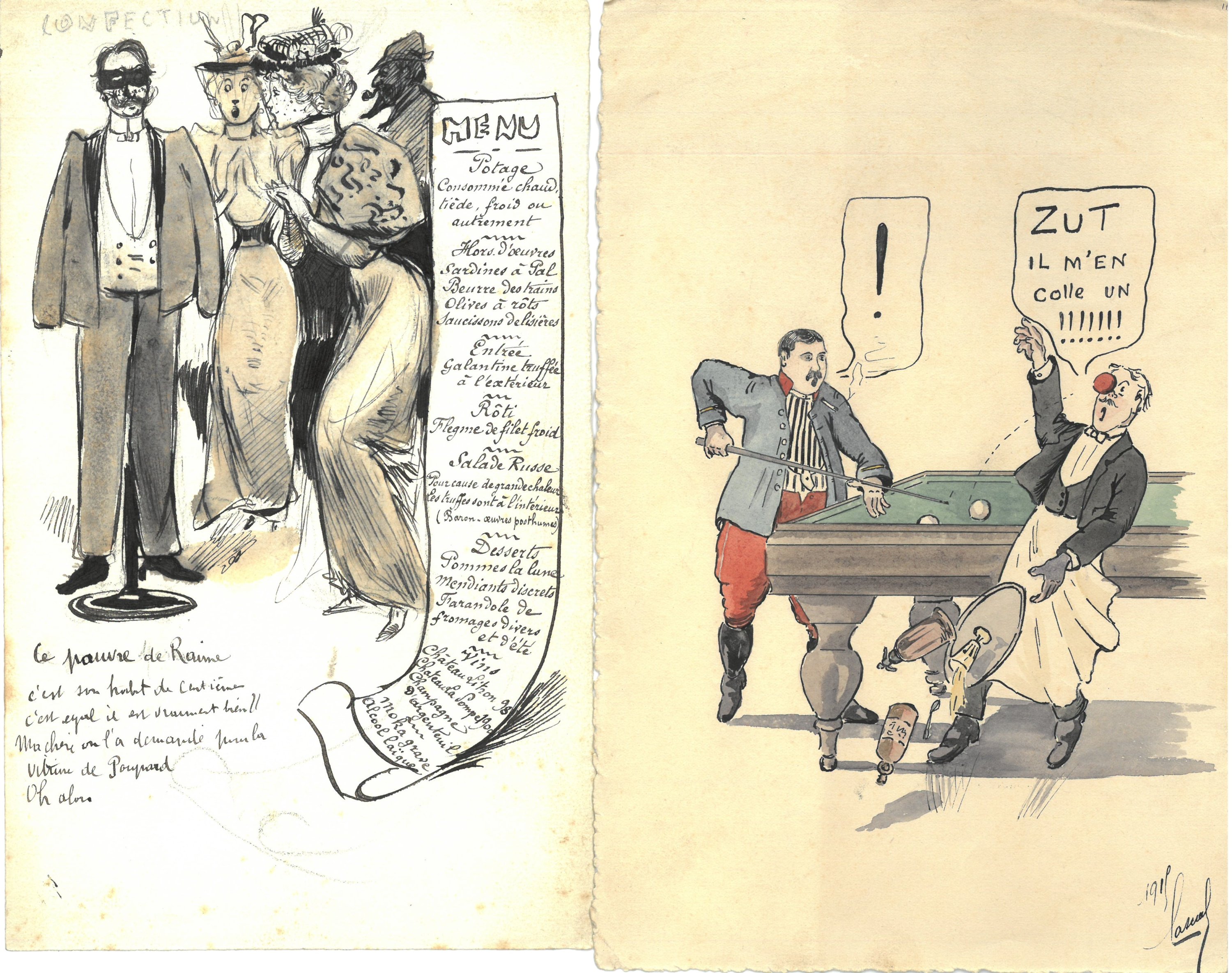 - LASNAL (?) "Zut il m'en colle un!". Dessin humoristique représentant Lucien Collin jouant à son jeu favori, le billard. Encre et aquarelle sur papier, signée et datée "191.." en bas à droite.25 x 16,5 cm.