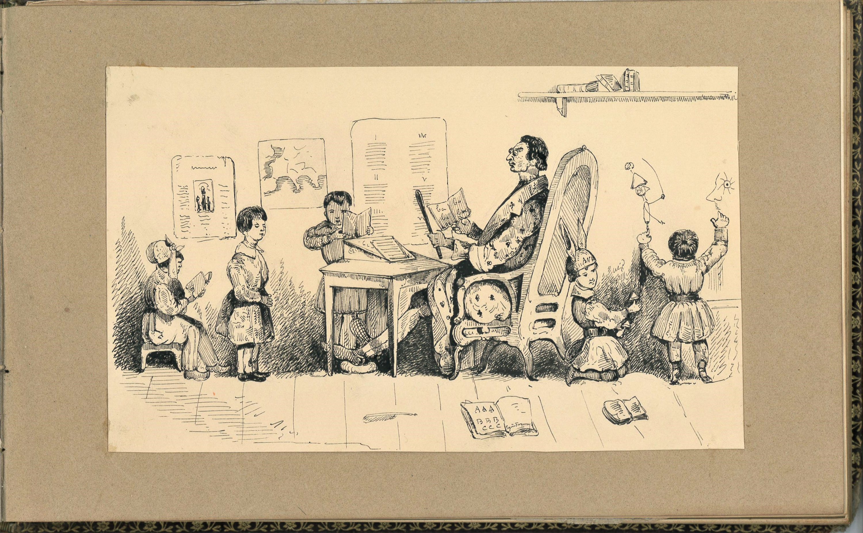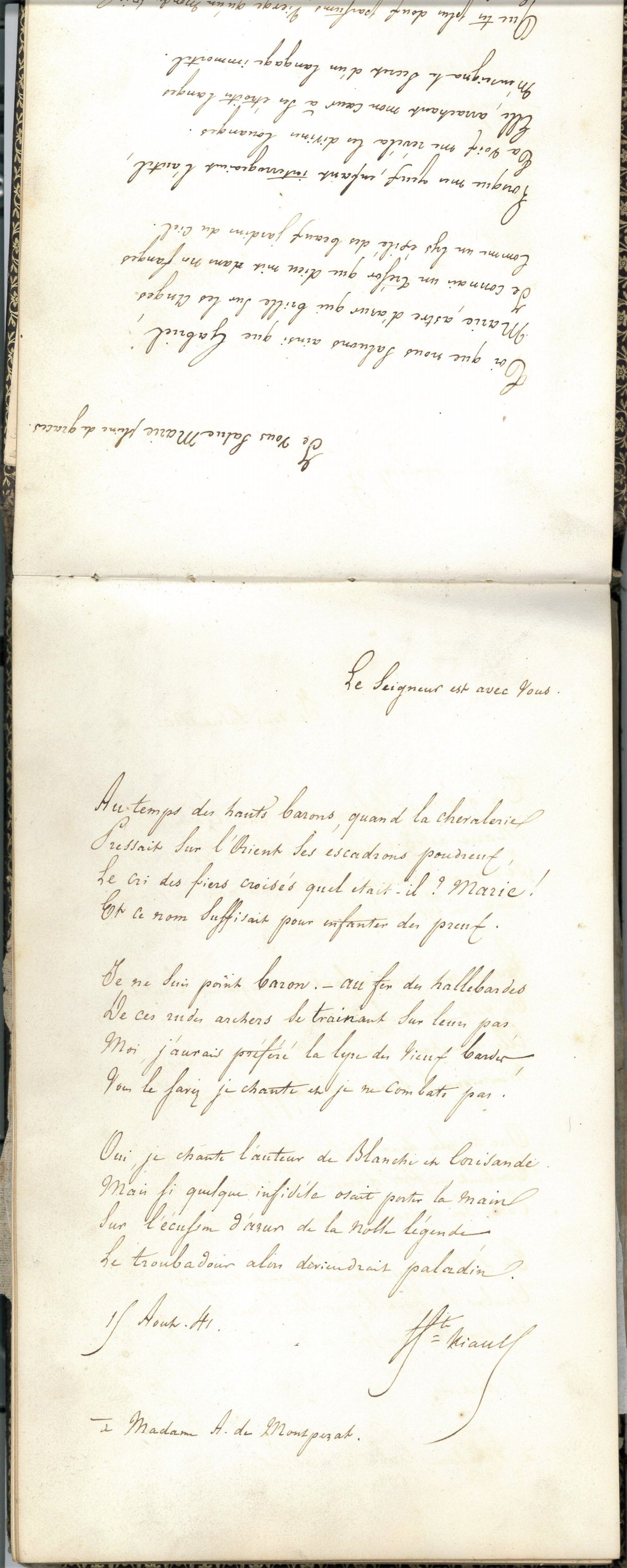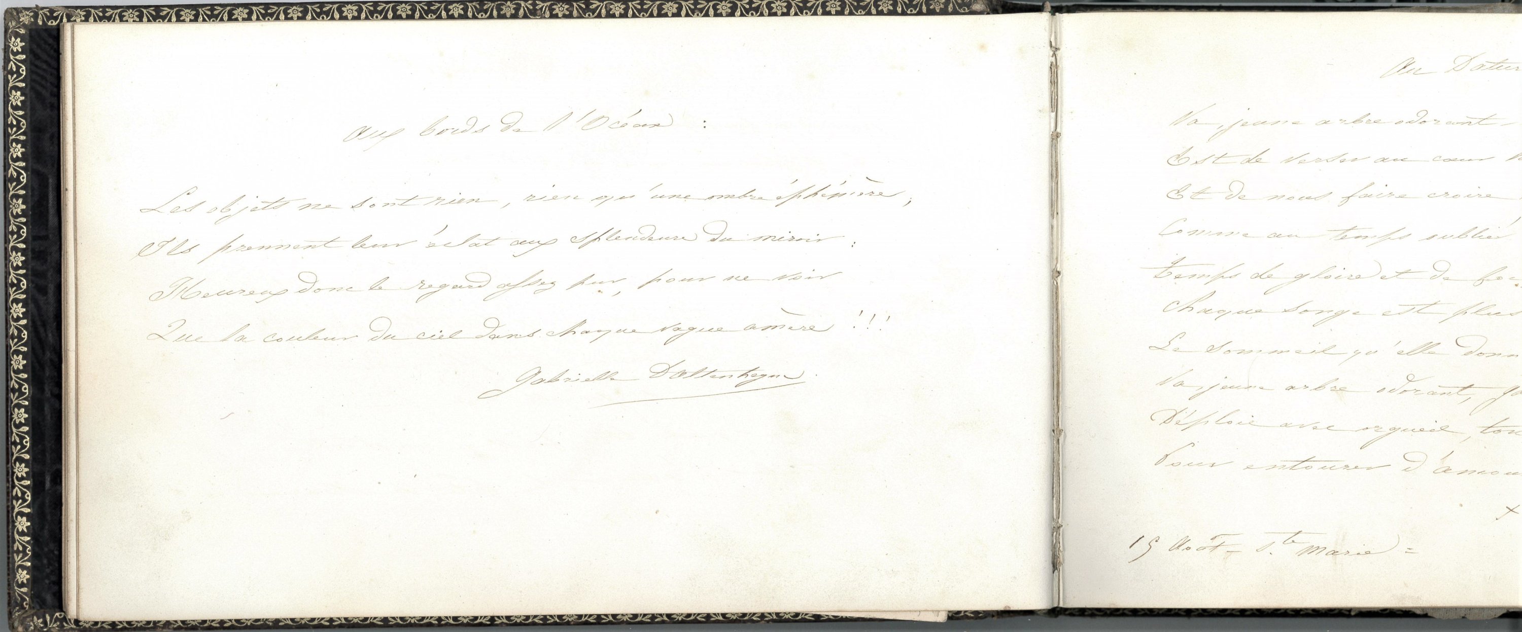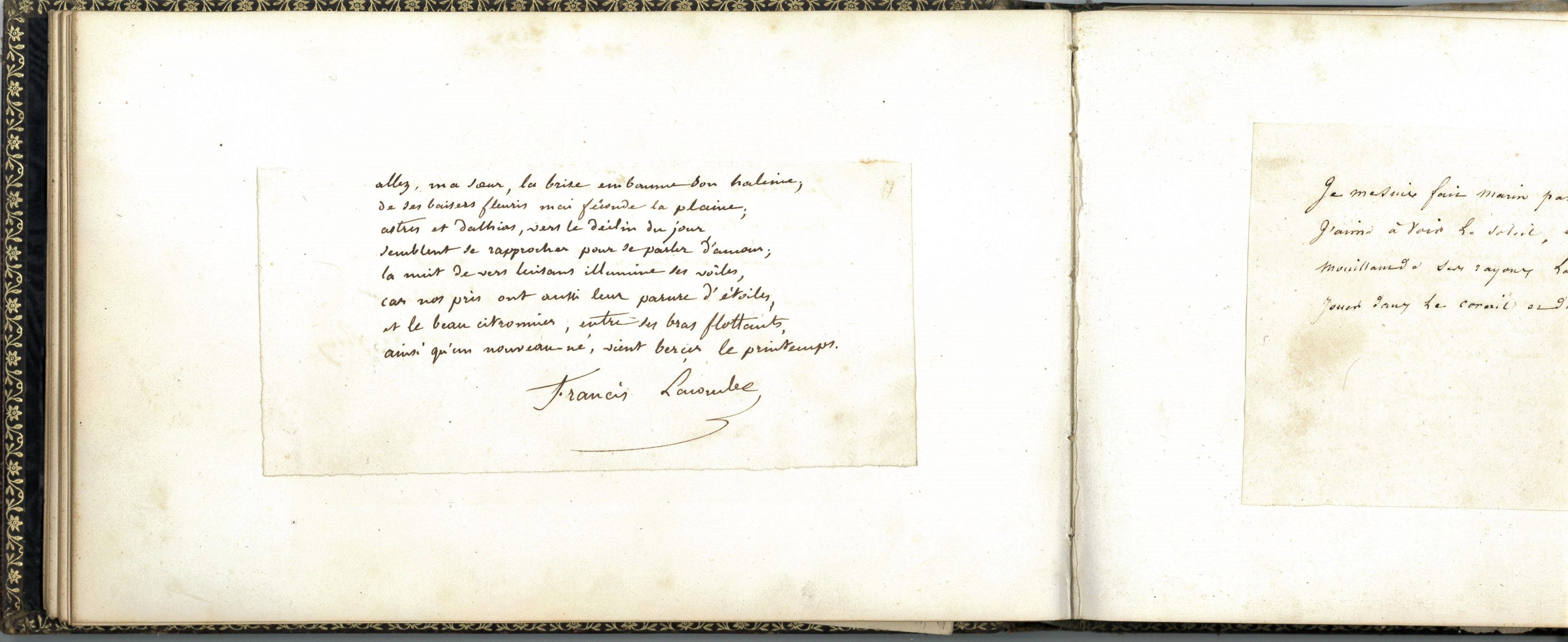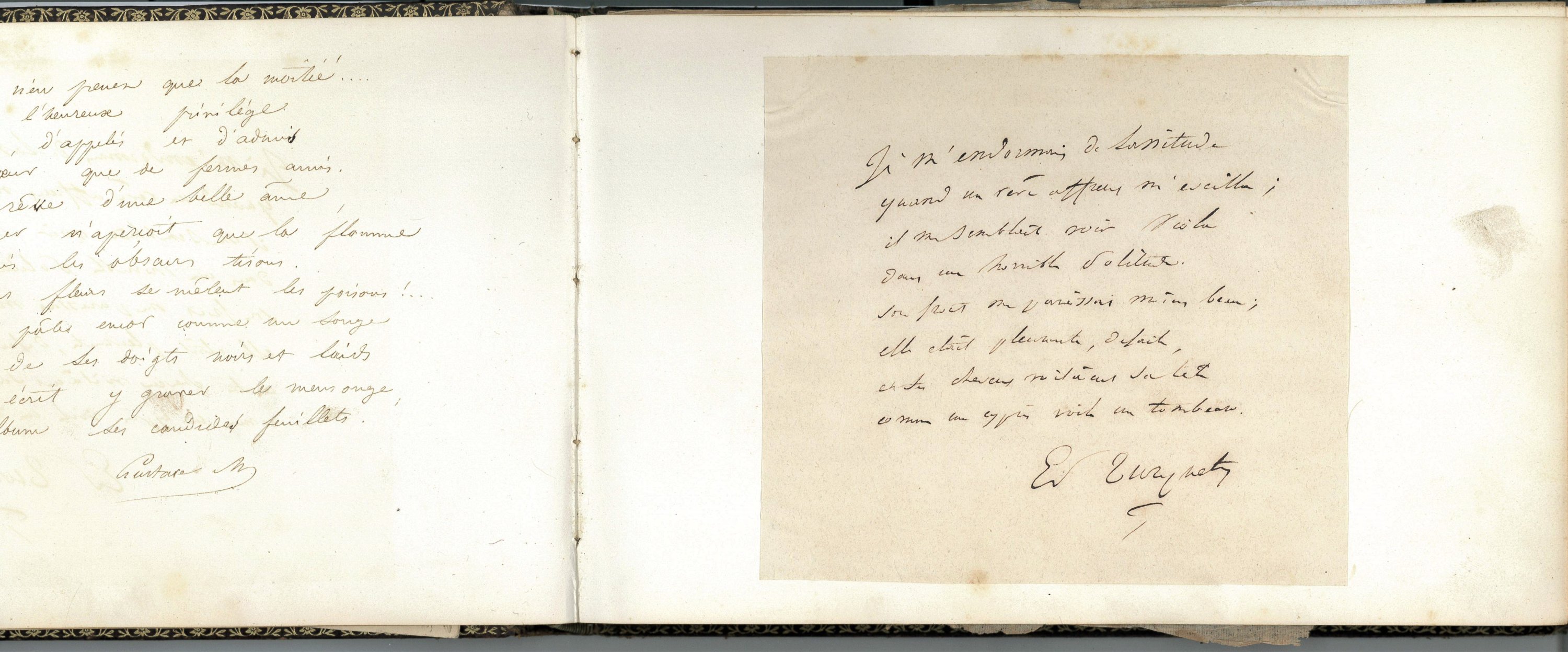 Album amicorum, format à l'italienne, reliure en maroquin (en l'état), 17 x 26 cm, dos et tranches dorés, plats ornés de filets dorés et de décors de fers à froid, monogramme " A. de M. " au centre, contenant env. 37 feuillets sur lesquels sont écrits ou collés des textes manuscrits: poèmes, textes en proses, récits, partitions musicales, ainsi que des dessins au crayon et à la plume, c. 1841-1846.