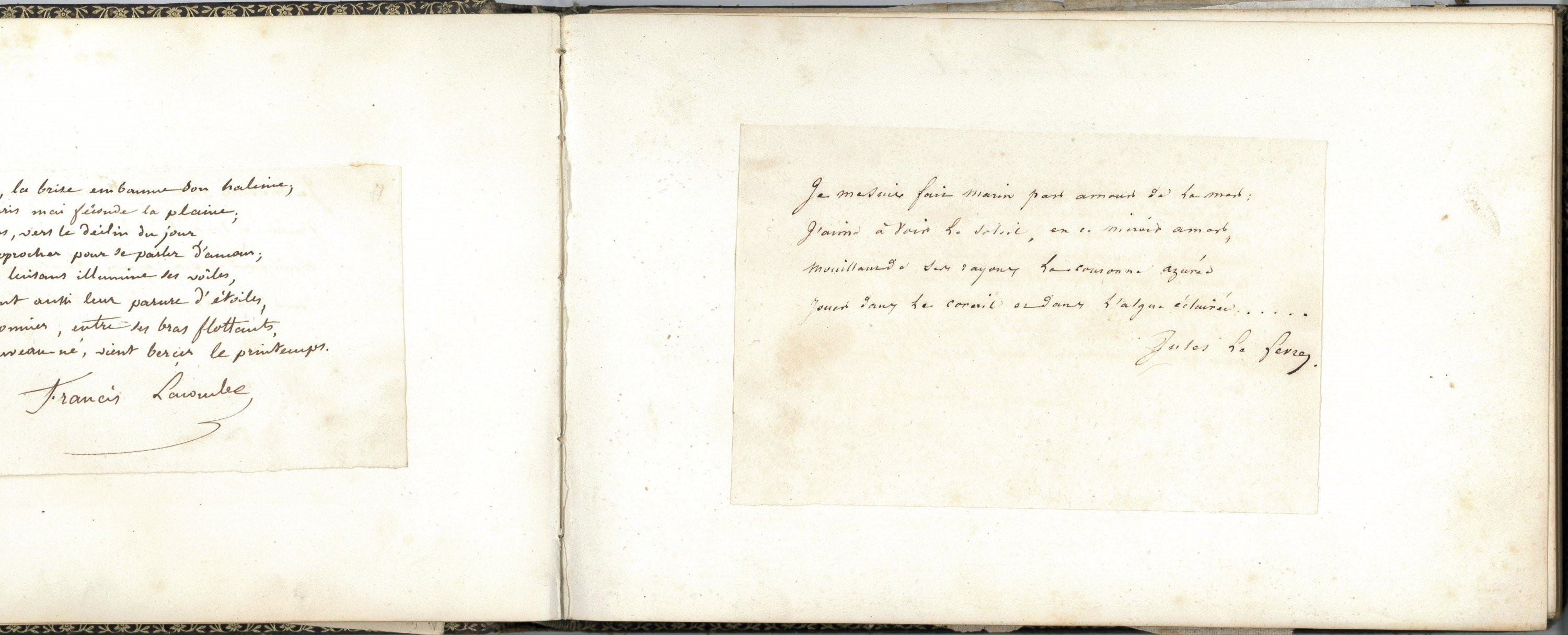 Les auteurs identifiés font partie du cénacle des poètes et écrivains romantiques: ALEXANDRE SOUMET (1788-1845), sa fille GABRIELLE DALTENHEYM (1814-1886), HIPPOLYTE VIAULT (1807-1871), JULES LEFÈVRE-DEUMIER (1797-1857), FRANCIS LACOMBE (1817-1867), LE COMTE GASPARD DE PONS (1798-1860), AUGUSTE DESPLACES (1818-1896), ÉMILE DESCHAMPS (1791-1871), ÉDOUARD D'ANGLEMONT (1798-1876), CHARLES DELPECH DE FRAYSSINET (1821-1887), ÉDOUARD TURQUETY (1807-1867), etc. D'autres auteurs de textes et de dessins à découvrir.