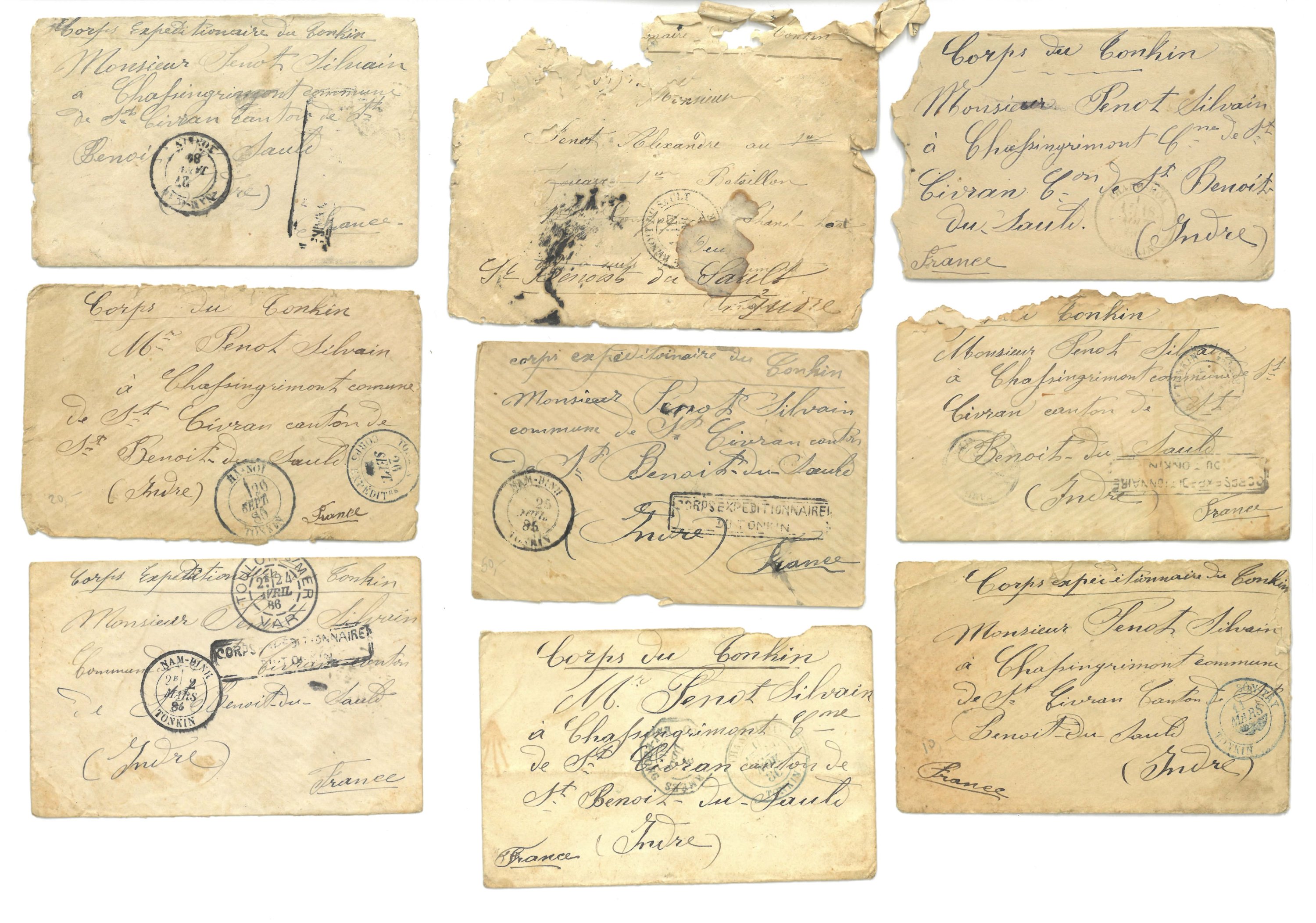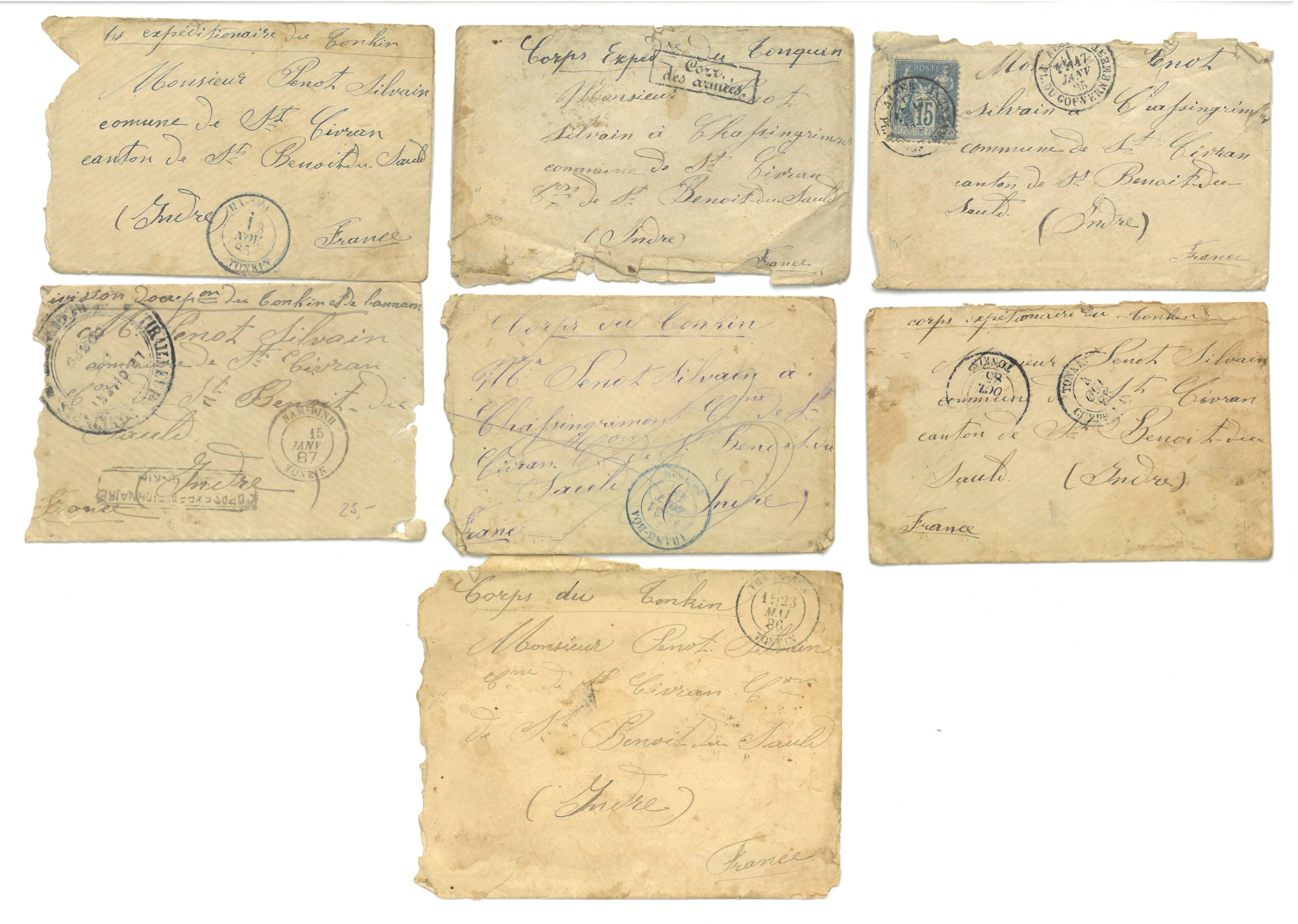 Seize enveloppe adressées à Sylvain Penot à Saint-Civran dans l'Indre par Alexandre Penot, 1er bataillon de Zouave engagé au Tonkin dans les années 1885-1886. En l'état.
