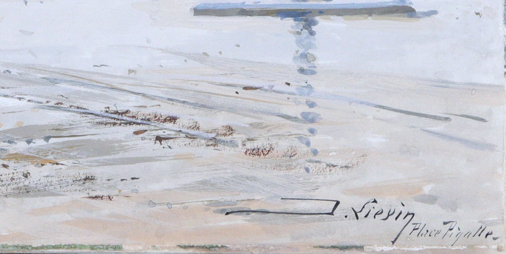 Gouache et aquarelle sur papier, signée "J. Lévin" et localisée "Place Pigalle" en bas à droite.