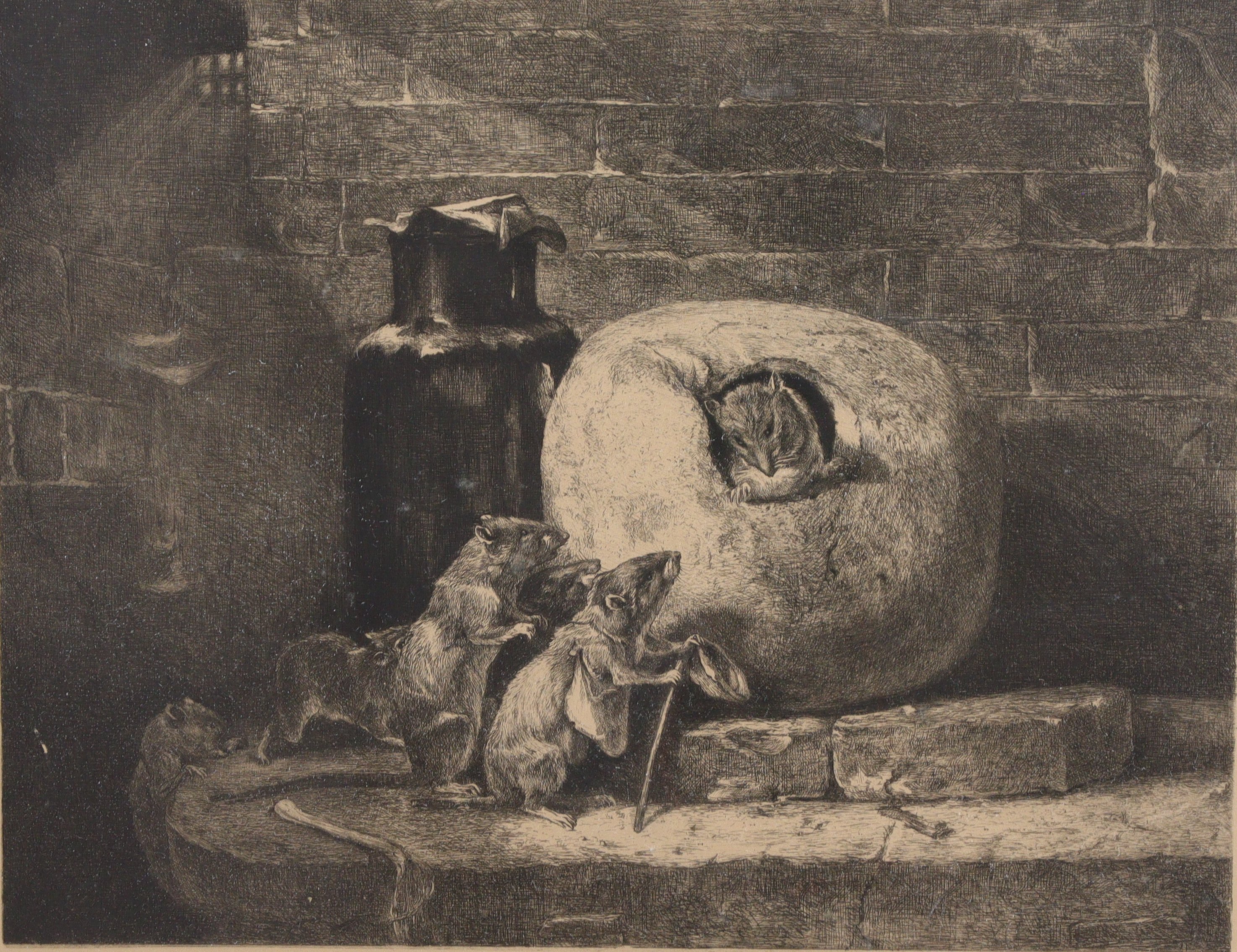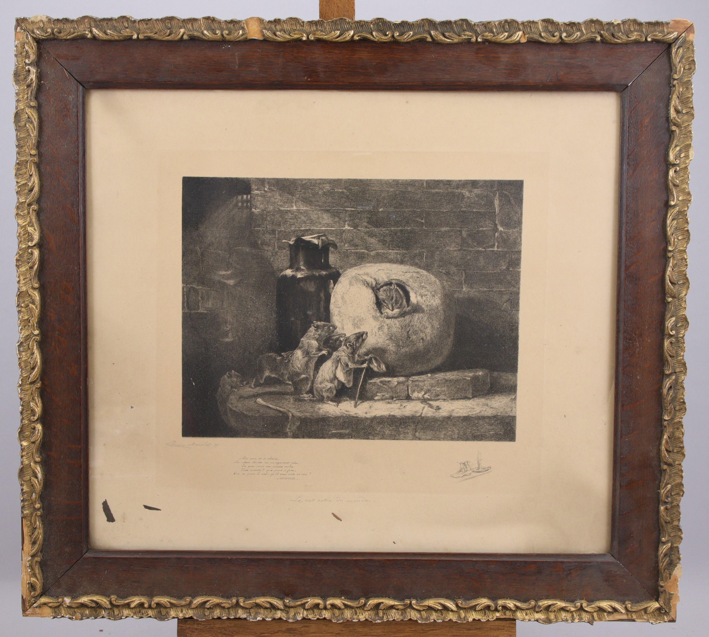 Gravure légendée: "Mes amis, dit le solitaire, les choses d'ici-bas ne me regarde plus. en quoi peut un pauvre reclus vous assister? Que peut-il faire? Que de prier le ciel qu'il vous aide en ceci? LAFONTAINE".