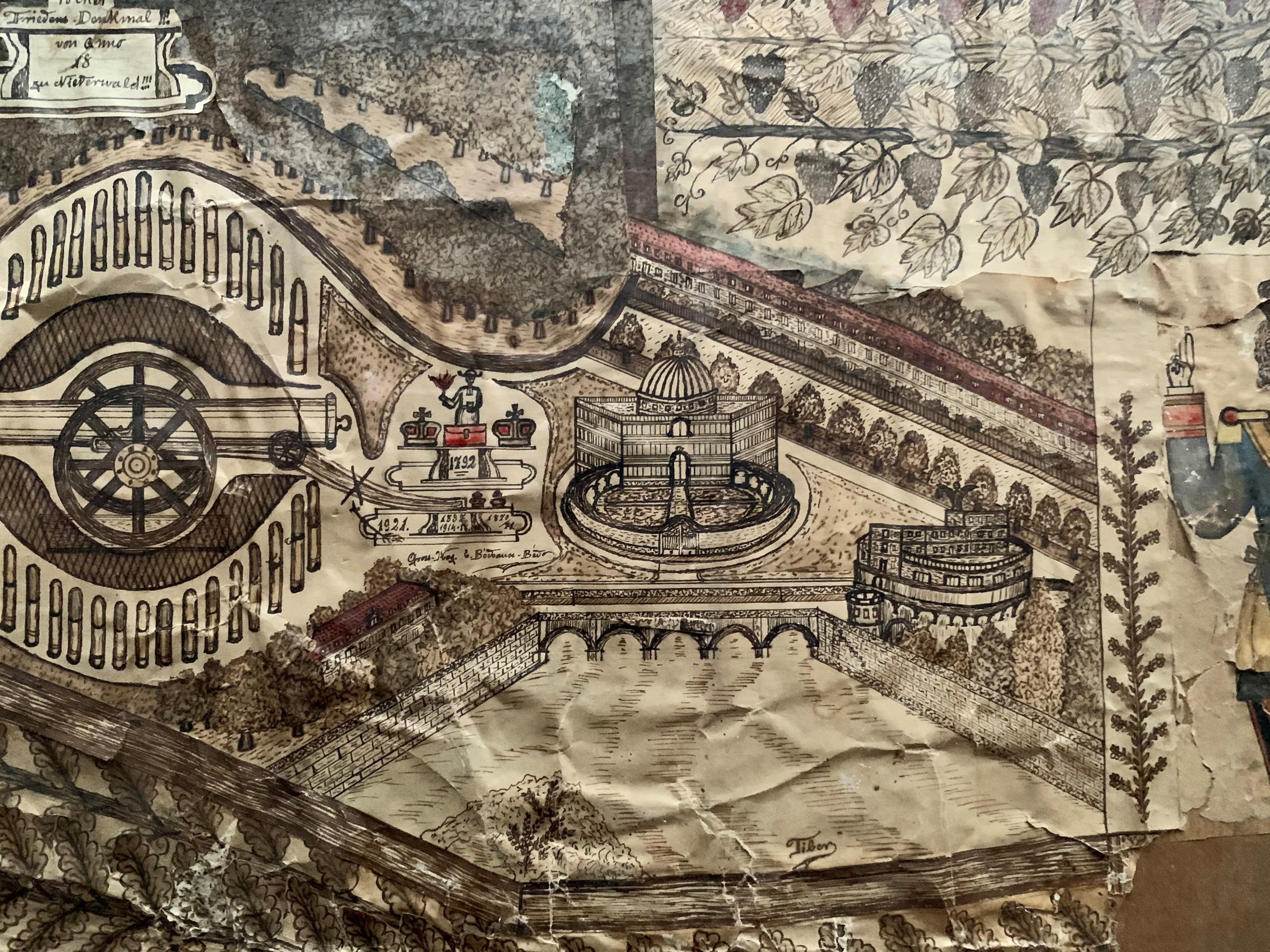 Dessin et collage, avec de nombreuses inscriptions à la plume en patois alsacien.