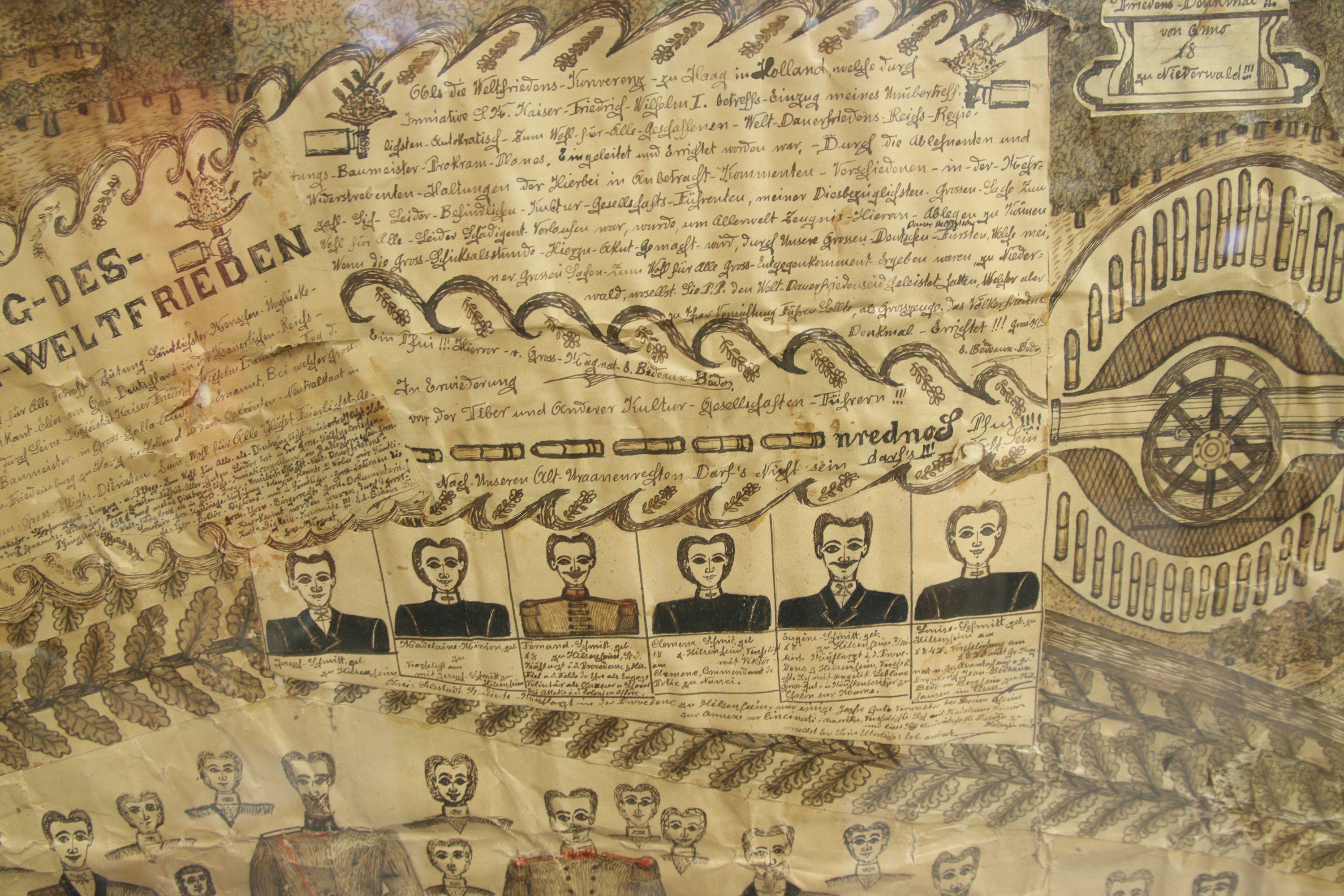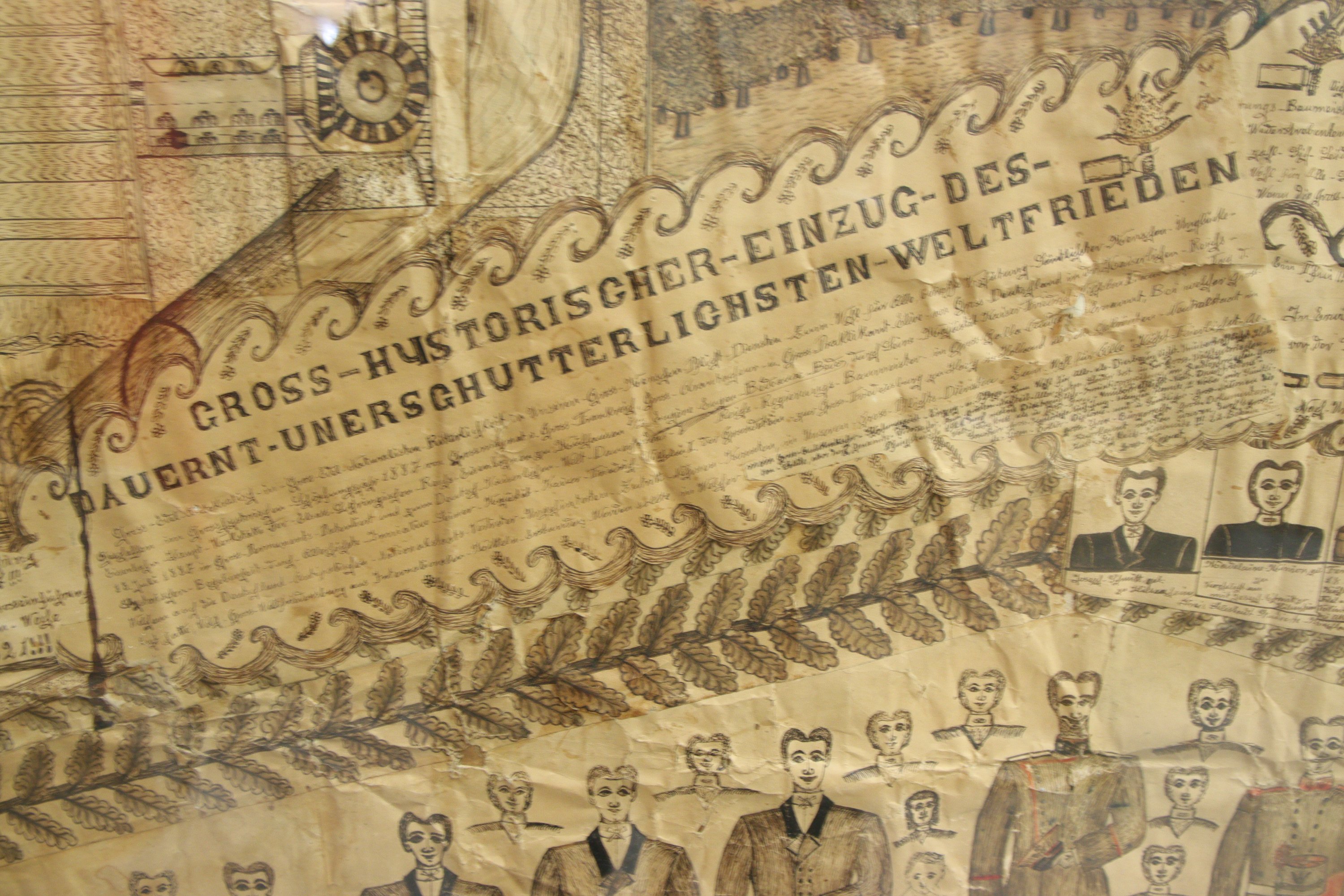 Après avoir écrit de nombreuses lettres brûlots destinées sans succès à être publiées dans les journaux, le patient s'attelle, passé l'âge de cinquante ans, à la réalisation progressive d'une fresque qu'il décrit comme « Es ist der Symbol meiner Geschichte » - C'est le symbole de mon histoire. Si la forme de cette superposition de dessins et collages évoque celle qui fut en vogue chez les Surréalistes, avec leurs cocasseries, emboitements et association inattendues, chez ce malade au contraire, tout est en ordre, tout est en rang, rien n'est fortuit.