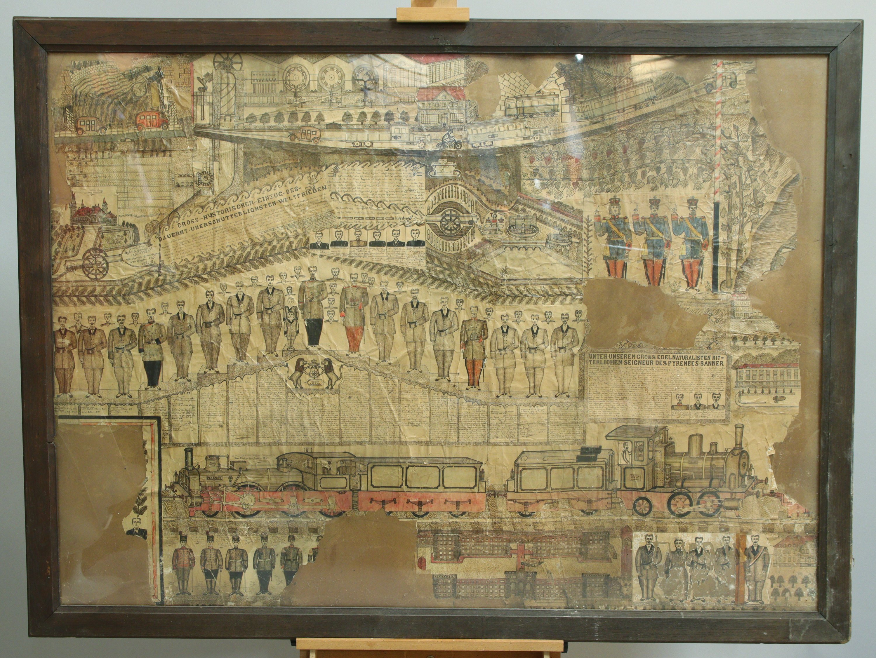 Notre grand dessin (96 x 130 cm) est la partie centrale d'un plus grand encore, dessiné sur plusieurs feuilles de papiers accolées, essentiellement à partir des années 1927-1928. Eugène B., son auteur, est né en 1872, marié et père de trois enfants. Conducteur de locomotive de la compagnie des chemins de fer de l'Alsace-Lorraine, il manifeste des troubles psychiques à partir de 1912, conduisant à son internement dix ans plus tard, en 1922, jusqu'à la fin de sa vie.