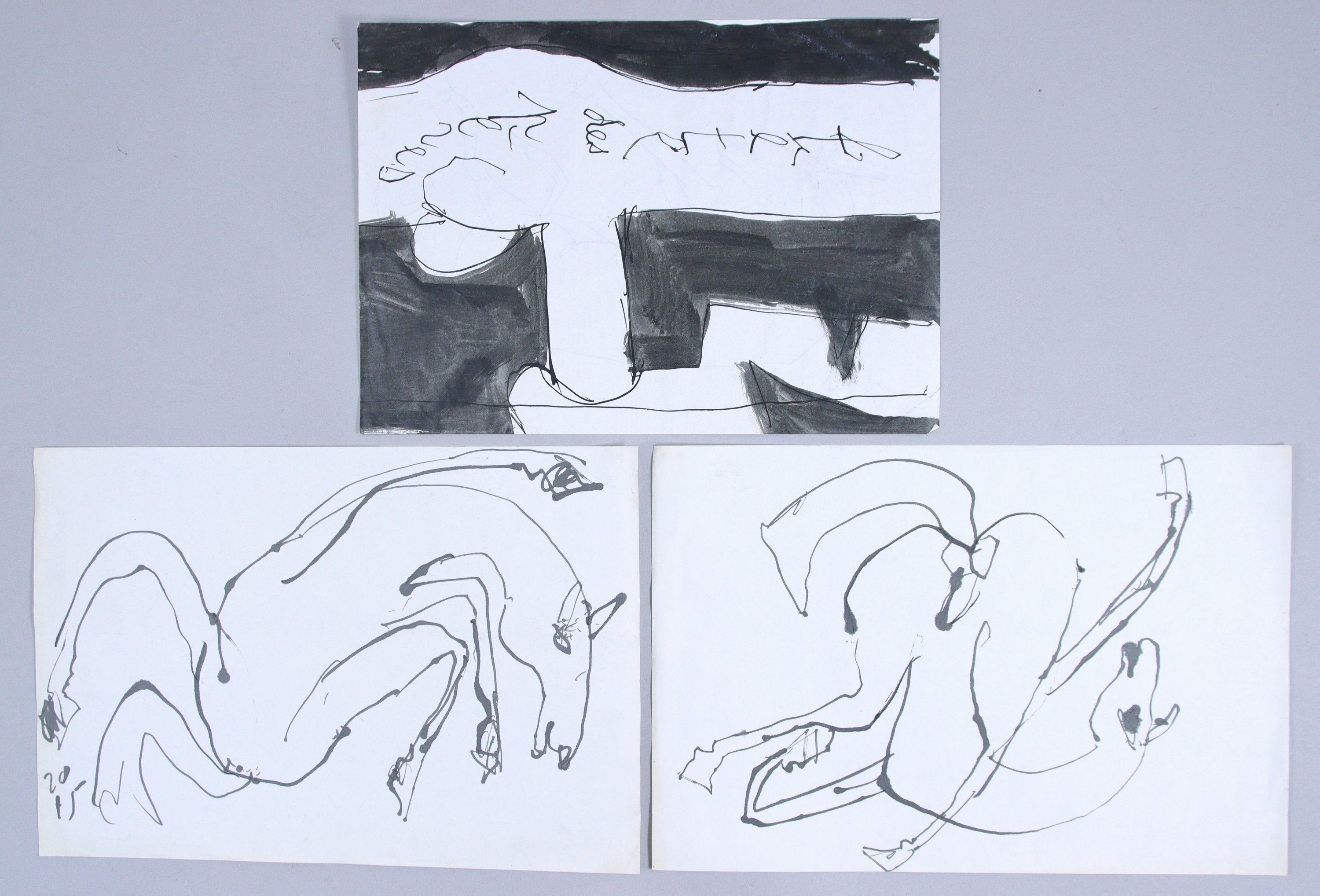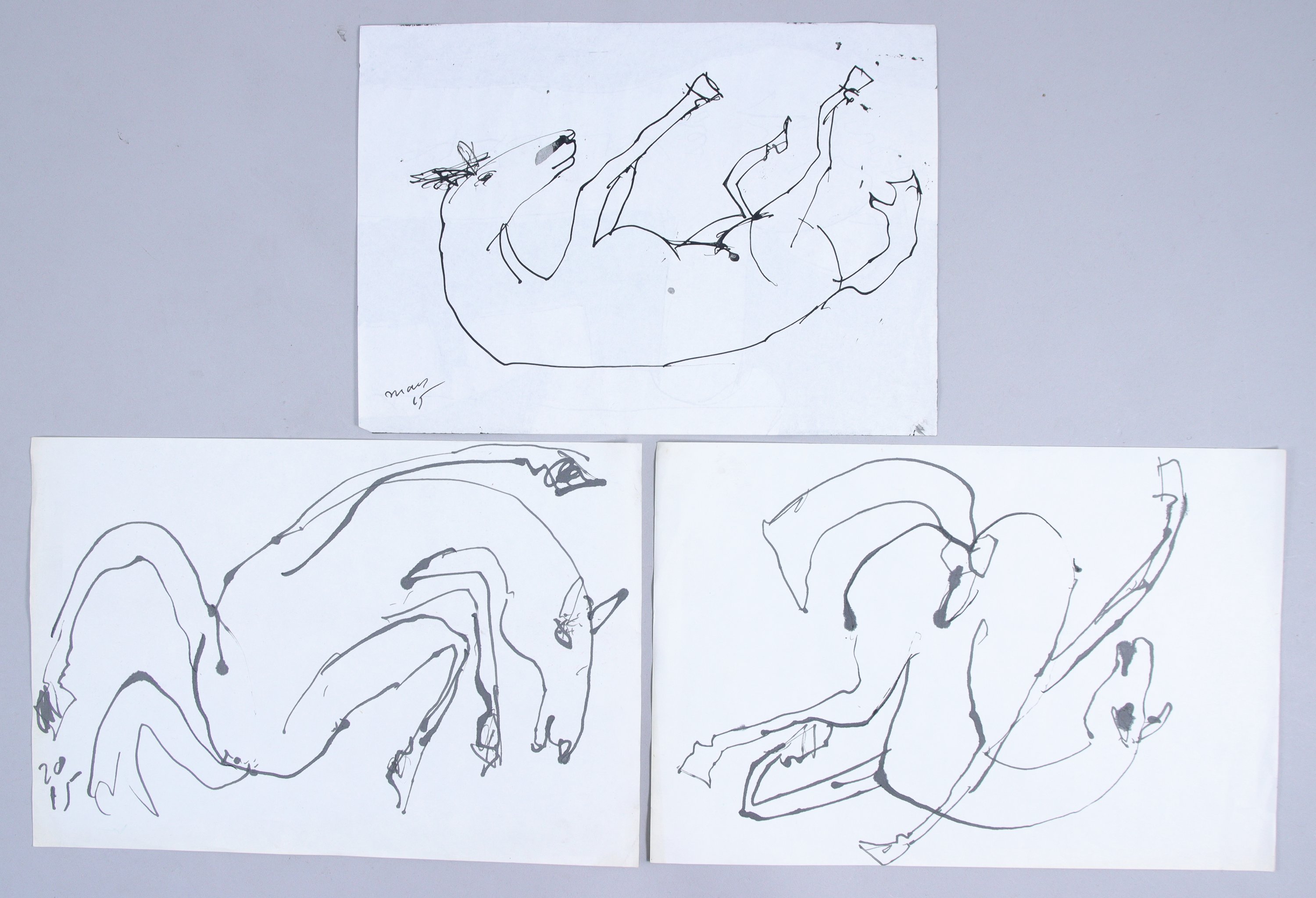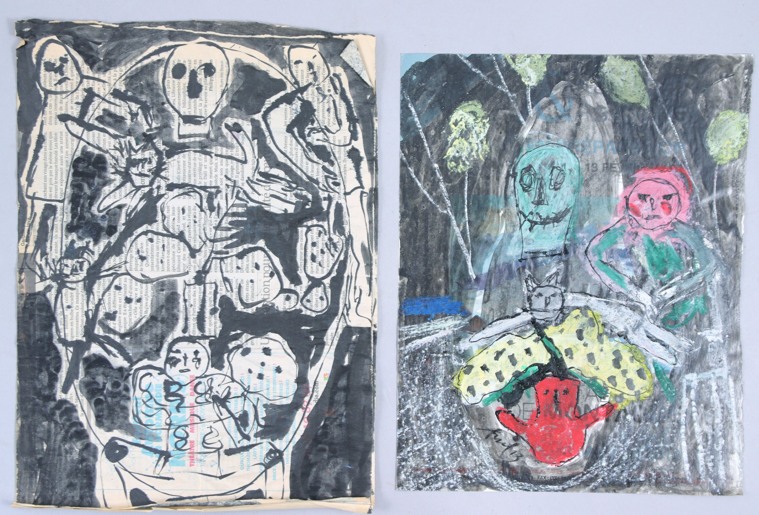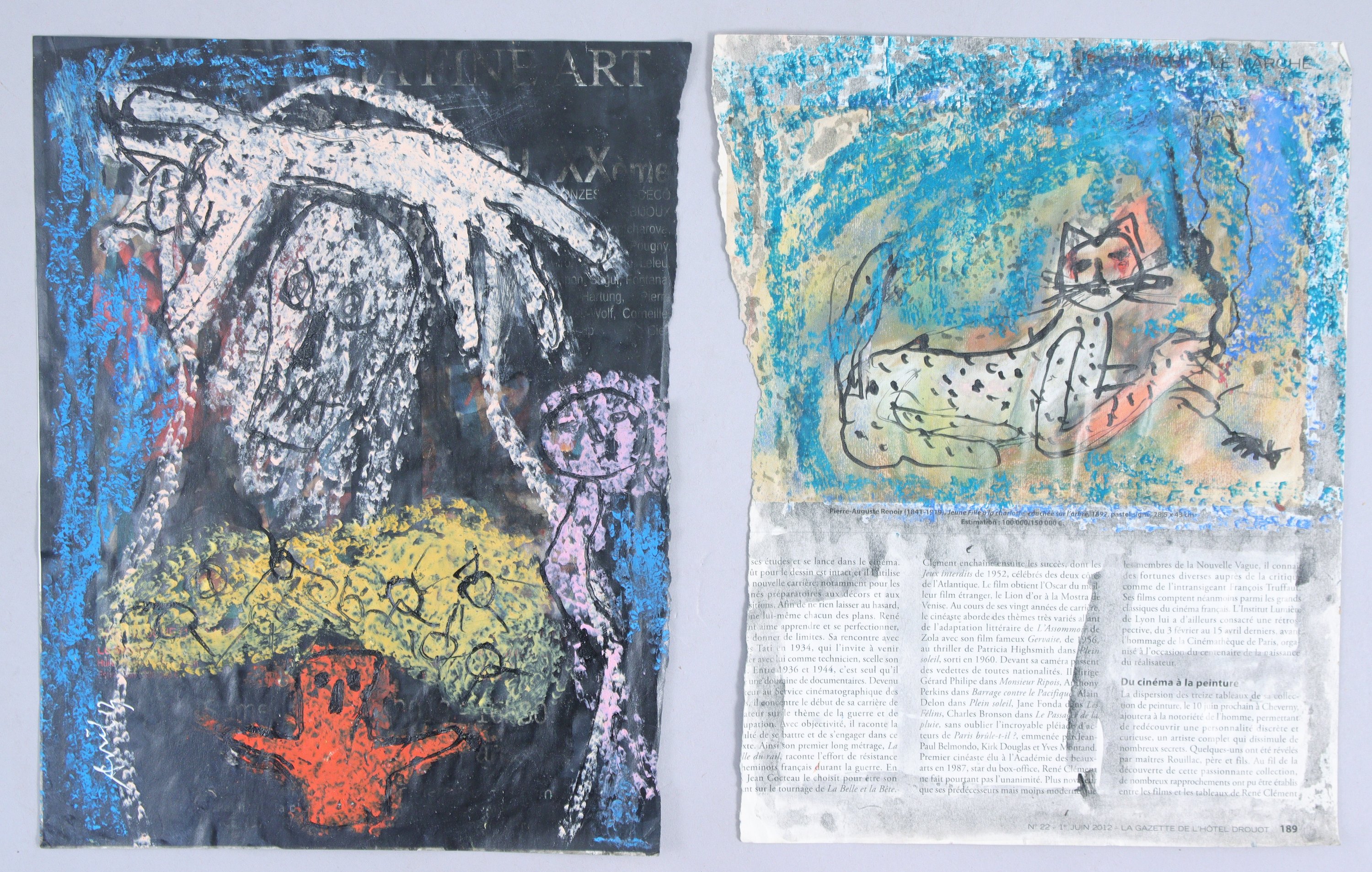 Cinq dessins sur papier journal ou sur les pages de la gazette Drouot
