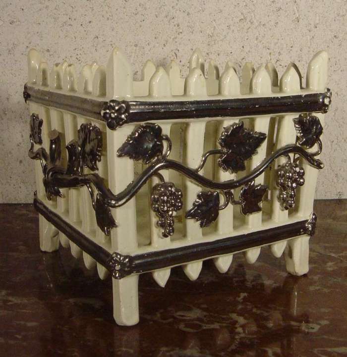 CORBEILLE blanche palissade, à décor platine de grappes de raisin, feuilles et pampres de vigne. Haut. 16 cm.
