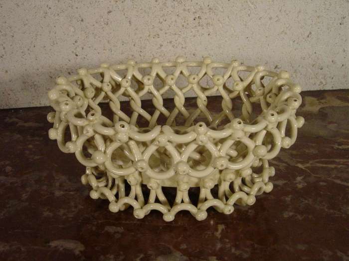 Petite CORBEILLE blanc crémeux tressée à décor blanc de baies. Lettre "F" en creux. Haut. 8,5 cm.