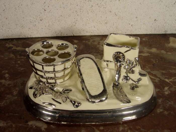 Ensemble FUMEUR blanc et platine sur terrasse, comprenant: porte-cigarettes, porte-allumettes et grattoir. Haut. 7,5 cm, Larg. 19 cm.