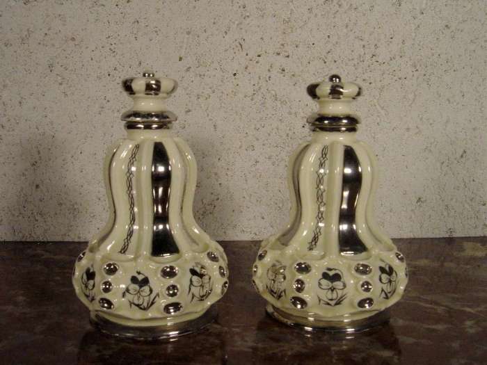 Paire de BRÛLE-PARFUMS blanc en forme de coloquinte, à côtes et à décor platine de fleurettes et motifs géométriques. Fretel en forme de fleurs stylisée. Marque d'un triangle au-dessous. (rest.) Haut. 13 cm.