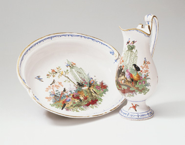 La forme du pot à eau est caractéristique de Saint-Clément, le modèle de Sceaux est beaucoup plus massif et la base est ornée de motifs rocailles en léger relief. Le brillant décor d'oiseaux est cependant très proche avec son treillage du motif que l'on retrouve sur la soupière et son présentoir de la Collection Desurmont-Motte, illustrée dans le "Répertoire de la faïence française", Paris 1933, tome V, page 114, planche 21.