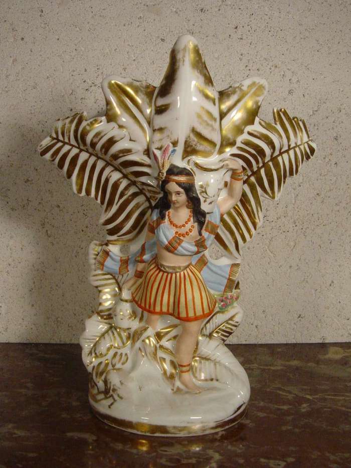 VIEUX PARIS. Paire de VASES à décor polychrome et or. Deux sujets, indien et indienne (?) en tenues de chasse s'échappent d'une nature arborescente de fougères et feuillages. XIXème. Haut. 28, Long. 23 cm.