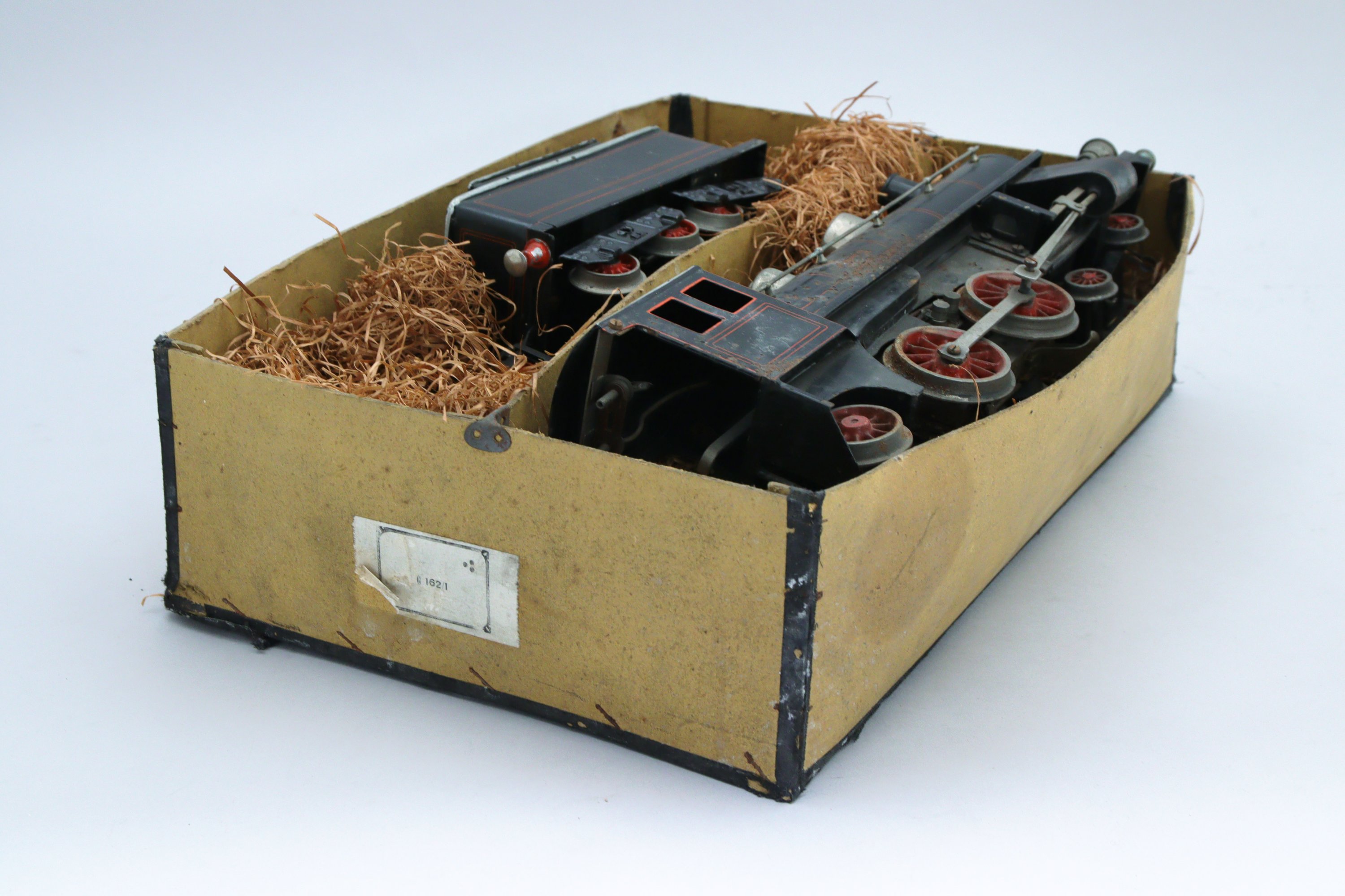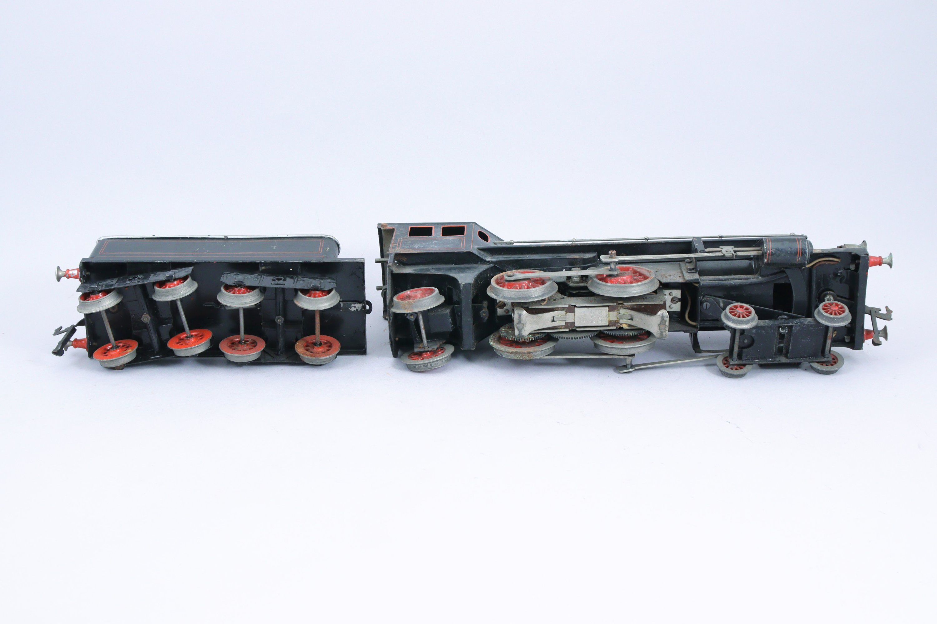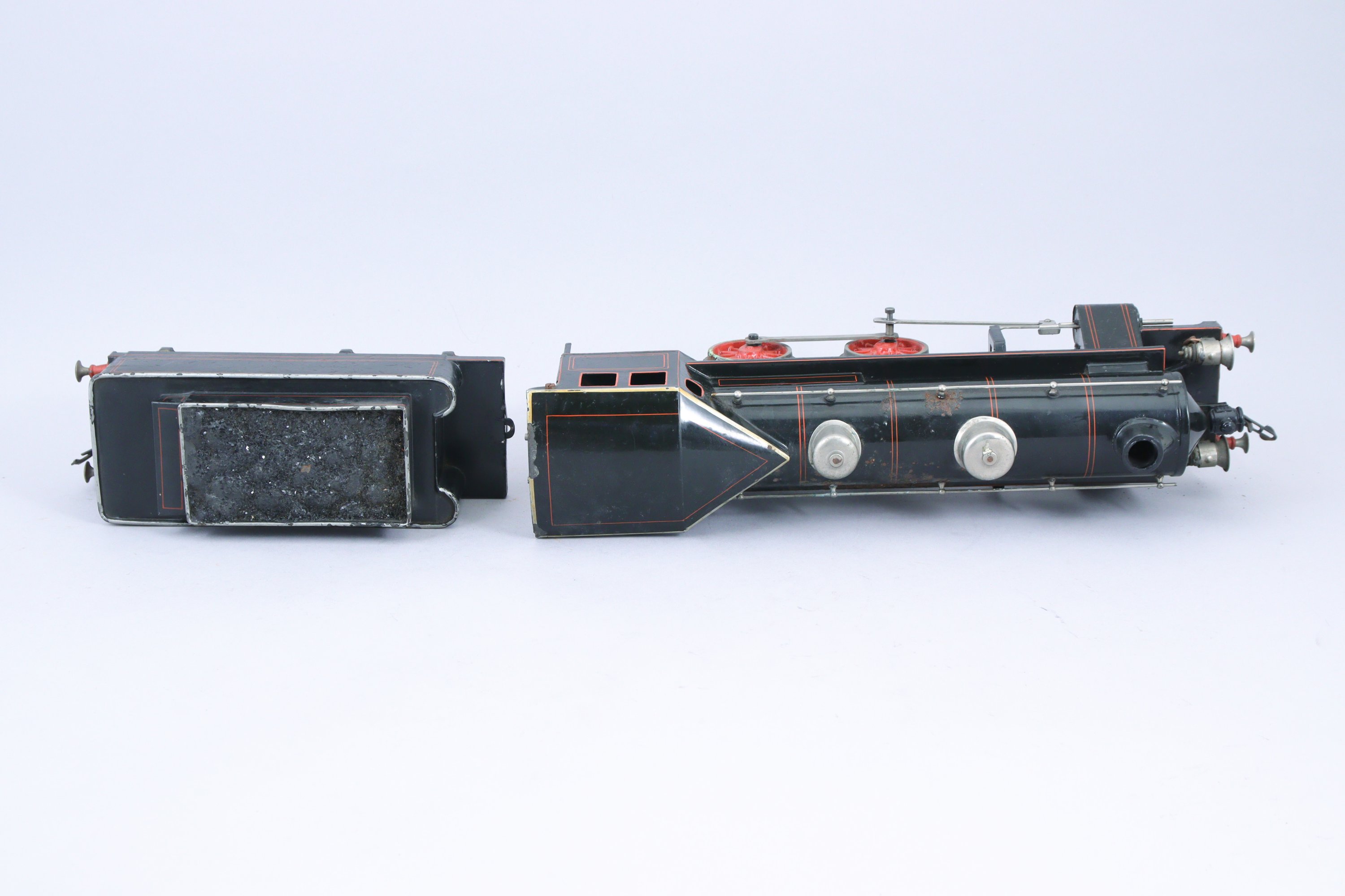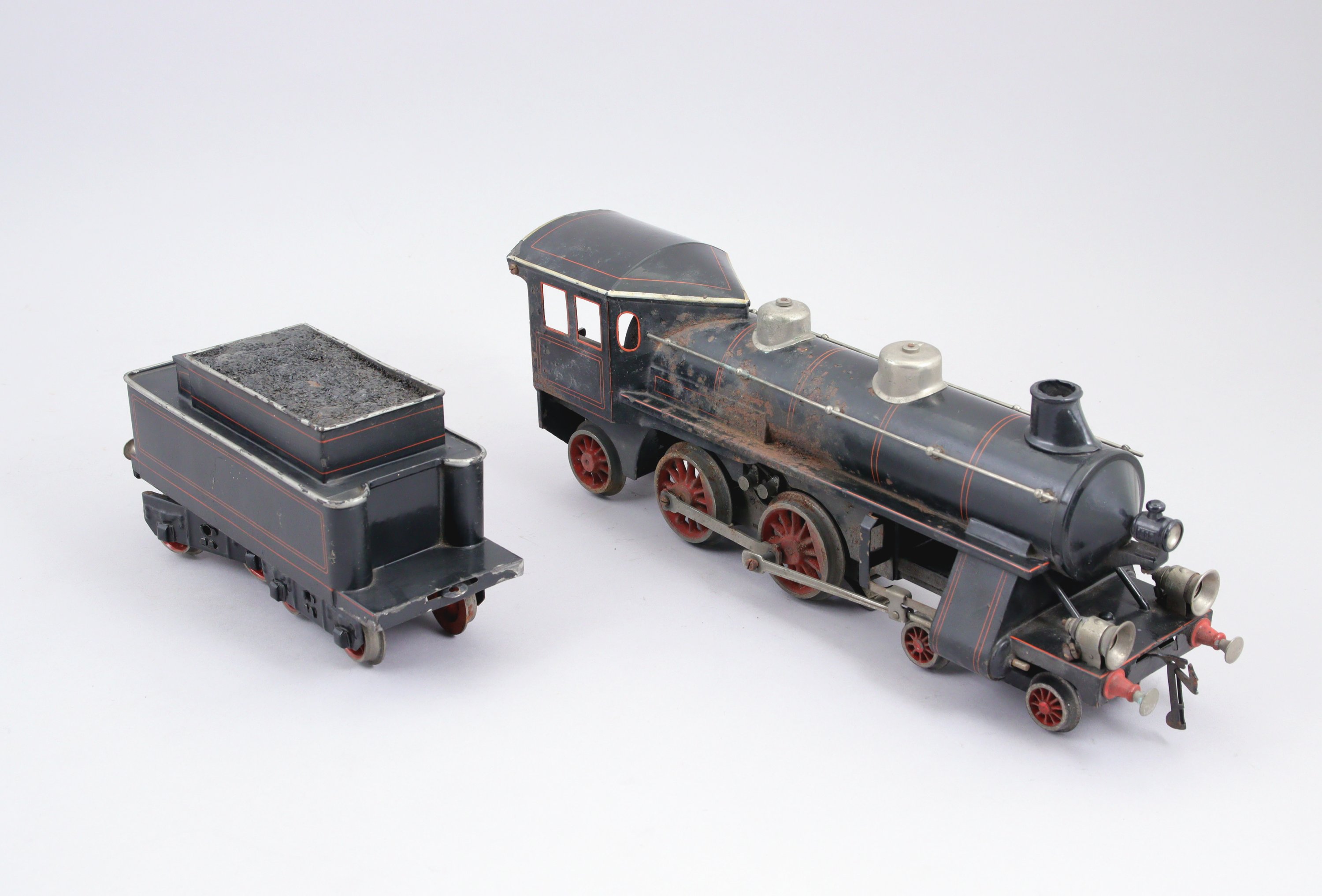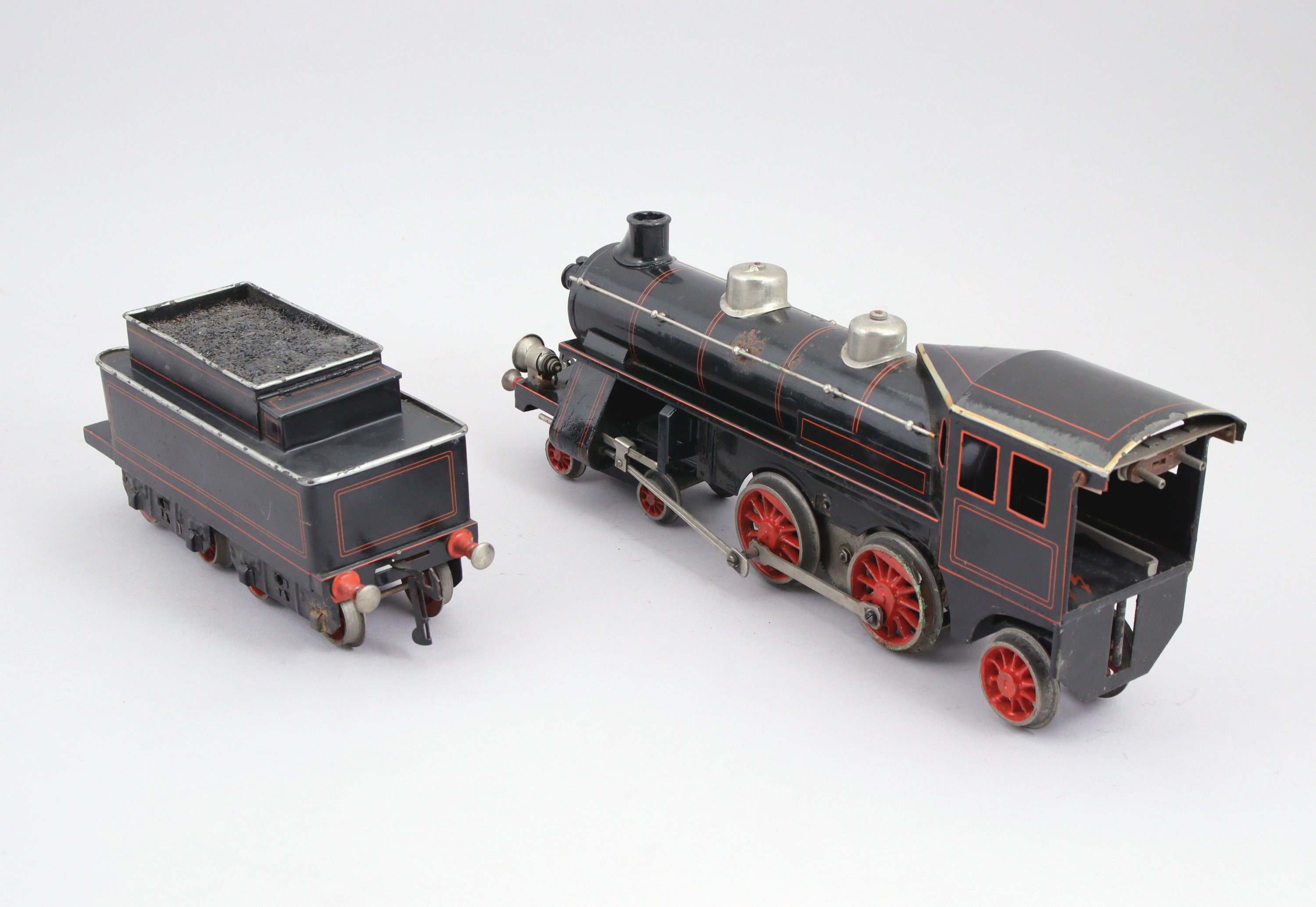 BING écartement 1, locomotive Atlantic type 221, électrique, noire à filet rouge, deux lampes à l'avant, cabine coupe vent.