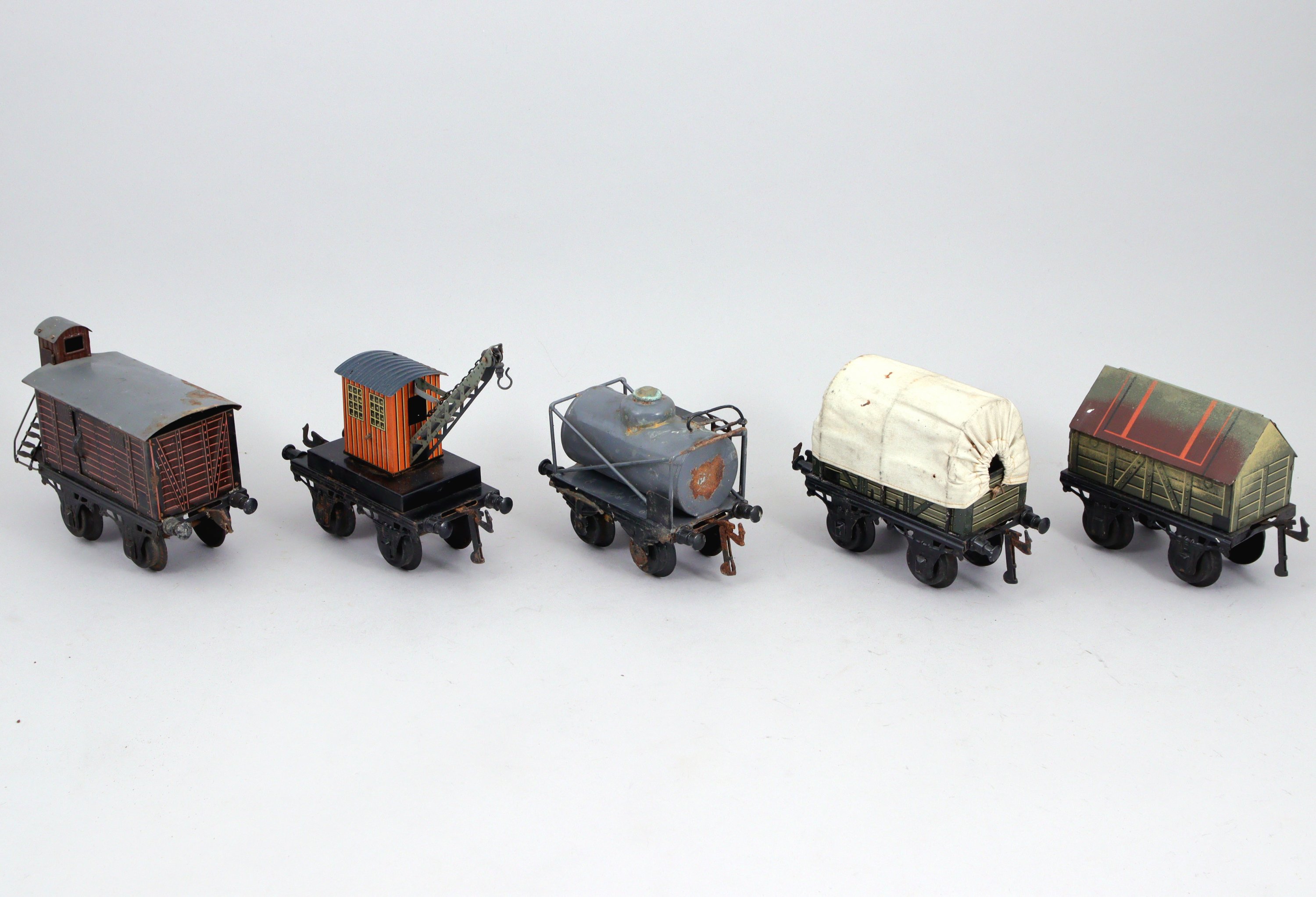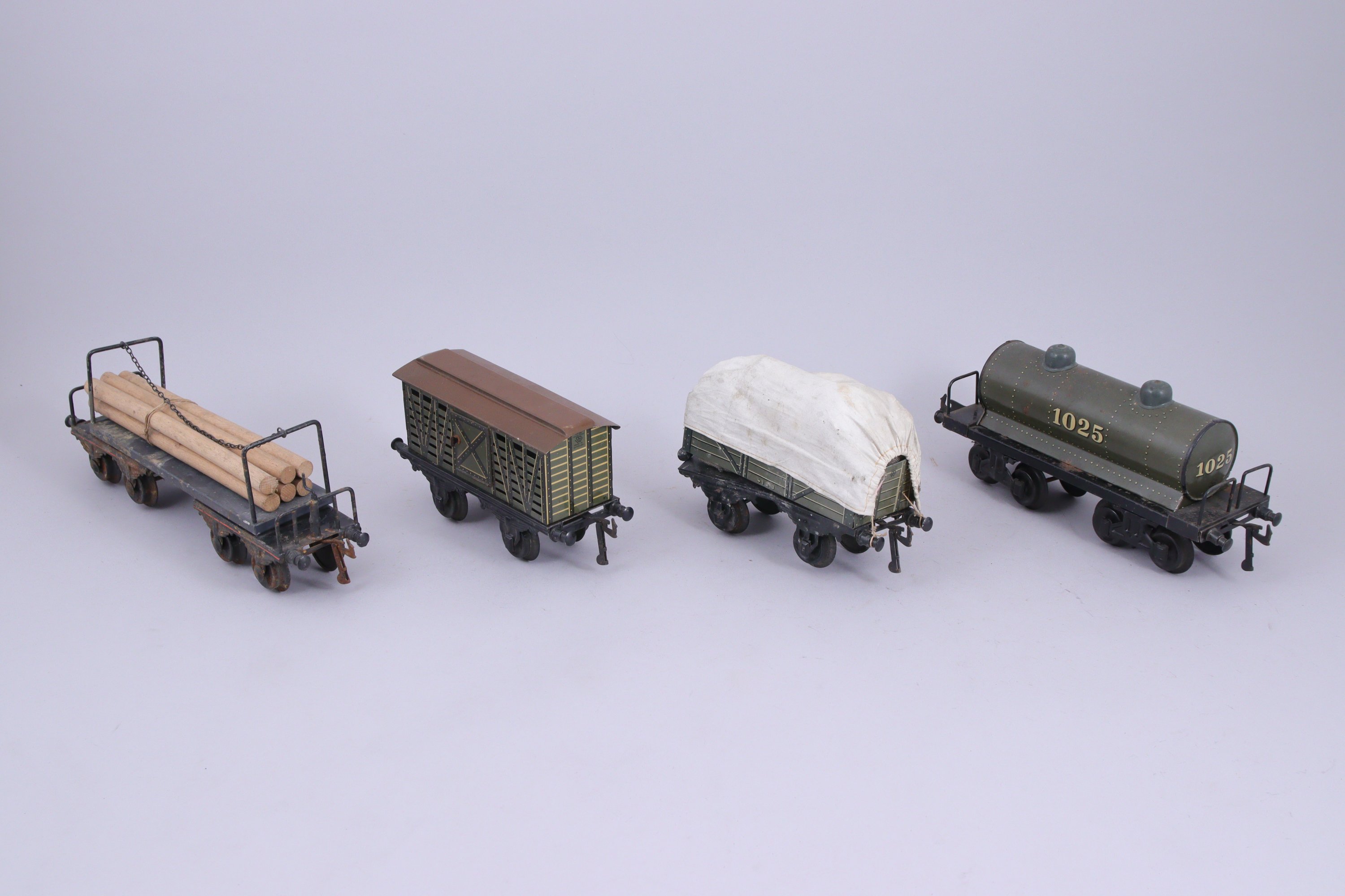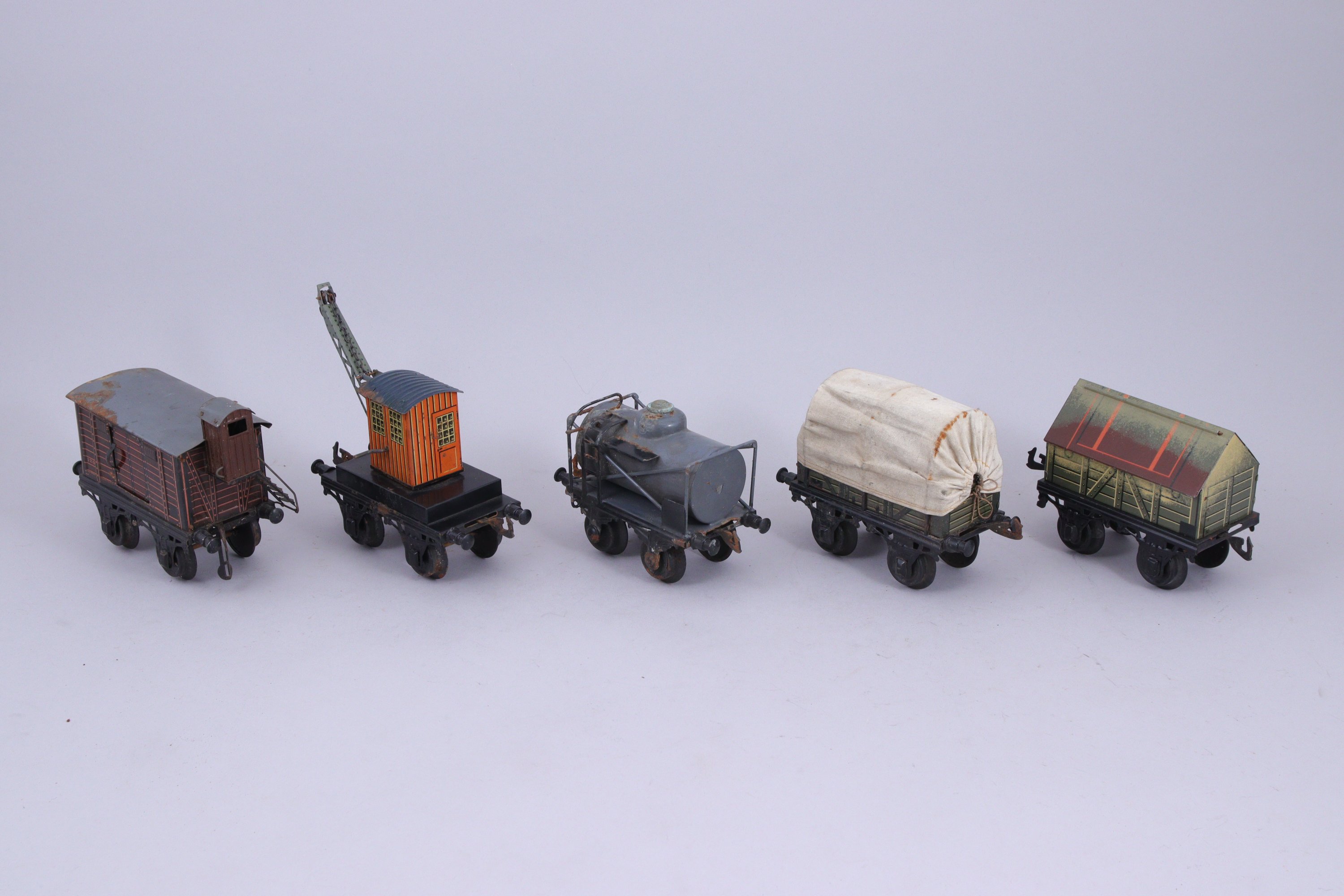 BING écartement 1, 18 wagons lithographiés, 16 à essieux et 2 à bogie, dont transport de bière, citernes (2), grue, transport de bestiaux (2)...