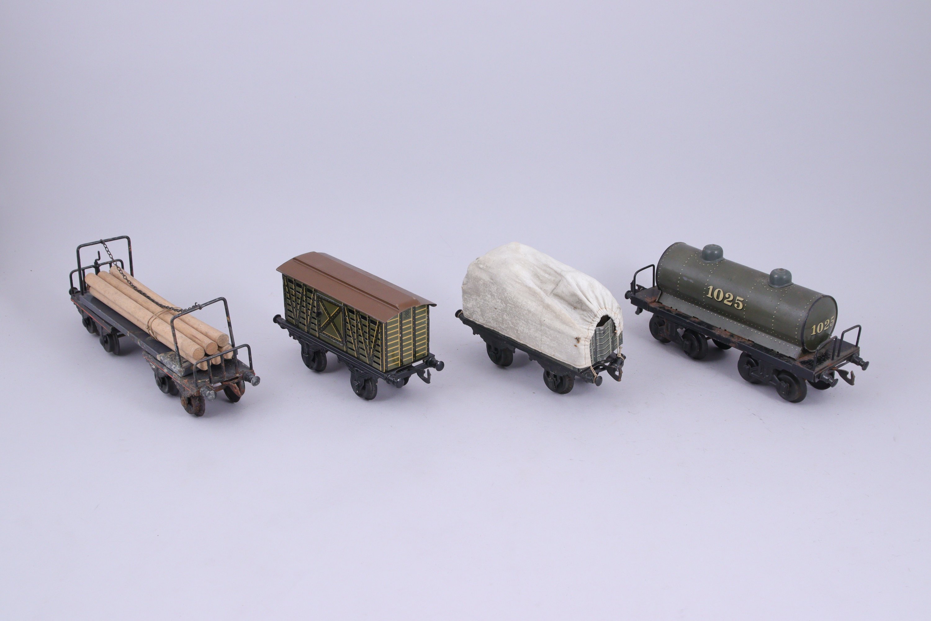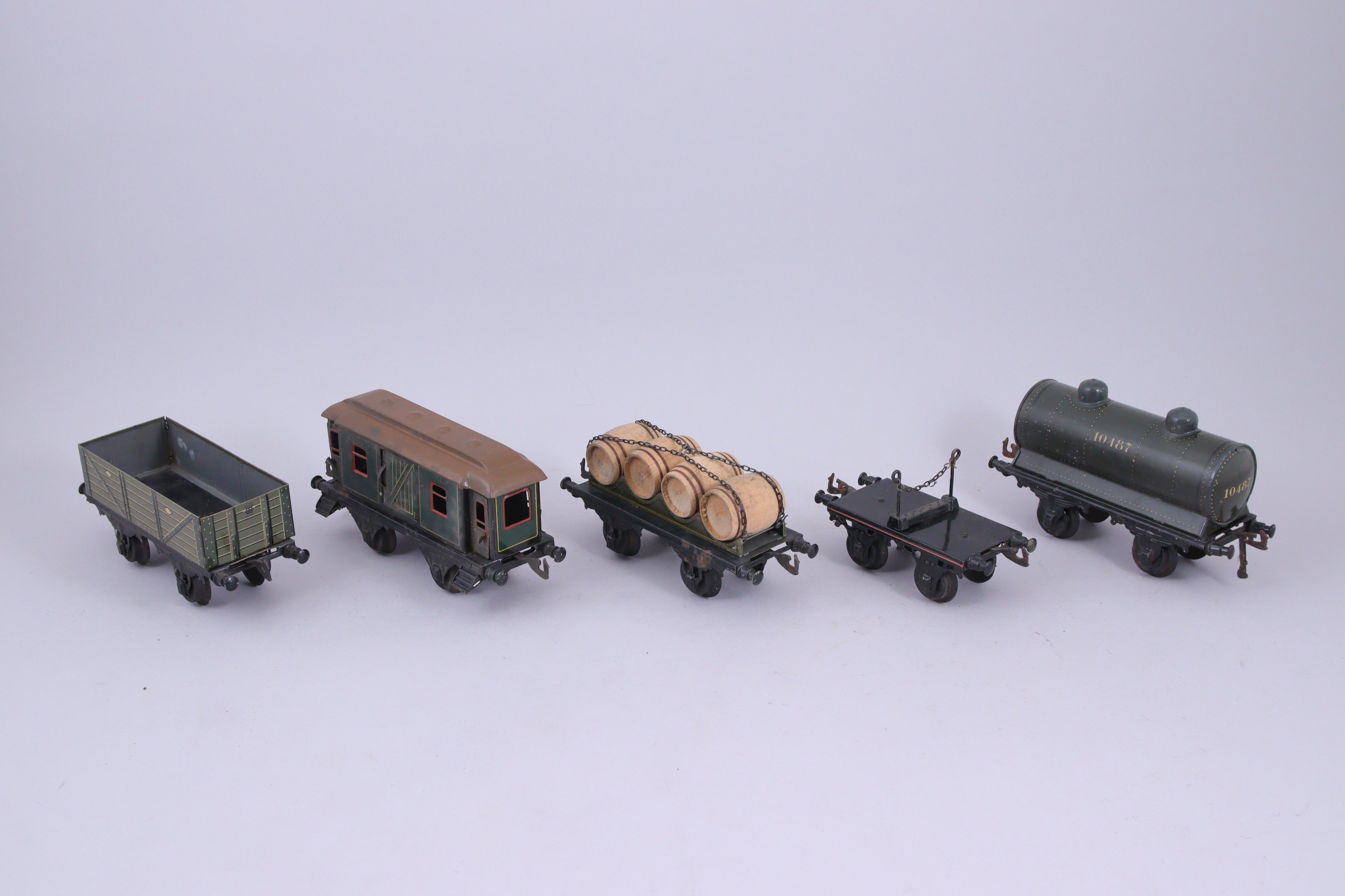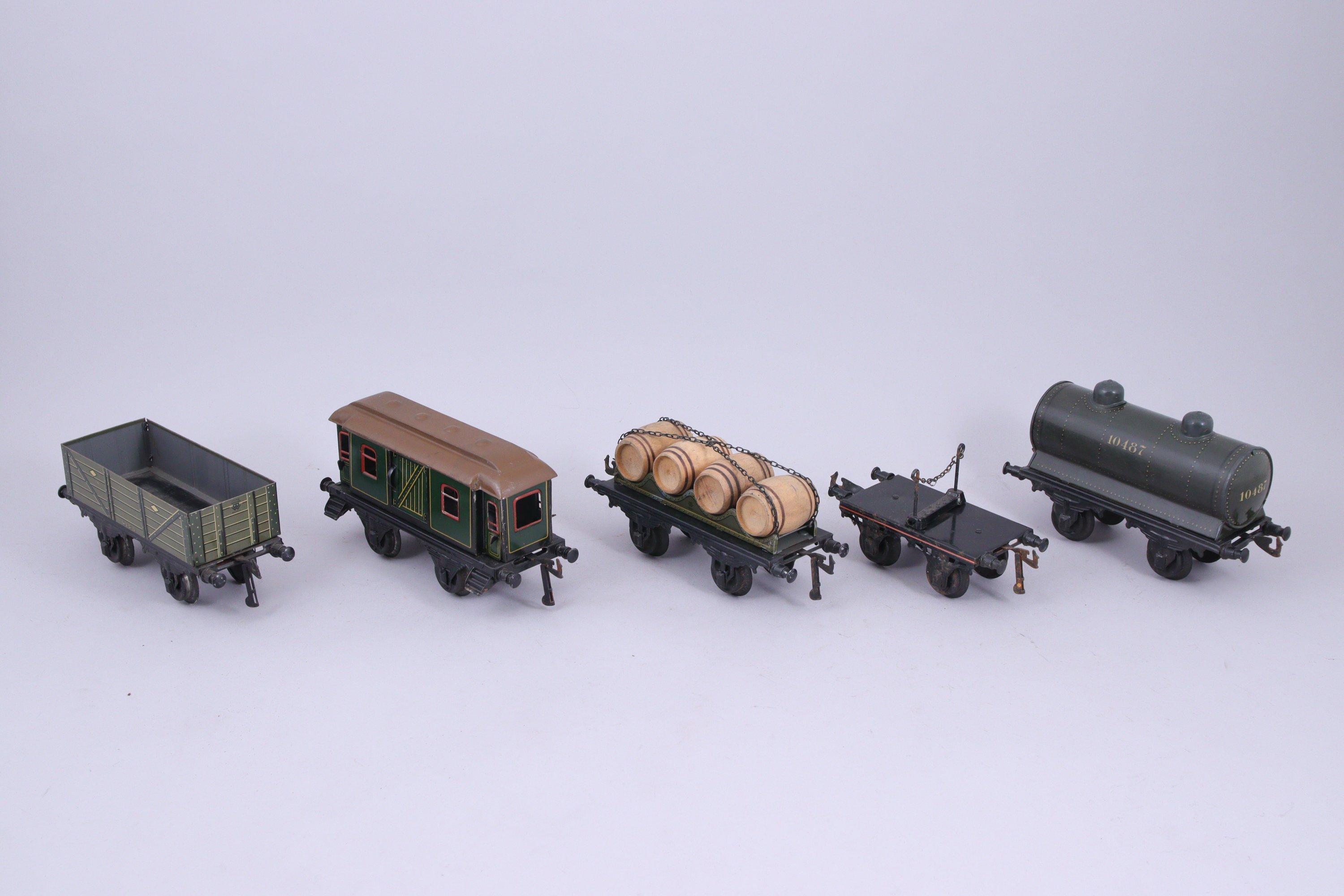 BING écartement 1, 18 wagons lithographiés, 16 à essieux et 2 à bogie, dont transport de bière, citernes (2), grue, transport de bestiaux (2)...