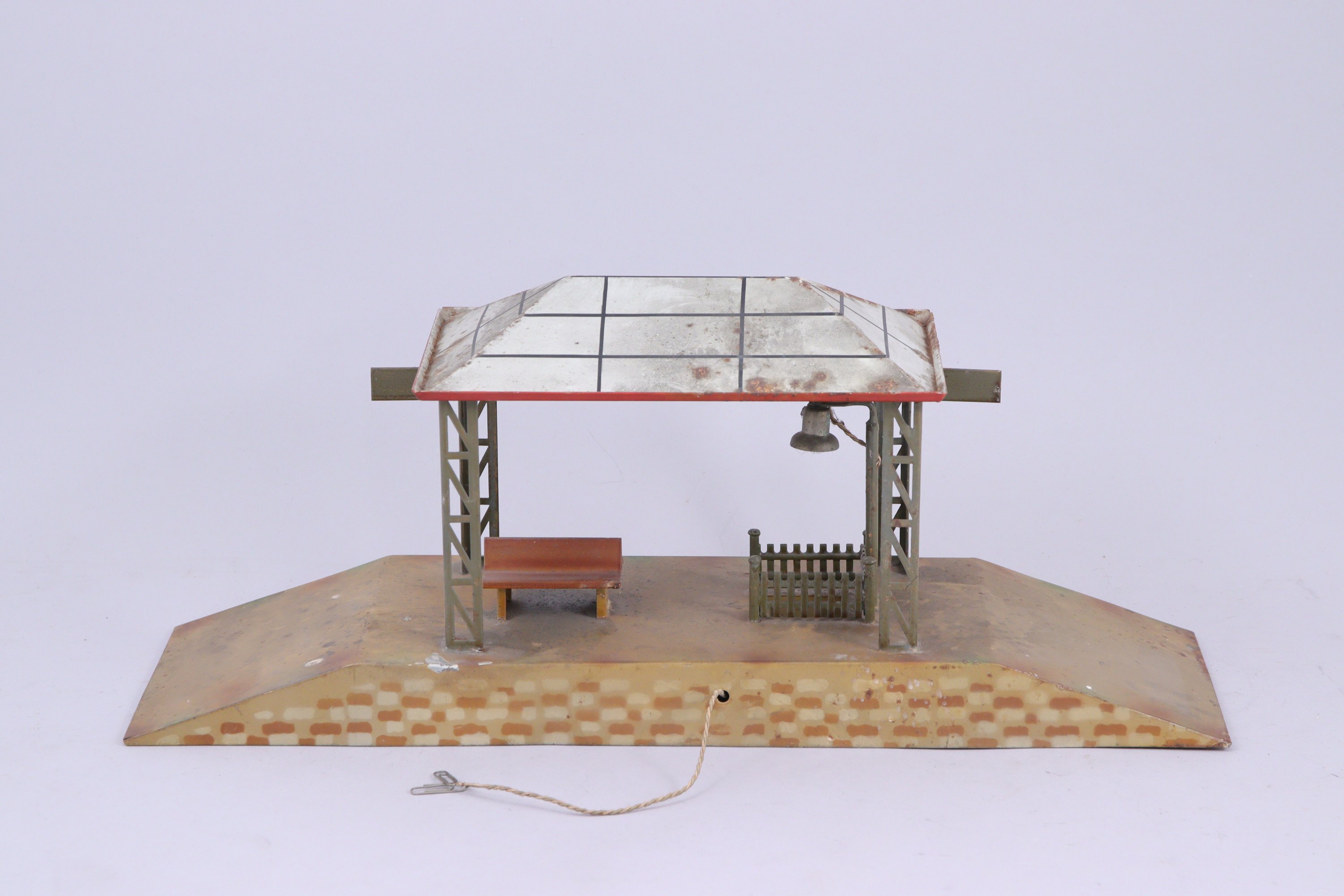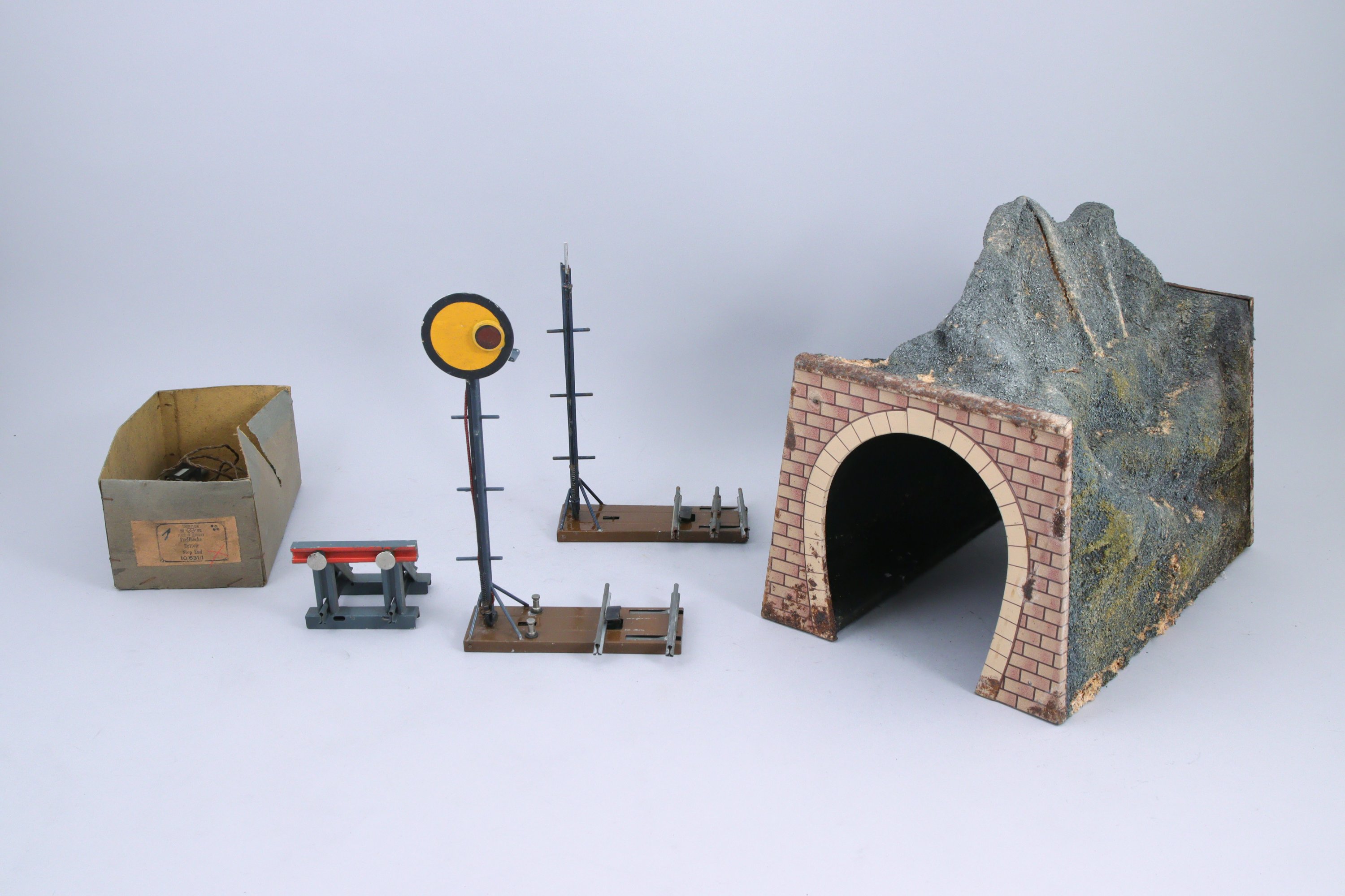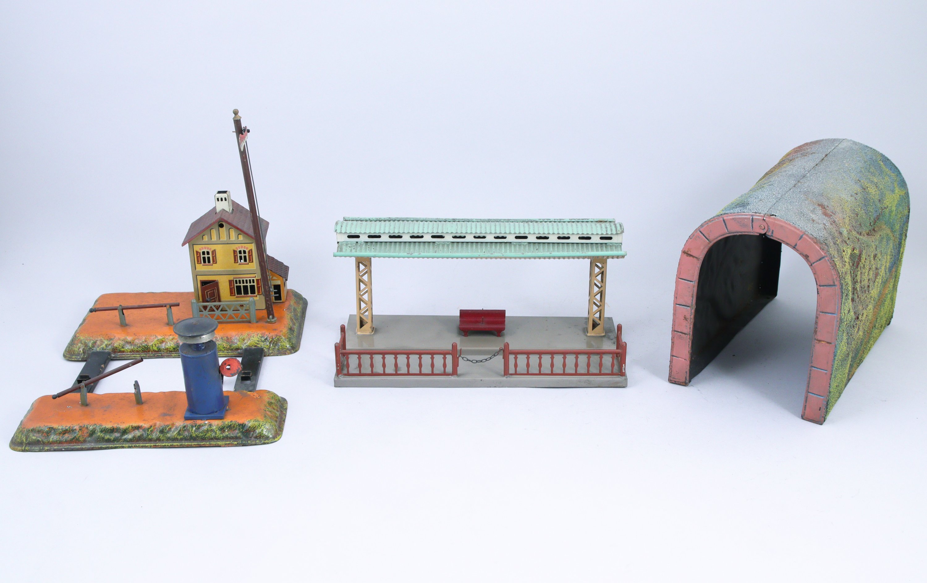 BING bel ensemble d'accessoires de réseau écartement 1, gare, quai-verrière réglable, deux signaux, quai, tunnel en bois et carton, gare de campagne (dans l'état).