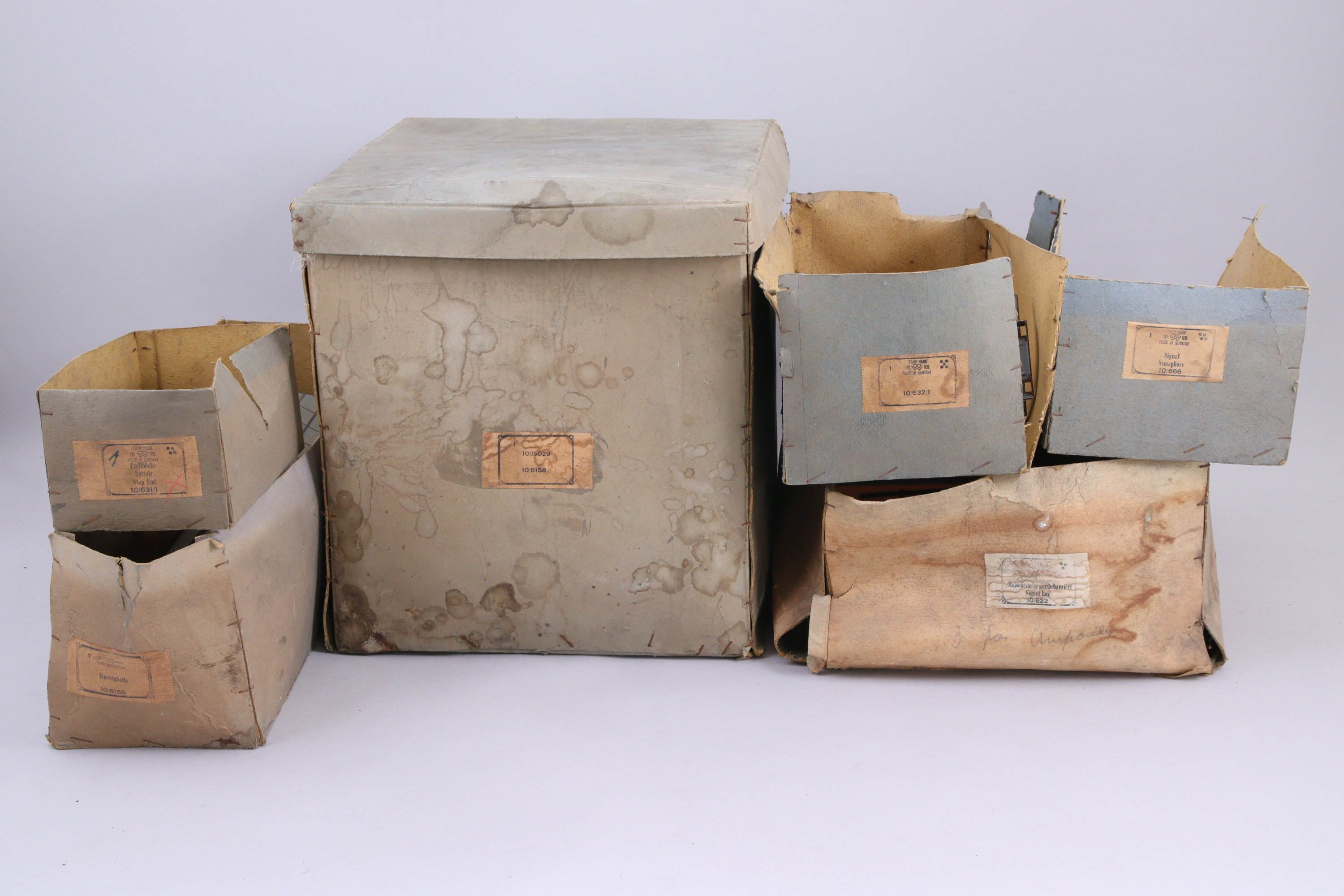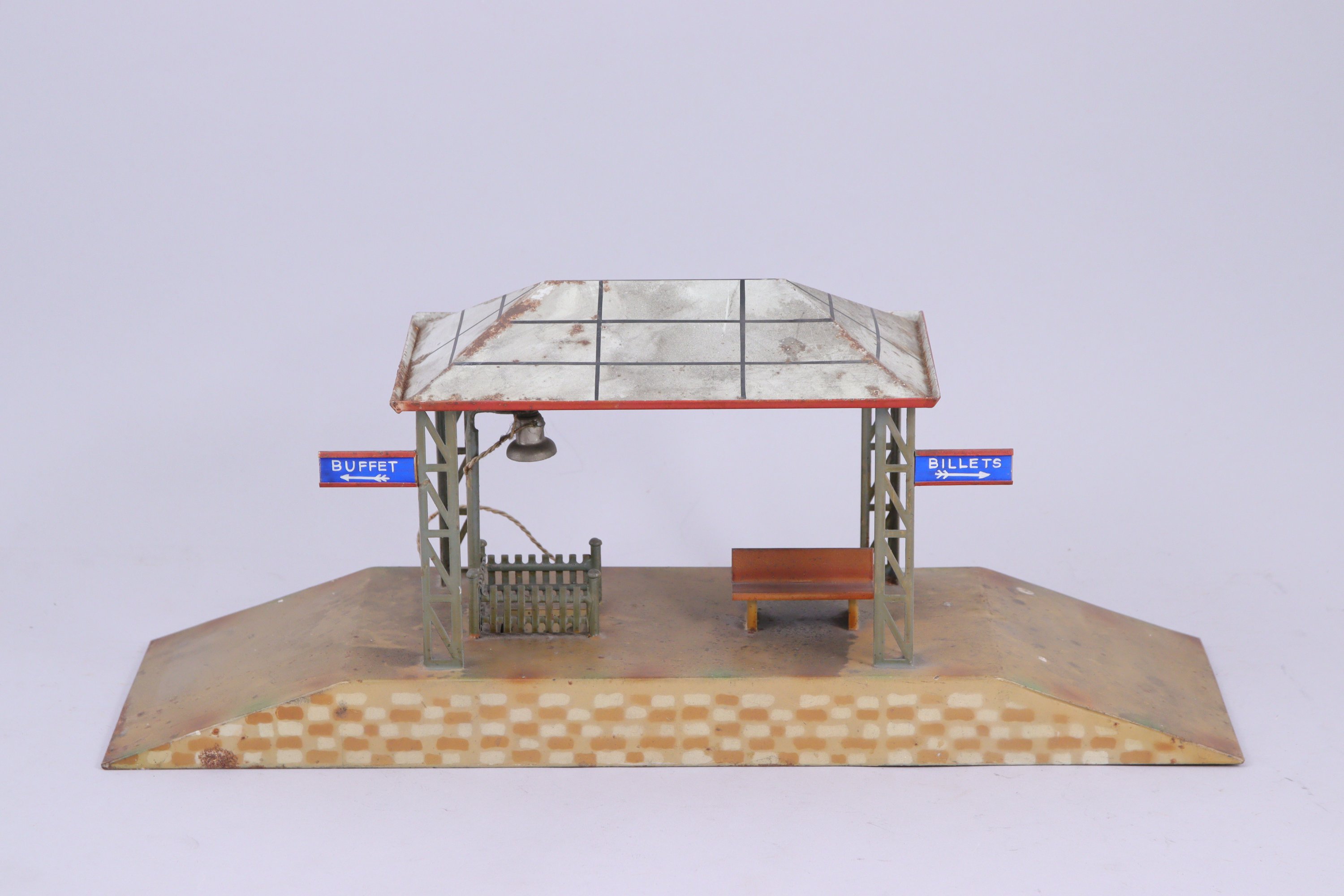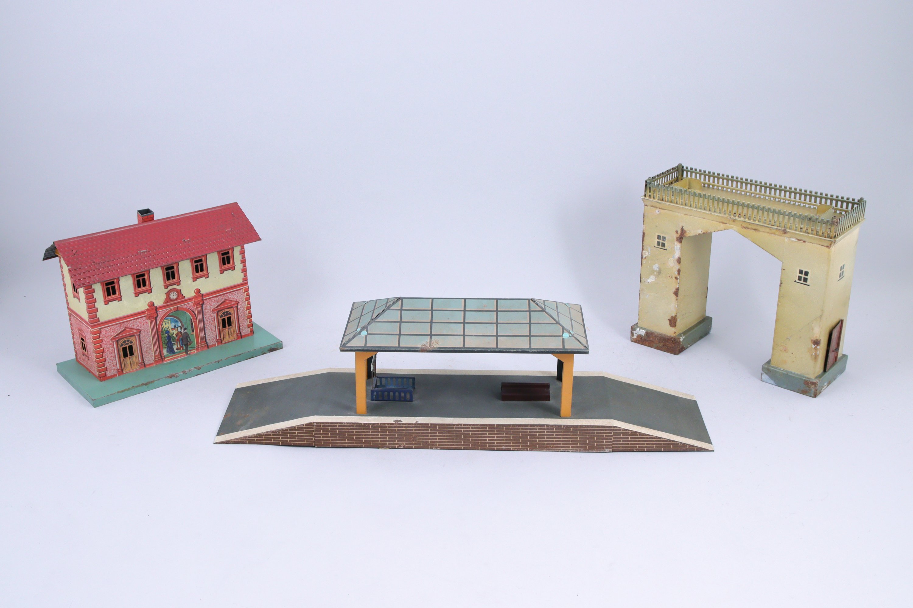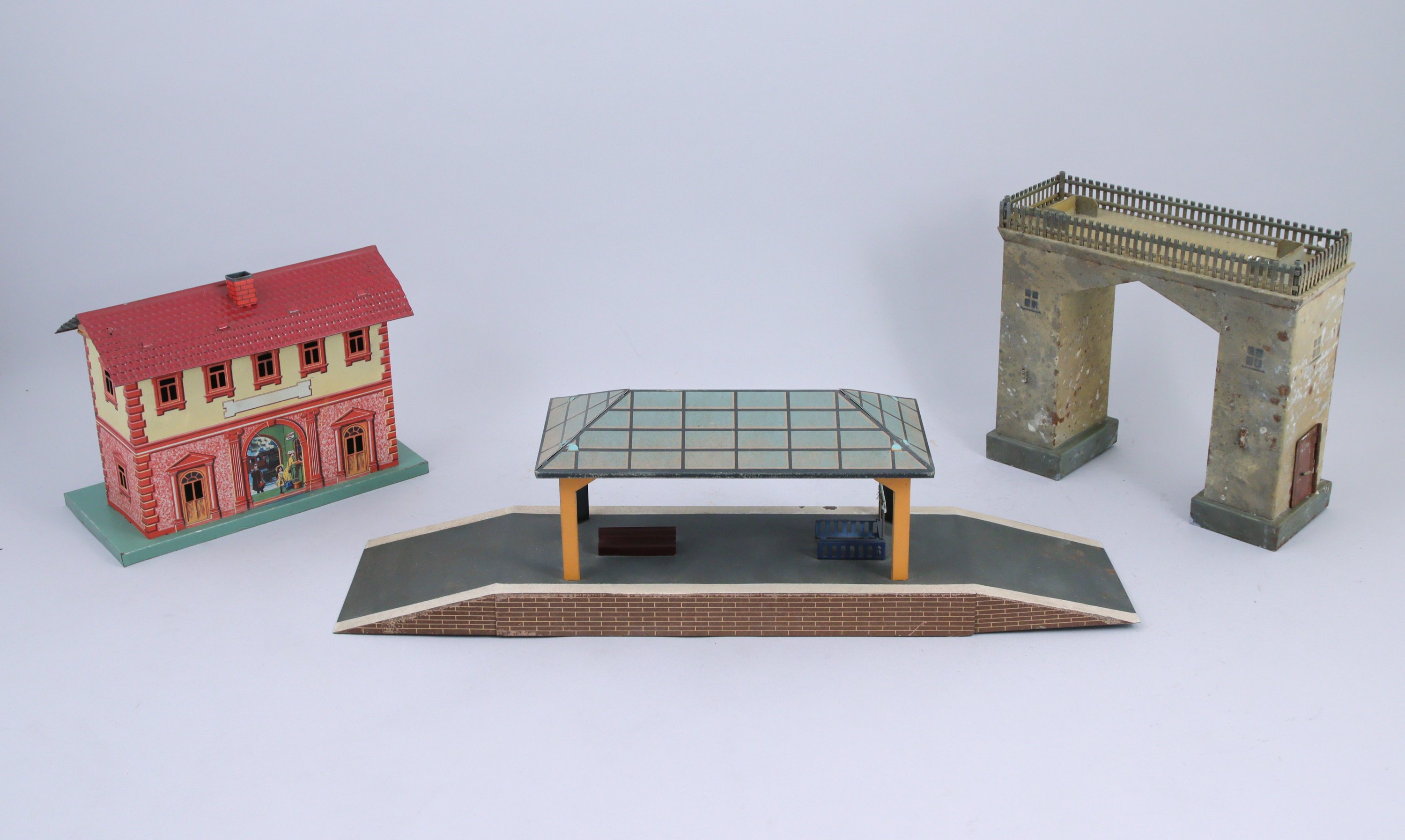BING bel ensemble d'accessoires de réseau écartement 1, gare, quai-verrière réglable, deux signaux, quai, tunnel en bois et carton, gare de campagne (dans l'état).