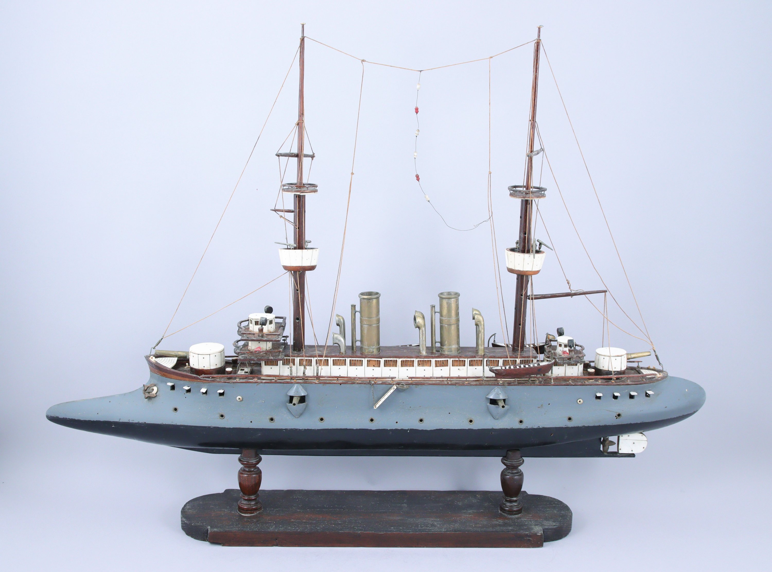 Pourvu d'un long éperon et deux mâts, le navire présente deux grandes cheminées et six petites à l'extrémité courbée. Le bateau est armé de différents calibres, dont les plus petits en haut des vigies, les plus gros sur les tourelles de proue et poupe. La maquette repose sur un socle en bois surélevé de deux colonnes balustres.