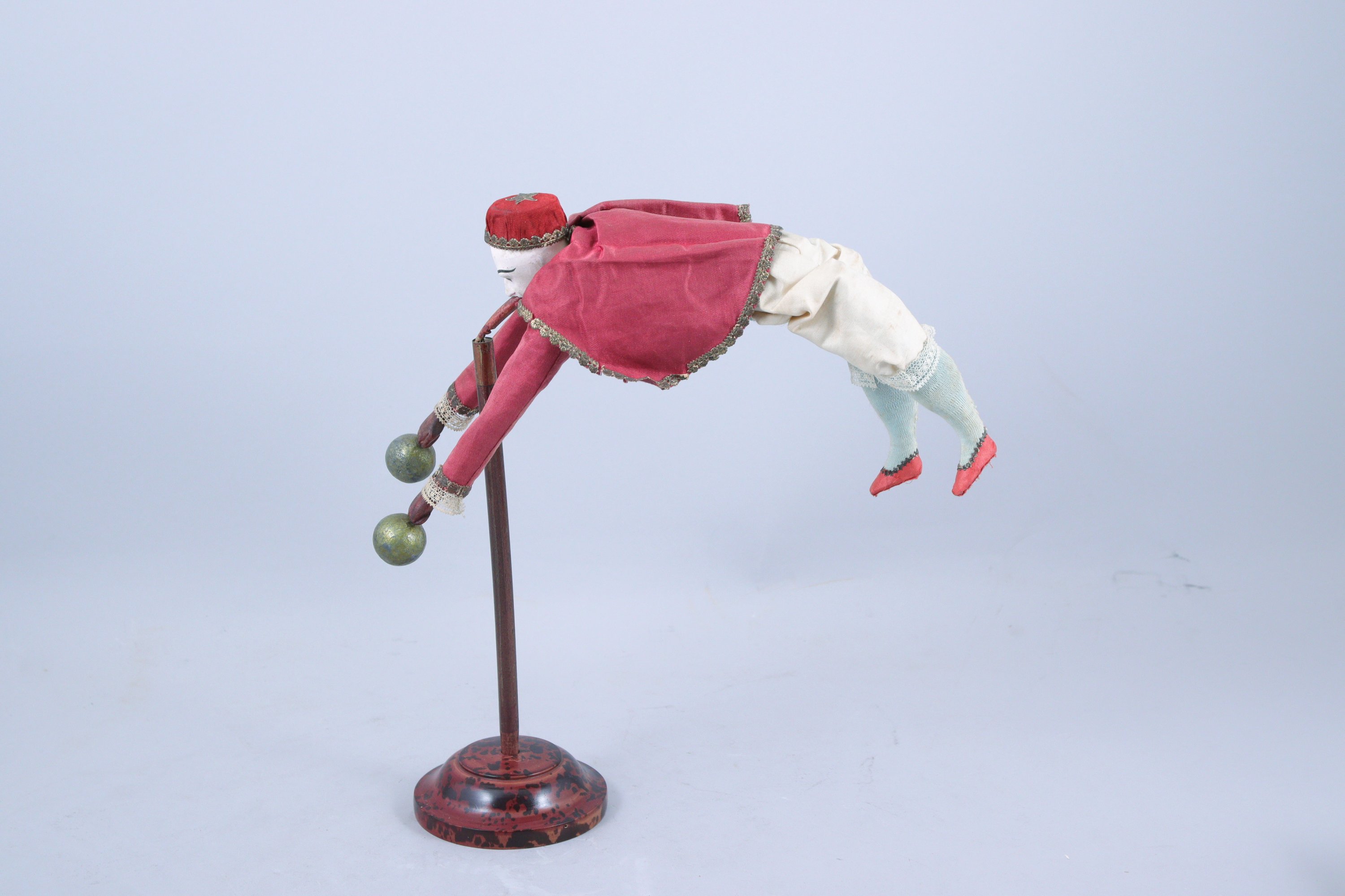 Personnage en bois, papier mâché et tissu, les mains se terminant par des sphères en plomb. La figure grimée et coiffé d'une sorte de fez.