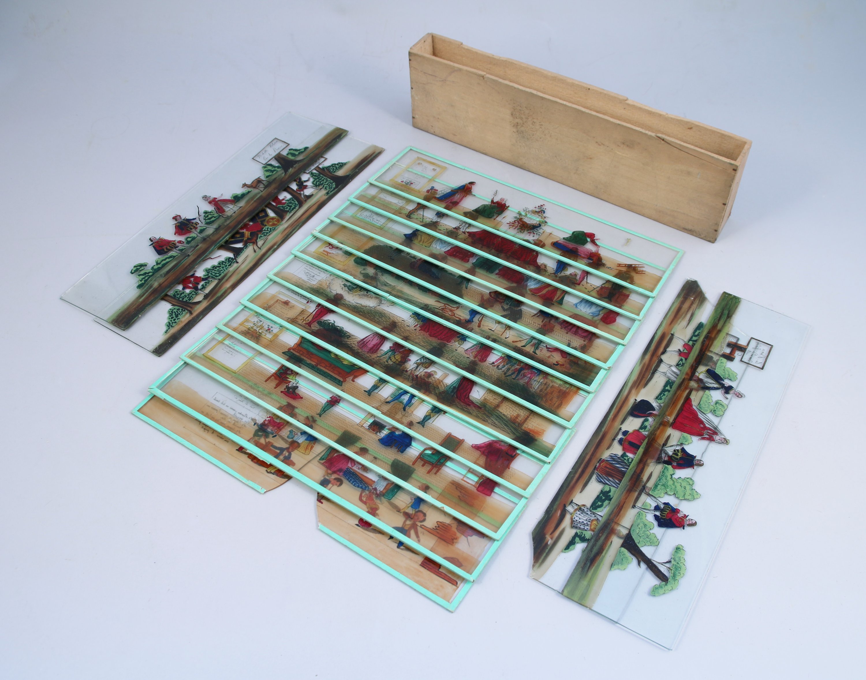 21 PLAQUES de LANTERNE MAGIQUE en verre, de forme rectangulaire,...