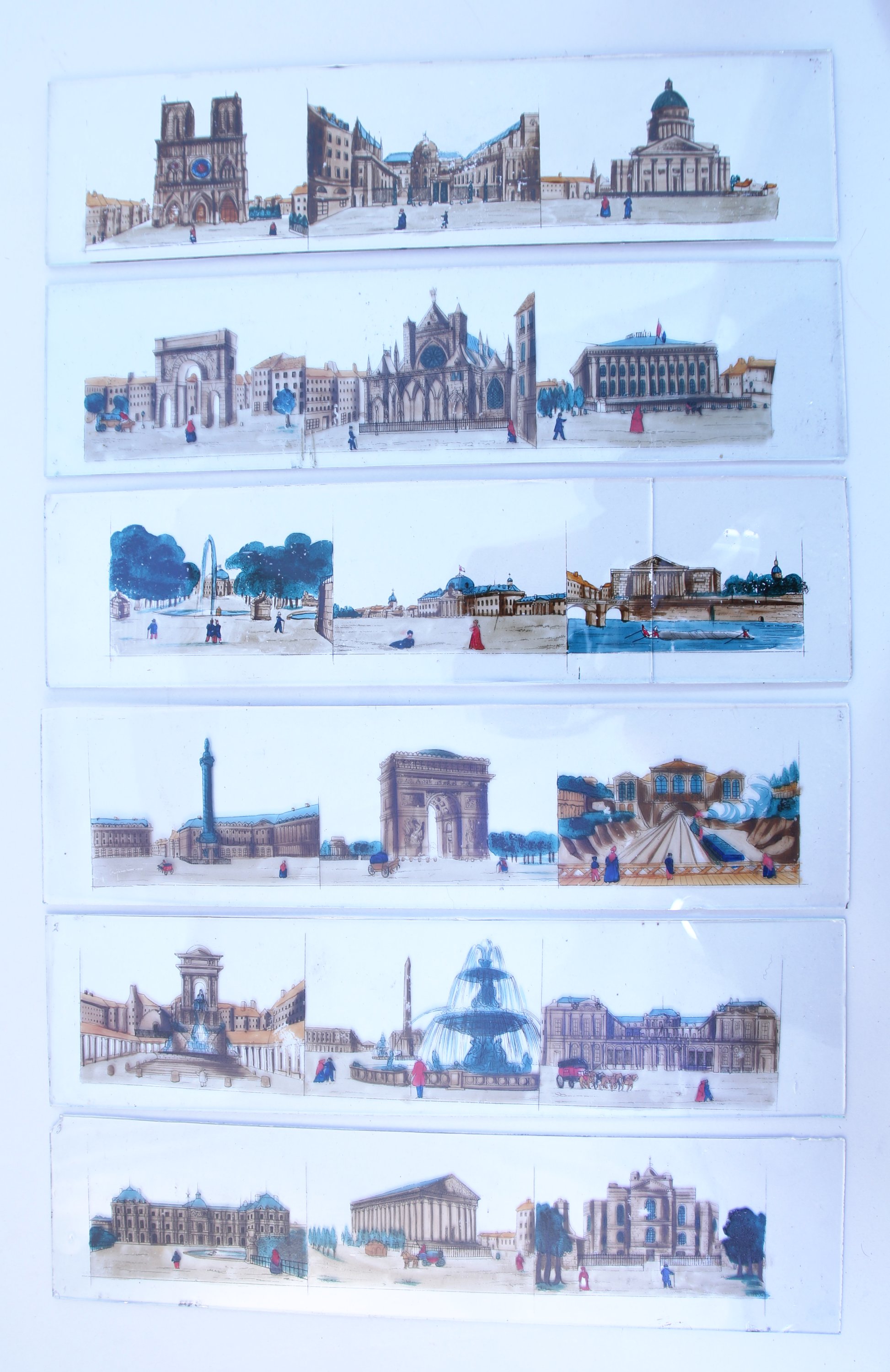 21 PLAQUES de LANTERNE MAGIQUE en verre, de forme rectangulaire, peintes de contes de fée dont "La Belle au bois dormant" et de vues des monuments de Paris.