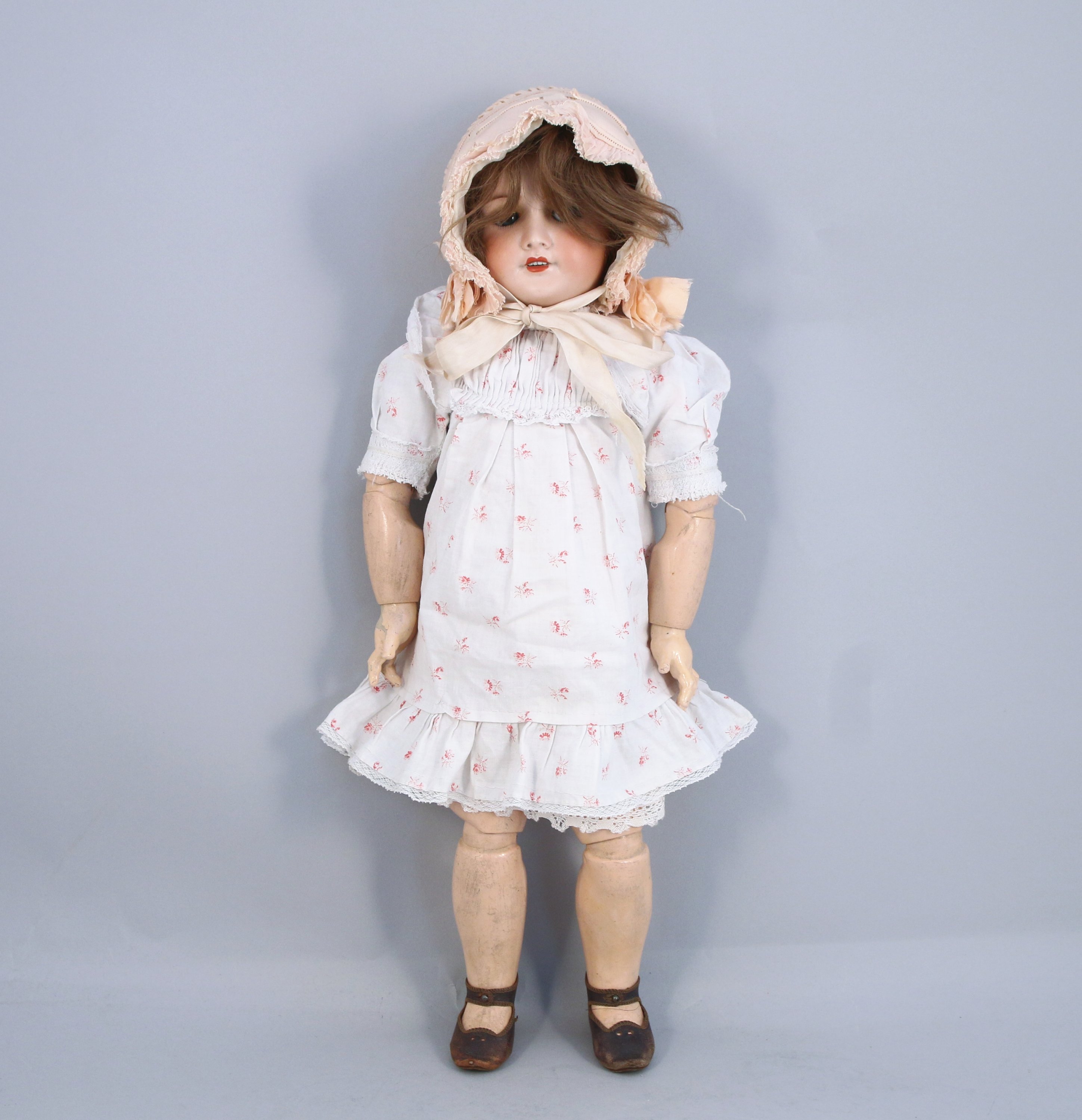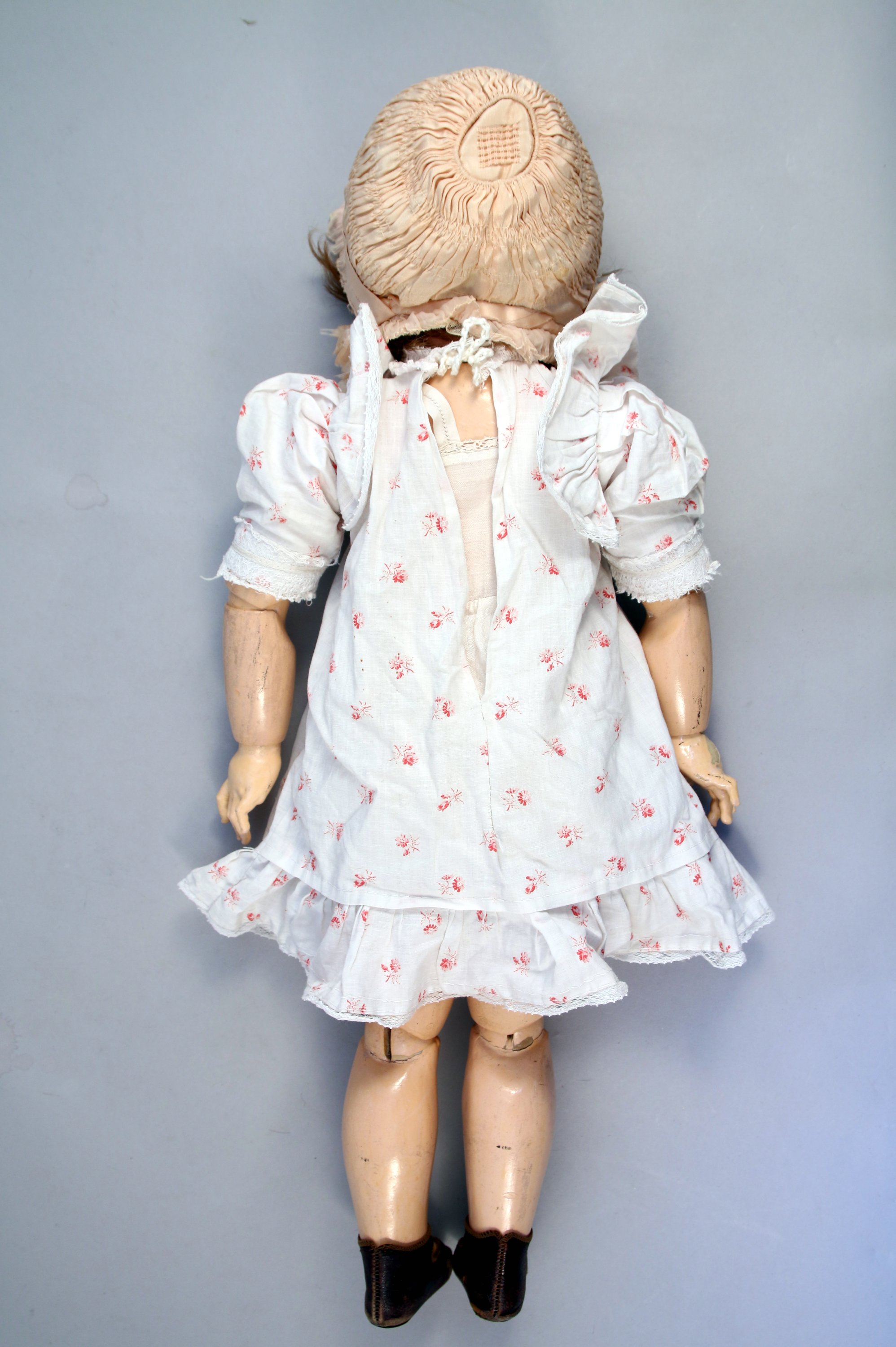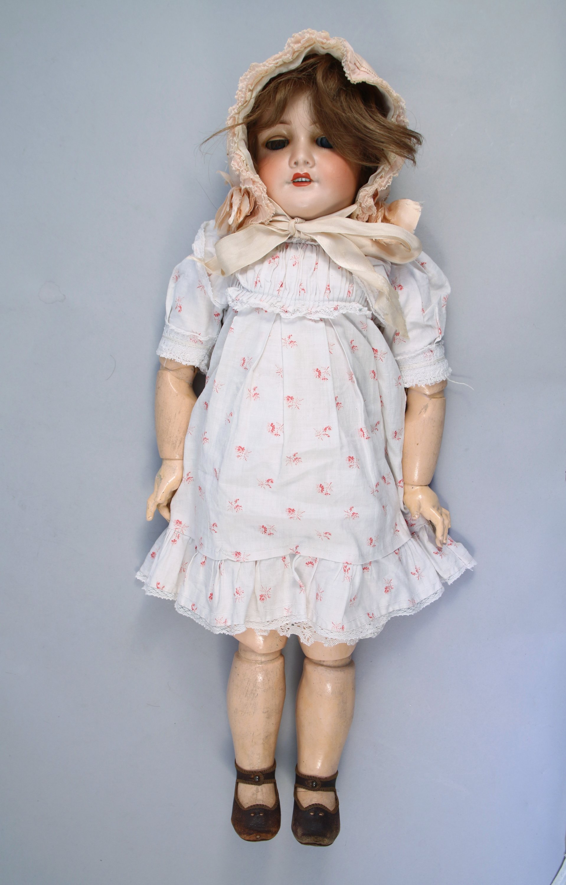 UNIFRANCE. POUPÉE tête porcelaine, moule 301, taille 10 (cassée et réparée). Corps articulé. Robe à fleurettes rouges usées, et chaussures jumeaux taille 9.