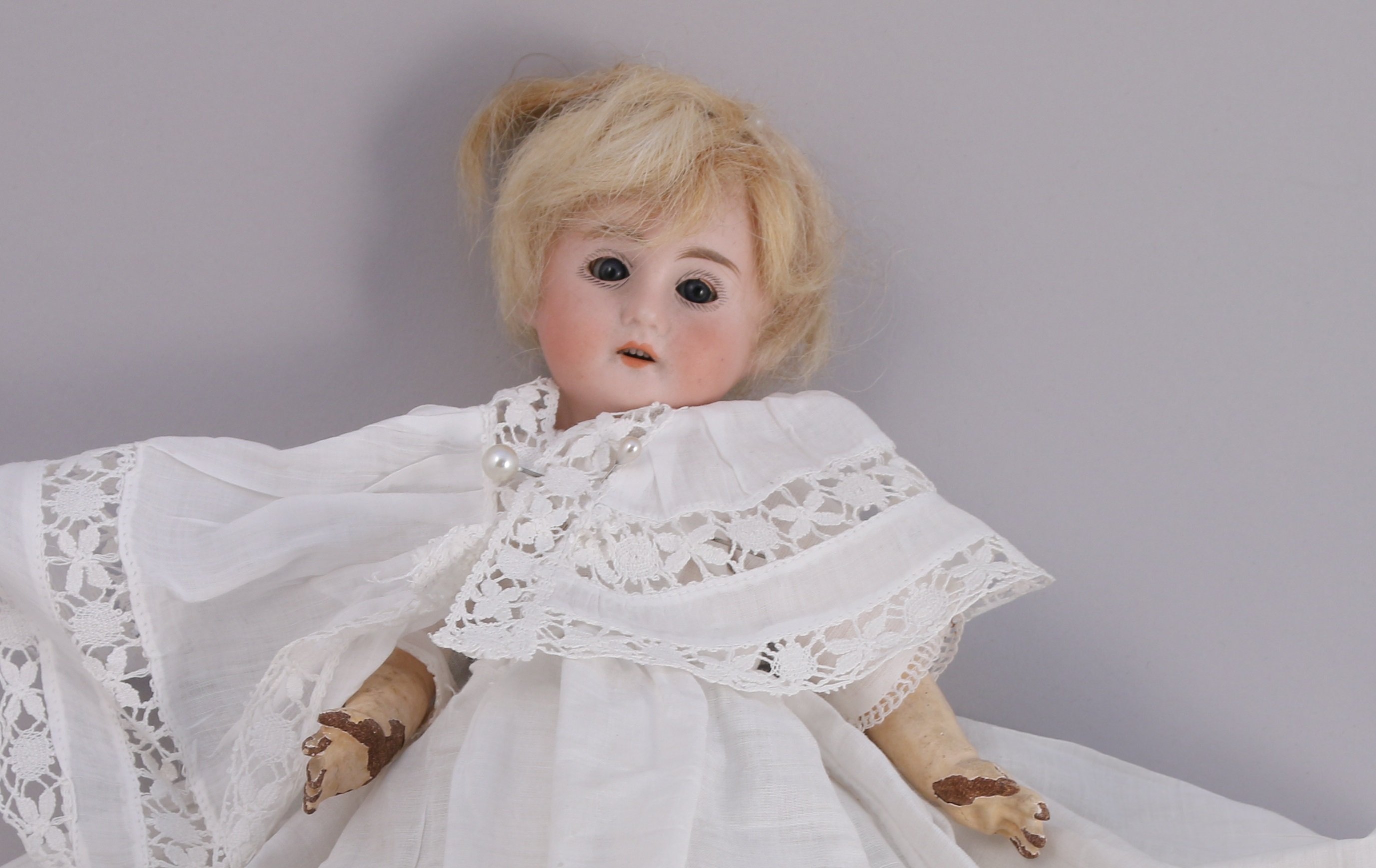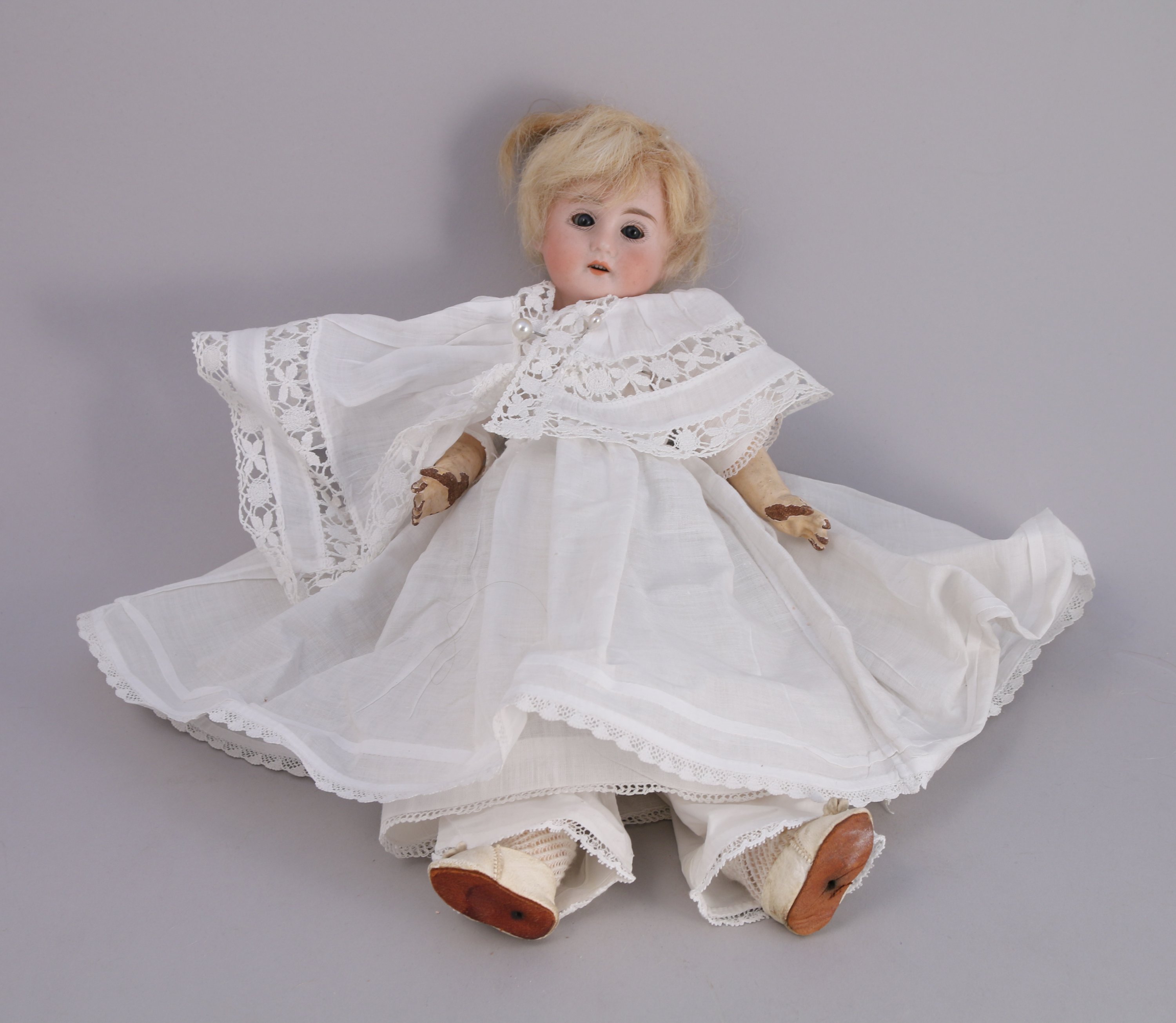 POUPÉE, tête porcelaine allemande taille 4/0. Yeux bleus dormeurs, corps semi-articulé.