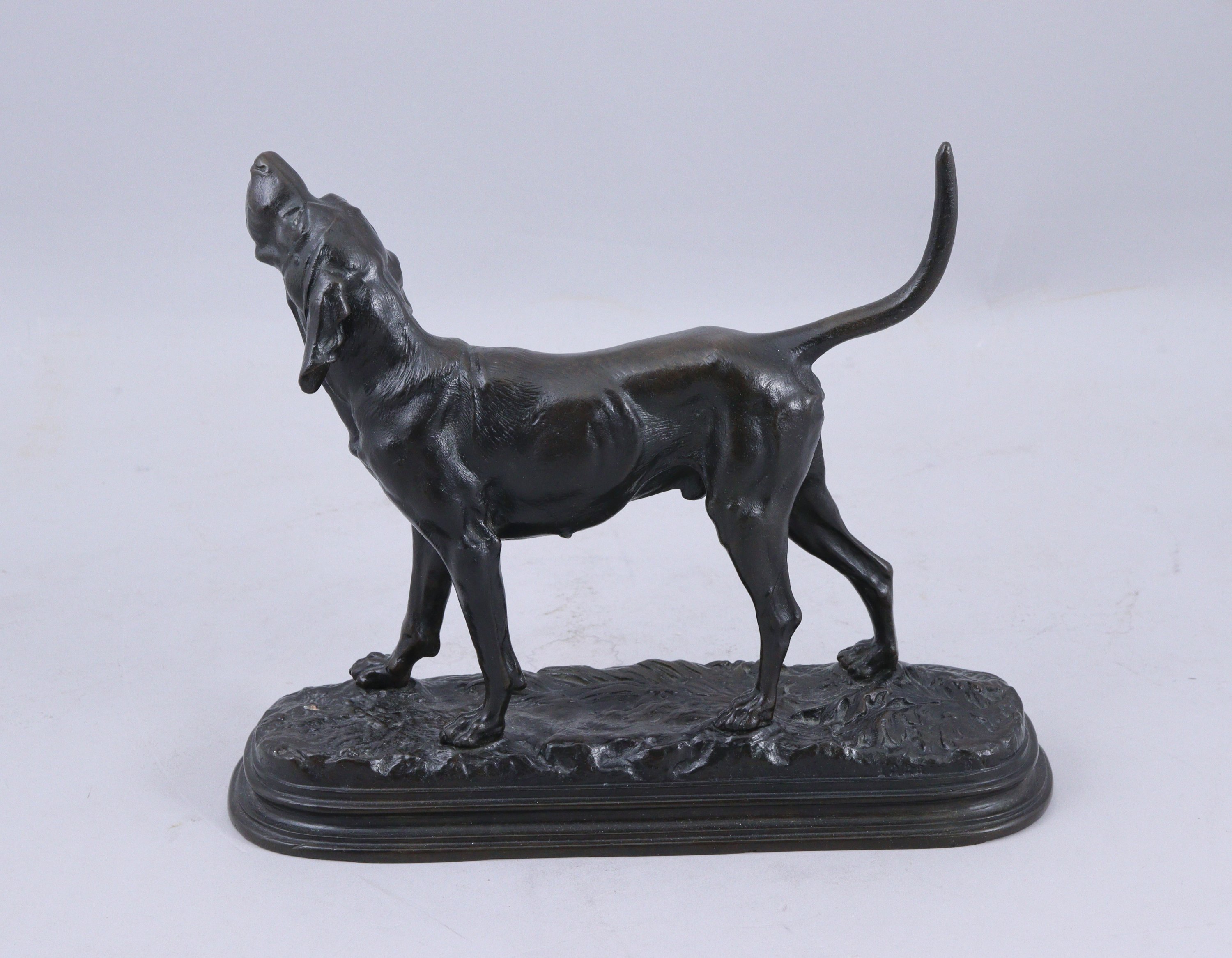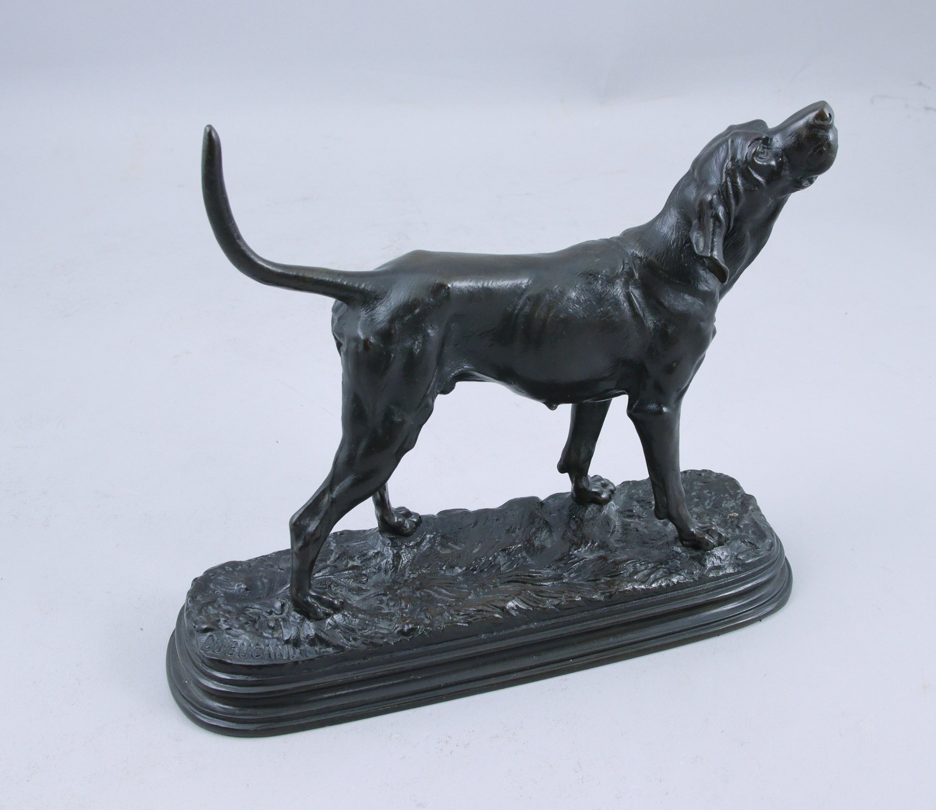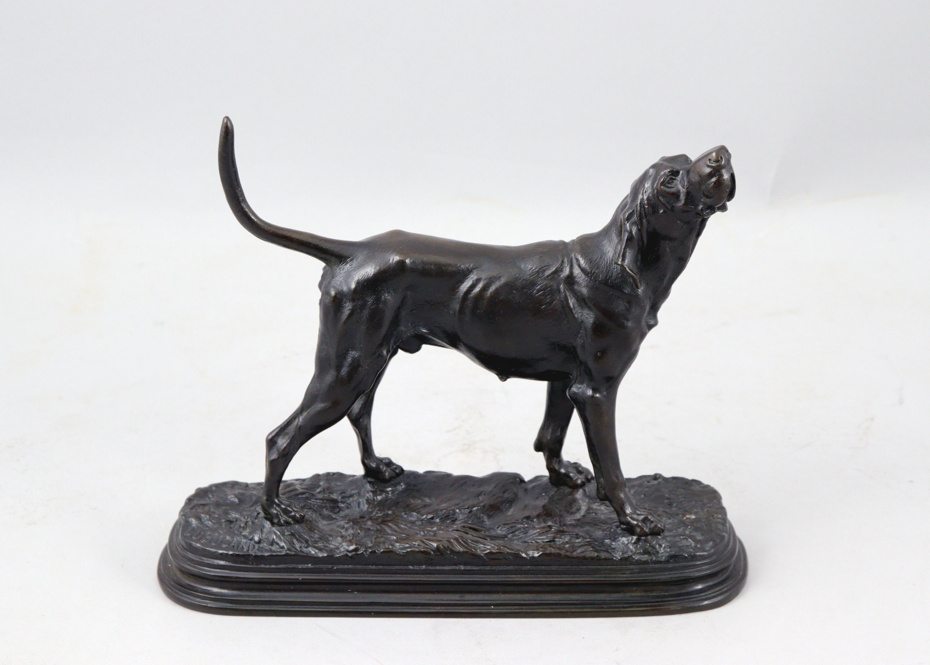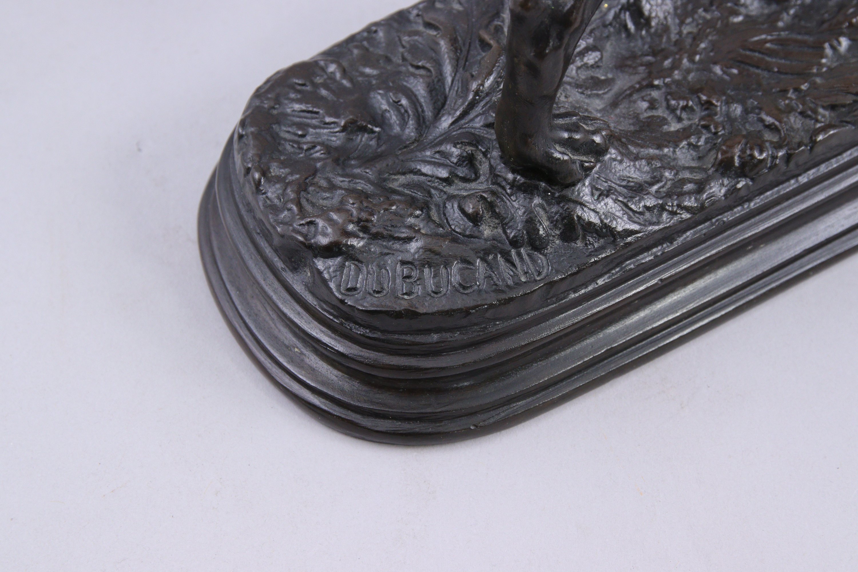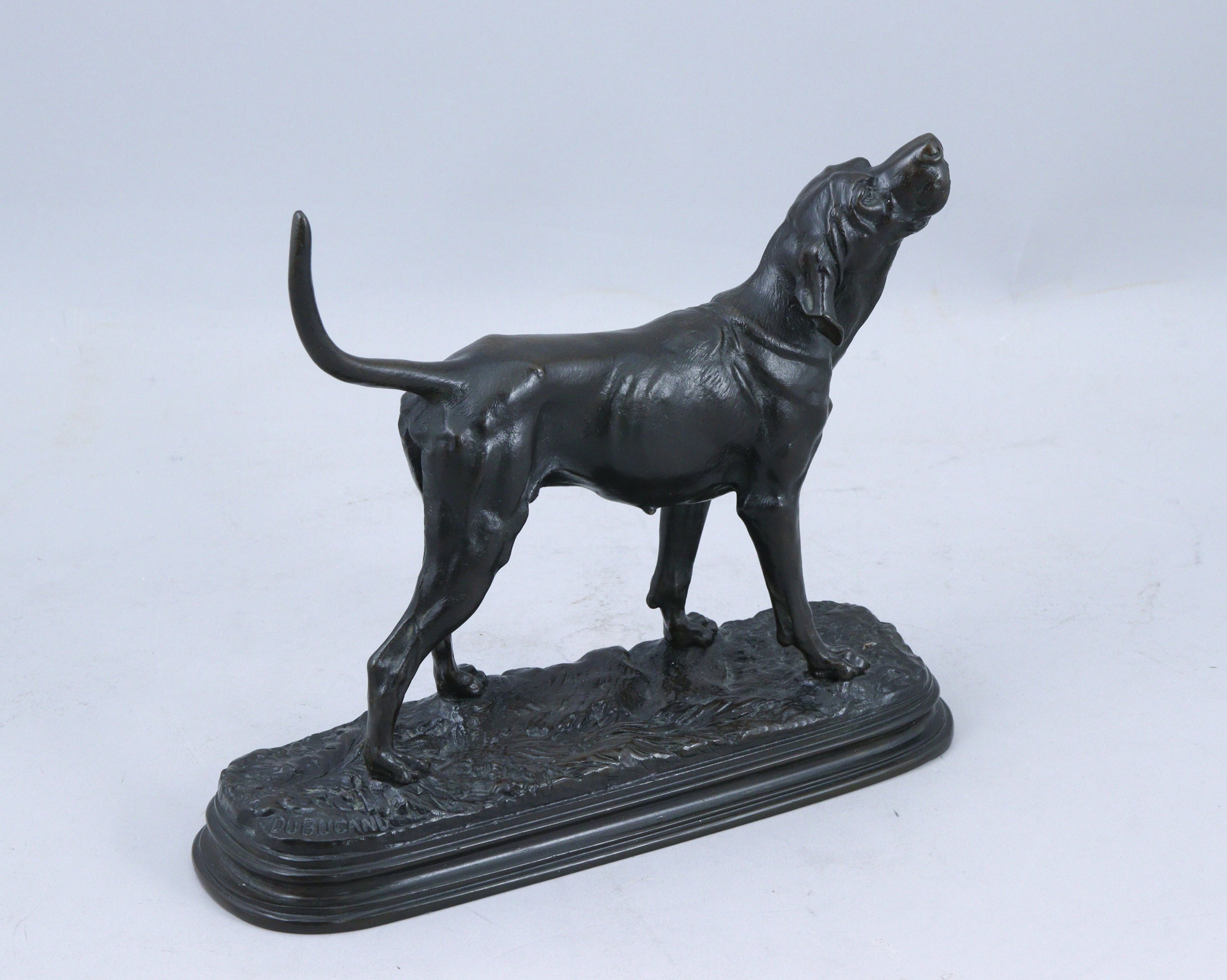 d'après Alfred DUBUCAND (1828-1894) Chien de chasse humantBronze patiné.Haut. 20,6,...