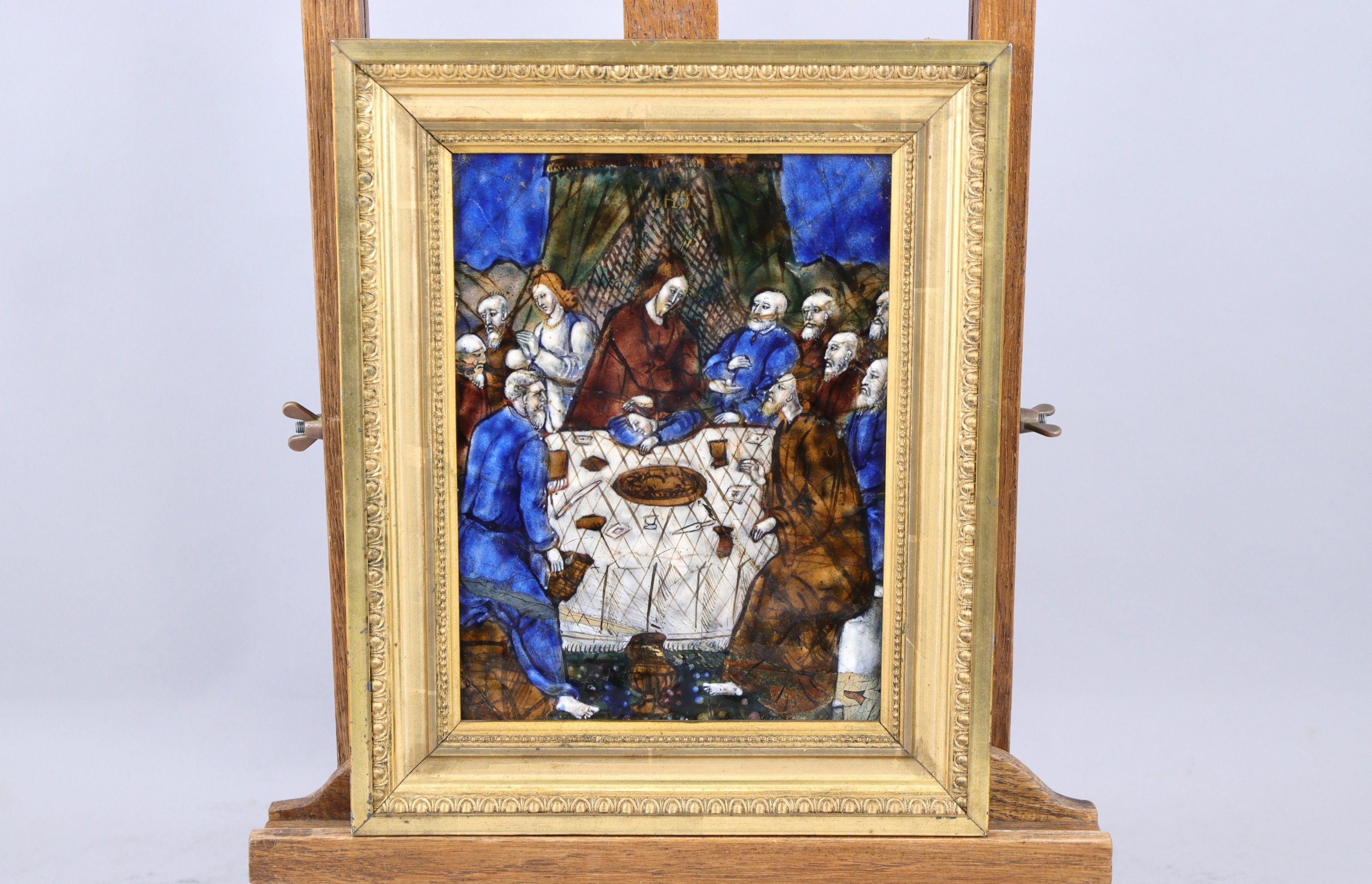 PLAQUE EN ÉMAIL PEINT POLYCHROME représentant la Cène. Contre-émail saumoné foncé.