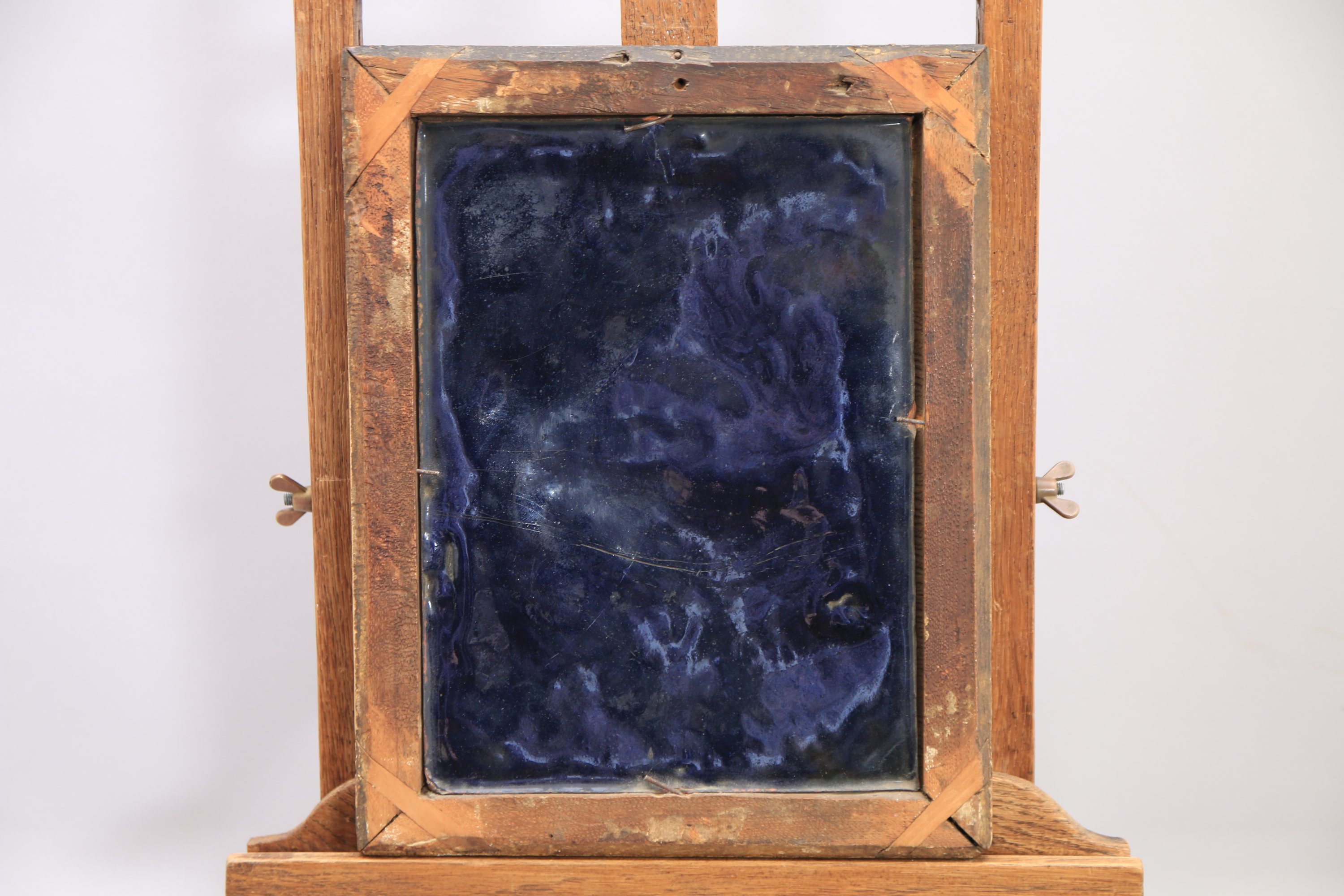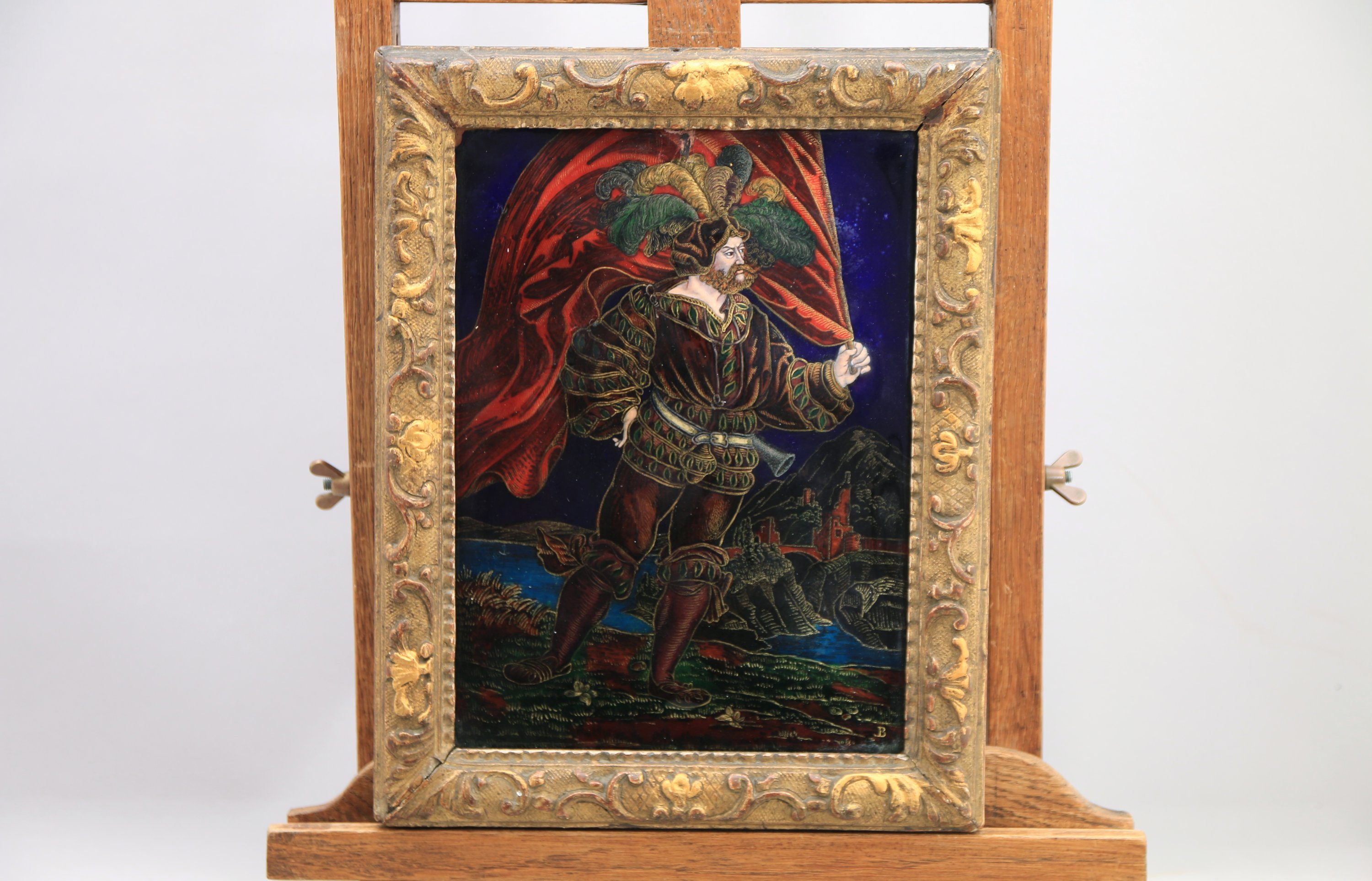 Louis BOUDERY (1859-1901) probablement, PLAQUE EN ÉMAIL PEINT POLYCHROME représentant un homme barbu en costume Renaissance tenant un étendard sur fond de paysage. Monogrammée B. Contre-émail bleu nuit.
